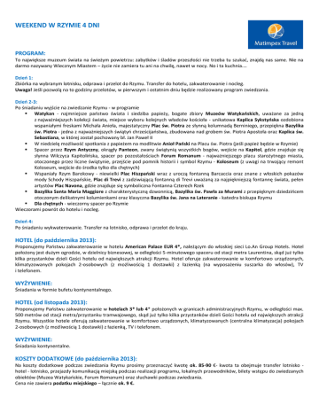 WEEKEND W RZYMIE 4 DNI PROGRAM: To największe muzeum świata na świeżym powietrzu: zabytków i śladów przeszłości nie trzeba tu szukać, znajdą nas same. Nie na darmo nazywany Wiecznym Miastem – życie nie zamiera tu ani na chwilę, nawet w nocy. No i ta kuchnia…. Dzień 1: Zbiórka na wybranym lotnisku, odprawa i przelot do Rzymu. Transfer do hotelu, zakwaterowanie i nocleg. Uwaga! Jeśli pozwolą na to godziny przelotów, w pierwszym i ostatnim dniu będzie realizowany program zwiedzania. Dzień 2-3: Po śniadaniu wyjście na zwiedzanie Rzymu - w programie Watykan - najmniejsze państwo świata i siedziba papieży, bogate zbiory Muzeów Watykańskich, uważane za jedną z najważniejszych kolekcji świata, miejsce wyboru kolejnych władców kościoła - unikatowa Kaplica Sykstyńska ozdobiona wspaniałymi freskami Michała Anioła, majestatyczny Plac św. Piotra ze słynną kolumnadą Berniniego, przepiękna Bazylika św. Piotra - jedna z najważniejszych świątyń chrześcijaństwa, zbudowana nad grobem św. Piotra Apostoła oraz Kaplica św. Sebastiana, w której został pochowany bł. Jan Paweł II W niedzielę możliwość spotkania z papieżem na modlitwie Anioł Pański na Placu św. Piotra (jeśli papież będzie w Rzymie) Spacer przez Rzym Antyczny, okrągły Panteon, zwany świątynią wszystkich bogów, wejście na Kapitol, gdzie znajduje się słynna Wilczyca Kapitolińska, spacer po pozostałościach Forum Romanum - najważniejszego placu starożytnego miasta, otoczonego przez liczne świątynie, przejście pod pomnik historii i symbol Rzymu - Koloseum (z uwagi na trwający remont Koloseum, wejście do środka tylko dla chętnych) Wspaniały Rzym Barokowy - niewielki Plac Hiszpański wraz z uroczą fontanną Barcaccia oraz znane z włoskich pokazów mody Schody Hiszpańskie, Plac di Trevi z zadziwiającą fontanną di Trevi uważaną za najpiękniejszą fontannę świata, pełen artystów Plac Navona, gdzie znajduje się symboliczna Fontanna Czterech Rzek Bazylika Santa Maria Maggiore z charakterystyczną dzwonnicą, Bazylika św. Pawła za Murami z przepięknym dziedzińcem otoczonym delikatnymi kolumienkami oraz klasyczna Bazylika św. Jana na Lateranie - katedra biskupa Rzymu Dla chętnych - wieczorny spacer po Rzymie Wieczorami powrót do hotelu i nocleg. Dzień 4: Po śniadaniu wykwaterowanie. Transfer na lotnisko, odprawa i przelot do kraju. HOTEL (do października 2013): Proponujemy Państwu zakwaterowanie w hotelu American Palace EUR 4*, należącym do włoskiej sieci Lo.An Group Hotels. Hotel położony jest dużym ogrodzie, w dzielnicy biznesowej, w odległości 5-minutowego spaceru od stacji metra Laurentina, skąd już tylko kilka przystanków dzieli Gości hotelu od największych atrakcji Rzymu. Hotel oferuje zakwaterowanie w komfortowo urządzonych, klimatyzowanych pokojach 2-osobowych (z możliwością 1 dostawki) z łazienką (na wyposażeniu suszarka do włosów), TV i telefonem. WYŻYWIENIE: Śniadania w formie bufetu kontynentalnego. HOTEL (od listopada 2013): Proponujemy Państwu zakwaterowanie w hotelach 3* lub 4* położonych w granicach administracyjnych Rzymu, w odległości max. 500 metrów od stacji metra/przystanku tramwajowego, skąd już tylko kilka przystanków dzieli Gości hotelu od największych atrakcji Rzymu. Wszystkie hotele oferują zakwaterowanie w komfortowo urządzonych, klimatyzowanych (centralna klimatyzacja) pokojach 2-osobowych (z możliwością 1 dostawki) z łazienką, TV i telefonem. WYŻYWIENIE: Śniadania kontynentalne. KOSZTY DODATKOWE (do października 2013): Na koszty dodatkowe podczas zwiedzania Rzymu prosimy przeznaczyć kwotę ok. 85-90 €- kwota ta obejmuje transfer lotnisko hotel - lotnisko, przejazdy komunikacją miejską podczas realizacji programu, lokalnych przewodników, bilety wstępu do zwiedzanych obiektów (Muzea Watykańskie, Forum Romanum) oraz słuchawki podczas zwiedzania. Cena nie zawiera podatku miejskiego – łącznie ok. 9 €. KOSZTY DODATKOWE (do października 2013): Orientacyjny koszt realizacji programu zwiedzania to ok. 85-90 €- kwota ta obejmuje przejazdy komunikacją miejską podczas realizacji programu, bilety wstępu do zwiedzanych obiektów wraz z kosztami ich rezerwacji (Muzea Watykańskie, Forum Romanum), lokalnych przewodników oraz słuchawki podczas zwiedzania. Cena nie zawiera podatku miejskiego – łącznie ok. 9 €. WYBIERZ SWÓJ BAGAŻ! (od listopada 2013): Cena wycieczki zawiera jedynie bagaż podręczny o wadze 10 kg i wymiarach 42x32x25 cm (bagaż mieszczący się pod siedzenie fotela lotniczego). Istnieje również możliwość dokupienia bagażu głównego o wadze 32 kg – dopłata 170 zł/os. Uwaga! Dodatkowy bagaż przypisany jest do konkretnej osoby! Prosimy o wybór bagażu w momencie dokonywania rezerwacji, gdyż w przypadku wykupienia bagażu w późniejszym terminie, jego cena będzie wyższa o 50 zł. Przypominamy, że w bagażu podręcznym nie mogą znajdować się płyny ani żele czy fluidy w opakowaniach większych niż 100 ml oraz ostre narzędzia (noże, metalowe pilniczki do paznokci, nożyczki, itp.). Szczegóły na www.matimpex.pl w zakładce Linie Lotnicze. UWAGI: Kolejność zwiedzania może ulec zmianie, jednak wszystkie punkty programu zostaną zrealizowane Pilot nie oprowadza grupy po wnętrzach muzeów (zwiedzanie muzeów z przewodnikiem lokalnym) Spotkanie z pilotem nastąpi na lotnisku w kraju lub w Rzymie po przylocie Transfery lotniskowe realizowane są busem/autokarem, a przejazdy po mieście komunikacją miejską W przypadku wylotu we wczesnych godzinach porannych, zamiast śniadania mogą zostać przygotowane pakiety śniadaniowe ŚWIADCZENIA (do października 2013): Przelot na wybranej trasie Opłaty lotniskowe Bagaż podręczny o wadze 10 kg i wymiarach 42x32x25 cm Bagaż główny o wadze 32 kg 3 noclegi w hotelu 4* 3 śniadania Pokoje 2-osobowe z łazienkami Opieka pilota Ubezpieczenie podstawowe Signal Iduna (KL, NNW, CHP i 