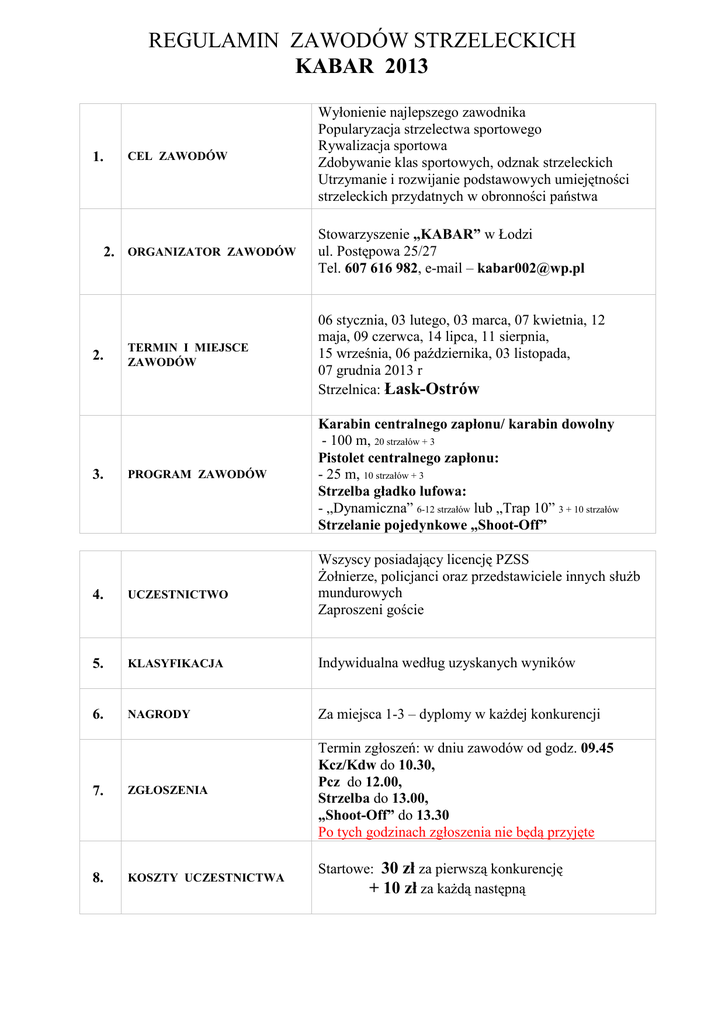 REGULAMIN ZAWODÓW STRZELECKICH KABAR 2013 1. CEL ZAWODÓW 2. ORGANIZATOR ZAWODÓW 2. 3. Wyłonienie najlepszego zawodnika Popularyzacja strzelectwa sportowego Rywalizacja sportowa Zdobywanie klas sportowych, odznak strzeleckich Utrzymanie i rozwijanie podstawowych umiejętności strzeleckich przydatnych w obronności państwa Stowarzyszenie „KABAR” w Łodzi ul. Postępowa 25/27 Tel. 607 616 982, e-mail – [email protected] TERMIN I MIEJSCE ZAWODÓW 06 stycznia, 03 lutego, 03 marca, 07 kwietnia, 12 maja, 09 czerwca, 14 lipca, 11 sierpnia, 15 września, 06 października, 03 listopada, 07 grudnia 2013 r Strzelnica: Łask-Ostrów PROGRAM ZAWODÓW Karabin centralnego zapłonu/ karabin dowolny - 100 m, 20 strzałów + 3 Pistolet centralnego zapłonu: - 25 m, 10 strzałów + 3 Strzelba gładko lufowa: - „Dynamiczna” 6-12 strzałów lub „Trap 10” 3 + 10 strzałów Strzelanie pojedynkowe „Shoot-Off” Wszyscy posiadający licencję PZSS Żołnierze, policjanci oraz przedstawiciele innych służb mundurowych Zaproszeni goście 4. UCZESTNICTWO 5. KLASYFIKACJA Indywidualna według uzyskanych wyników 6. NAGRODY Za miejsca 1-3 – dyplomy w każdej konkurencji 7. ZGŁOSZENIA Termin zgłoszeń: w dniu zawodów od godz. 09.45 Kcz/Kdw do 10.30, Pcz do 12.00, Strzelba do 13.00, „Shoot-Off” do 13.30 Po tych godzinach zgłoszenia nie będą przyjęte 8. KOSZTY UCZESTNICTWA Startowe: 30 zł za pierwszą konkurencję + 10 zł za każdą następną 9. SPRAWY RÓŻNE Broń i amunicja własna Organizator zapewni broń i amunicję osobom nieposiadającym własnej broni (zwrot kosztów amunicji) Zawody w kalendarzu ŁZSS Zawody odbędą się bez względu na pogodę. Regulamin konkurencji: Karabin centralnego zapłonu: Odległość do tarcz 100m, 20 strzałów - strzelanie dokładne w ograniczonym czasie. 1. Broń Karabin samopowtarzalny lub powtarzalny w kalibrze od 5,56 mm (.222) do 11,43 mm (.45), wyłącznie centralnego zapłonu. Karabiny posiadające wyłącznie mechaniczne przyrządy celownicze, nie ma ograniczeń co do siły spustu (jednak musi on bezpiecznie funkcjonować), rodzaju kolby, kompensator max fi 26 dł.90mm. Karabin dowolny: Karabin samopowtarzalny lub powtarzalny w kalibrze od 5,56 mm (.22) do 11,43 mm (.45) (dowolny rodzaj amunicji i ładowania). Karabiny posiadające dowolne przyrządy celownicze (kolimator, luneta z dowolnym powiększeniem), nie ma ograniczeń co do siły spustu (jednak musi on bezpiecznie funkcjonować), rodzaju kolby i kompensatorów. W trakcie trwania konkurencji nie wolno zmieniać broni ani jej zasadniczych części. 2. Amunicja 23 sztuki amunicji w kalibrze według punktu 1. Amunicja ładowana 1x3 szt. (strzały próbne) oraz 2x10 szt. 3. Sprzęt dodatkowy Nie wolno używać optycznych urządzeń obserwacyjnych. 4. Przebieg konkurencji i warunki strzelania a) odległość 100 m b) tarcza Psz c) ilość strzałów 3 + 2 x 10 d) pozycja strzelecka 10 stojąc + 10 klęcząc, nie wolno używać pasa nośnego itp. e) czas strzelania 1 min 30 s (3 strzały próbne), 10 min (strzały oceniane) 5. Komendy Wszelkie komendy w trakcie trwania konkurencji wydaje sędzia nadzorujący jej przebieg Komendy występujące na linii ognia są następujące: b) ŁADUJ /zawodnik ładuje amunicję do magazynka, podłącza magazynek do broni i przeładowuje/ c) START /można strzelać/ d) STOP /przerywamy strzelanie, zdejmujemy palec z języka spustowego/ e) ROZŁADUJ DO PRZEJRZENIA BROŃ/ odłączamy magazynek, pokazujemy sędziemu pusty magazynek oraz pustą komorę nabojową, oddajemy strzał kontrolny, chowamy lub odkładamy broń i schodzimy ze stanowiska/ W przypadku gdy zawodnik ukończy konkurencję przed upływem przewidzianego czasu, odłącza magazynek i czeka na kontrolę rozładowania broni. 6. Strzały próbne. 3 strzały z postawy klęcząc lub stojąc 7. Punktacja i wyniki Wynikiem jest suma wartości 20 przestrzelin w tarczy. Ocena tarczy odbywa się w obecności zawodnika. 8. Bezpieczeństwo Podczas trwania konkurencji należy zwrócić szczególną uwagę na: a) przenoszenie broni na terenie strzelnicy tylko lufą do góry lub do dołu, zabezpieczoną, bez podłączonego magazynka; b) ładowanie broni tylko na stanowisku strzeleckim i na komendę sędziego; c) zakaz jakichkolwiek nieregulaminowych manewrów załadowaną bronią; d) zachowanie bezpiecznego kierunku wylotu lufy broni; e) niewysuwanie żadnej części ciała przed płaszczyznę wylotu lufy w momencie oddawania strzału; f) kładzenie palca na języku spustowym tylko po skierowaniu broni w stronę celu; g) zabrania się wychodzenia zawodnikom lub innym osobom za linię ognia w czasie trwania konkurencji; h) zabrania się ładowania do magazynka więcej niż 10 szt. amunicji Wyznacza się na strzelnicy „Strefę Bezpieczeństwa”, w której zawodnicy mogą składać się do strzału, czyścić, rozbierać, manipulować, wymieniać magazynki, dobywać z futerałów, przygotowywać się do strzelania, itp. Broń w „Strefie Bezpieczeństwa” nie może być załadowana. W „Strefie bezpieczeństwa” nie można wyjmować żadnego rodzaju amunicji, nawet ćwiczebnej. Manipulowanie bronią w innych miejscach jest zabronione. Poruszanie się z karabinami na strzelnicy możliwe jest tylko z lufą do góry lub do dołu. Dozwolone jest dobywanie karabinu z futerału i przygotowywanie się do strzelania na stanowisku ogniowym. 9. Kary Od końcowego wyniku odjęte zostaną 2 punkty: a) za każdy strzał oddany po podpowiedzi udzielonej przez inną osobę; b) za każdy strzał oddany ponad przewidzianą w konkurencji ilość, przy czym odejmowana jest wartość najlepszej przestrzeliny uzyskanej w ostrzelanej tarczy; c) za każdy strzał oddany po komendzie STOP, jeżeli nie stanowił zagrożenia bezpieczeństwa. Odejmowana jest wartość najlepszej przestrzeliny uzyskanej w ostrzelanej tarczy; d) przy pierwszym przewinieniu polegającym na stosowaniu podpórki w trakcie konkurencji. Następną ka