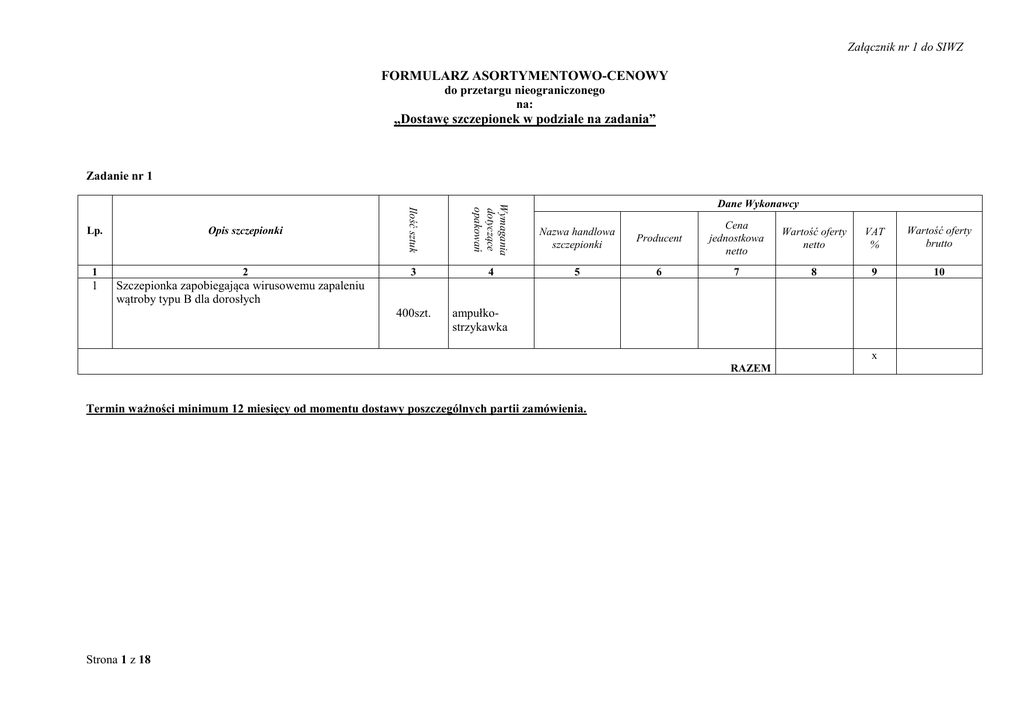 Załącznik nr 1 do SIWZ FORMULARZ ASORTYMENTOWO-CENOWY do przetargu nieograniczonego na: „Dostawę szczepionek w podziale na zadania” Zadanie nr 1 Wymagania dotyczące opakowań 1 1 Opis szczepionki Ilość sztuk Lp. 2 3 4 Dane Wykonawcy Nazwa handlowa szczepionki Producent Cena jednostkowa netto Wartość oferty netto VAT % Wartość oferty brutto 5 6 7 8 9 10 Szczepionka zapobiegająca wirusowemu zapaleniu wątroby typu B dla dorosłych 400szt. ampułkostrzykawka x RAZEM Termin ważności minimum 12 miesięcy od momentu dostawy poszczególnych partii zamówienia. Strona 1 z 18 Zadanie nr 2 Wymagania dotyczące opakowań 1 1 Nazwa handlowa szczepionki Producent Cena jednostkowa netto Wartość oferty netto VAT % Wartość oferty brutto 4 5 6 7 8 9 10 Opis szczepionki Ilość sztuk Lp. 2 3 60 szt. proszek do sporządzania zawiesiny doustnej+doustny aplikator z rozpuszczalnikiem. Szczepionka przeciw rotawirusowi, żywa, doustna, pięcioważna. Stosowana do czynnego uodporniania niemowląt w wieku od 6-tygodnia w celu zapobiegania wystąpieniu zapalenia żołądka i jelit na tle zakażeń rotawirusami. Dane Wykonawcy x RAZEM Termin ważności minimum 12 miesięcy od momentu dostawy poszczególnych partii zamówienia. Strona 2 z 18 Zadanie nr 3 Opis szczepionki Ilość sztuk Wymagania dotyczące opakowań 1 2 3 4 1 Szczepionka przeciwko błonicy, tężcowi, krztuścowi (acelularna), wirusowemu zapaleniu wątroby typ B (rekombinowana) polio typ 1,2,3 i Haemophilus influenzae typ B. Stosowane u dzieci – szczepienia pierwotne i uzupełniające. Lp. Dane Wykonawcy Nazwa handlowa szczepionki Producent Cena jednostkowa netto Wartość oferty netto VAT % Wartość oferty brutto 5 6 7 8 9 10 120 szt. ampułkostrzykawka 0,5 ml RAZEM Termin ważności minimum 12 miesięcy od momentu dostawy poszczególnych partii zamówienia. Strona 3 z 18 Zadanie nr 4 Opis szczepionki Ilość sztuk Wymagania dotyczące opakowań 1 2 3 4 1 Szczepionka pneumokokowa, poliwalentna, inaktywowana, zawiera oczyszczone polisacharydy otoczkowe Steptococcus pneumoninae. Zawiesina do wstrzyknięć 0,5 ml. Uodpornienie czynne u niemowląt i małych dzieci, zapobieganie chorobą inwazyjnym wywołanym przez Steptococcus pneumoninae. Lp. 50 szt. Dane Wykonawcy Nazwa handlowa szczepionki Producent Cena jednostkowa netto Wartość oferty netto VAT % Wartość oferty brutto 5 6 7 8 9 10 fiolka 0,5 ml x RAZEM Termin ważności minimum 12 miesięcy od momentu dostawy poszczególnych partii zamówienia. Strona 4 z 18 Zadanie nr 5 Opis szczepionki Ilość sztuk Wymagania dotyczące opakowań 1 2 3 4 1 Szczepionka skoniugowana, polisacharydowa 13-walentna, adsorbowana, przeciwko pneumokokom. Czynne uodpornienie przeciwko chorobie inwazyjnej pneumokokowej u ludzi od 6-go tygodnia do 5-go roku życia. 60 szt. Lp. Dane Wykonawcy Nazwa handlowa szczepionki Producent Cena jednostkowa netto Wartość oferty netto VAT % Wartość oferty brutto 5 6 7 8 9 10 ampułkostrzykawka 0,5 ml x RAZEM Termin ważności minimum 12 miesięcy od momentu dostawy poszczególnych partii zamówienia. Strona 5 z 18 Zadanie nr 6 Wymagania dotyczące opakowań 1 1 Opis szczepionki Ilość sztuk Lp. 2 3 4 Skojarzona szczepionka przeciwko błonicy, tężcowi, krztuścowi, polio i Haemophilus influenzae typu B zawierająca: toksoid błoniczy, toksoid tężcowy, toksoid 150 szt. krztuścowy (hemaglutymina włókienkowa), inaktywowane wirusy polio typu 1,2,3 oraz oczyszczony polisacharyd otoczkowy Haemophilus influenzae typu B w postaci ampułkostrzykawki z igłą (zawiesina DTPa-IPV) + fiolka z liofilizatem + 2 igły. Dane Wykonawcy Nazwa handlowa szczepionki Producent Cena jednostkowa netto Wartość oferty netto VAT % Wartość oferty brutto 5 6 7 8 9 10 ampułkostrzykawka z igłą (zawiesina DTPa-IPV) + fiolka z liofilizatem + 2 igły x RAZEM Termin ważności minimum 12 miesięcy od momentu dostawy poszczególnych partii zamówienia. Strona 6 z 18 Zadanie nr 7 Wymagania dotyczące opakowań 1 1 Opis szczepionki Ilość sztuk Lp. 2 3 4 Dane Wykonawcy Nazwa handlowa szczepionki Producent Cena jednostkowa netto Wartość oferty netto VAT % Wartość oferty brutto 5 6 7 8 9 10 Konwencjonalna, poliwalentna, inaktywowana szczepionka przeciw grypie, zawierająca rozszczepiony wirion. Jedna dawka szczepionki (0,5 ml) zawiera po 15 mg 200 szt. ampułkohemaglutyniny każdego z rekomendowanych na dany sezon strzykawka epidemiologiczny wirusy typu A i B. 0,5 ml x RAZEM Termin ważności minimum …… miesięcy od momentu dostawy poszczególnych partii zamówienia. Strona 7 z 18 Zadanie nr 8 2 3 Szczepionka do czynnego uodpornienia przeciw ospie wietrznej osób zdrowych (od 9 miesiąca życia) oraz osób szczególnie podatnych na zakażenia z grup wysokiego ryzyka. Szczepionka wskazana do zapobiegania wystąpienia półpaśca i nerwobólu w przebiegu półpaśca u osób w wieku od 50 lat 20 szt. Wymagania dotyczące opakowań 1 1 Opis szczepionki Ilość sztuk Lp. Dane Wykonawcy Nazwa handlowa szczepionki Producent Cena jednostkowa netto Wartość oferty netto VAT % Wartość oferty brutto 4 5 6 7 8 9 10 fiolka (proszek)+ ampułkostrzykawka 0,5 ml rozpuszczalnika do przygotowania roztworu do wstrzyknięć x RAZEM Termin ważności minimum 12 miesięcy od momentu dostawy poszczególnych partii zamówienia. Strona 8 z 18 Zadanie nr 9 Opis szczepionki Ilość sztuk Wymagania dotyczące opakowań 1 2 3 4 1 Szczepionka przeciwko błonicy, tężcowi, krztuścowi, poli i haemophilus influenzae typu B zawierająca: toksoid błoniczy, toksoid tężcowy, toksoid krztuścowy (PT), hemaglutynę włókienkową (FHA), pertaktynę (69KdaOMP), inaktywowany wirus polio typ 1, inaktywowany wirus polio typ 2, inaktywowany wirus polio typ 3, oczyszczony polisacharyd otoczkowy Hib. Występująca w postaci zawiesiny i liofilizatu do sporządzania zawiesiny do wstrzyknięć domięśniowych. Przeznaczona dla dzieci od 2 miesiąca życia w schemacie szczepienia pierwotnego – 3 dawki i dawka uzu
