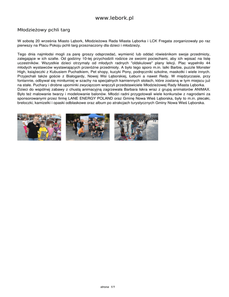 www.lebork.pl Młodzieżowy pchli targ W sobotę 20 września Miasto Lębork, Młodzieżowa Rada Miasta Lęborka i LCK Fregata zorganizowały po raz pierwszy na Placu Pokoju pchli targ przeznaczony dla dzieci i młodzieży. Tego dnia najmłodsi mogli za parę groszy odsprzedać, wymienić lub oddać rówieśnikom swoje przedmioty, zalegające w ich szafie. Od godziny 10-tej przychodzili rodzice ze swoimi pociechami, aby ich wpisać na listę uczestników. Wszystkie dzieci otrzymały od młodych radnych "oldskulowe" plany lekcji. Plac wypełniło 44 młodych wystawców wystawiających przeróżne przedmioty. A było tego sporo m.in. lalki Barbie, puzzle Monster High, książeczki z Kubusiem Puchatkiem, Pet shopy, kucyki Pony, podręczniki szkolne, maskotki i wiele innych. Przyjechali także goście z Białogardy, Nowej Wsi Lęborskiej, Łebuni a nawet Redy. W międzyczasie, przy fontannie, odbywał się miniturniej w szachy na specjalnych kamiennych stołach, które zostaną w tym miejscu już na stałe. Puchary i drobne upominki zwycięzcom wręczyli przedstawiciele Młodzieżowej Rady Miasta Lęborka. Dzieci do wspólnej zabawy z chustą animacyjną zagrzewała Barbara Iskra wraz z grupą animatorów ANIMAX. Było też malowanie twarzy i modelowanie balonów. Młodzi radni przygotowali wiele konkursów z nagrodami za sponsorowanymi przez firmę LANE ENERGY POLAND oraz Gminę Nowa Wieś Lęborska, były to m.in. plecaki, breloczki, kamizelki i opaski odblaskowe oraz album po atrakcjach turystycznych Gminy Nowa Wieś Lęborska. strona 1/1 Powered by TCPDF (www.tcpdf.org)