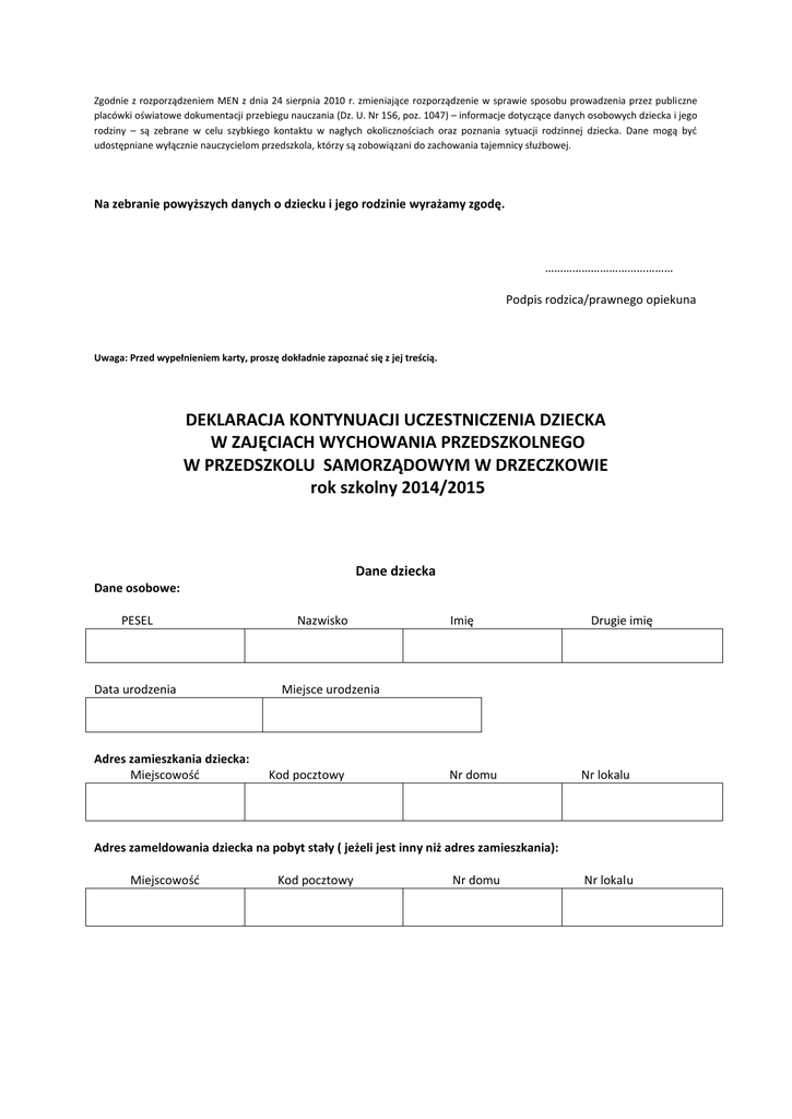 Zgodnie z rozporządzeniem MEN z dnia 24 sierpnia 2010 r. zmieniające rozporządzenie w sprawie sposobu prowadzenia przez publiczne placówki oświatowe dokumentacji przebiegu nauczania (Dz. U. Nr 156, poz. 1047) – informacje dotyczące danych osobowych dziecka i jego rodziny – są zebrane w celu szybkiego kontaktu w nagłych okolicznościach oraz poznania sytuacji rodzinnej dziecka. Dane mogą być udostępniane wyłącznie nauczycielom przedszkola, którzy są zobowiązani do zachowania tajemnicy służbowej. Na zebranie powyższych danych o dziecku i jego rodzinie wyrażamy zgodę. …………………………………… Podpis rodzica/prawnego opiekuna Uwaga: Przed wypełnieniem karty, proszę dokładnie zapoznać się z jej treścią. DEKLARACJA KONTYNUACJI UCZESTNICZENIA DZIECKA W ZAJĘCIACH WYCHOWANIA PRZEDSZKOLNEGO W PRZEDSZKOLU SAMORZĄDOWYM W DRZECZKOWIE rok szkolny 2014/2015 Dane dziecka Dane osobowe: PESEL Data urodzenia Adres zamieszkania dziecka: Miejscowość Nazwisko Imię Drugie imię Miejsce urodzenia Kod pocztowy Nr domu Nr lokalu Adres zameldowania dziecka na pobyt stały ( jeżeli jest inny niż adres zamieszkania): Miejscowość Kod pocztowy Nr domu Nr lokalu Informacje dodatkowe: Dziecko rodzica/opiekuna samotnie je wychowującego ( wpisać „TAK” lub „NIE”) Dziecko rodziców/opiekunów niepełnosprawnych ( wpisać „TAK” lub „NIE”) Dziecko posiada orzeczenie o niepełnosprawności ( wpisać „TAK” lub „NIE”) Dziecko posiada orzeczenie do kształcenia specjalnego ( wpisać „TAK” lub „NIE”) Liczba dzieci w rodzinie ( wpisać liczbę ) Matka dziecka pracuje ( wpisać „TAK” lub „NIE”) Dane rodziców / prawnych opiekunów: Dane matki /prawnej opiekunki Imię Nazwisko Adres zamieszkania matki /prawnej opiekunki Miejscowość Kod pocztowy Dane ojca / prawnego opiekuna Imię Inne telefony kontaktowe: Nr domu Nazwisko Adres zamieszkania ojca / prawnego opiekuna Miejscowość Kod pocztowy Zakład pracy matki /prawnej opiekunki Nazwa i adres zakładu pracy Telefon kontaktowy Nr lokalu Telefon kontaktowy Nr domu Nr lokalu Zakład pracy ojca /prawnego opiekuna Nazwa i adres zakładu pracy Inne osoby dorosłe upoważnione do systematycznego odbierania dziecka z przedszkola lub przystanku autobusowego: Imię Nazwisko PESEL Stopień pokrewieństwa Oświadczamy, że bierzemy na siebie pełną odpowiedzialność prawną za bezpieczeństwo dziecka od chwili odebrania go z placówki lub przystanku autobusowego przez wskazaną powyżej, upoważnioną przez nas osobę. ................................................................. podpisy rodziców ZOBOWIĄZANIE RODZICÓW / OPIEKUNÓW DZIECKA W przypadku przyjęcia dziecka do placówki zobowiązuję się do: przestrzegania postanowień statutu przedszkola podawania do wiadomości przedszkola wszelkich zmian w podanych wyżej informacjach przyprowadzania i odbierania dziecka z przedszkola osobiście lub przez osobę dorosłą, do tego upoważnioną przyprowadzania do przedszkola zdrowego dziecka uczestniczenia w zebraniach rodziców. DODATKOWE WAŻNE INFORMACJE O DZIECKU (stałe choroby, wady rozwojowe, alergie itp.): .................................................................................................................................................................................................... ………………………………………………………………………………………………………………………………………………. Oświadczam/y, iż dane w niniejszej karcie są zgodne ze stanem faktycznym i jestem/śmy świadom(a)/i odpowiedzialności karnej za zeznanie nieprawdy lub zatajenie prawdy. Zobowiązuję/emy się do informowania dyrektora przedszkola o każdorazowej zmianie powyższych danych. Wyrażam zgodę na gromadzenie, przetwarzanie i udostępnianie danych osobowych zawartych w karcie, w systemach informatycznych przedszkola oraz organów uprawnionych do nadzoru nad jednostkami oświatowymi. Przetwarzanie danych odbywać się będzie zgodnie z ustawą o ochronie danych osobowych (tekst jednolity Dz. U. z 2002 r. Nr 101, poz. 926 z późniejszymi zmianami). Wyrażam zgodę na udzielanie mojemu dziecku pierwszej pomocy przez personel pedagogiczny i niepedagogiczny przedszkola oraz udzielenie dziecku natychmiastowej pomocy i zadbanie o jego życie – w nagłych wypadkach. Tak*, Nie*. Wyrażam zgodę na publikację zdjęć dziecka z imprez i uroczystości przedszkolnych na stronie internetowej przedszkola oraz Urzędu Miasta i Gminy Osieczna. Wyrażam zgodę na pomiary wagi i wzrostu u mojego dziecka podczas pobytu w przedszkolu pielęgniarek z NZO NZOZ Pielęgniarskiego Ośrodka Medycyny Środowiskowo-Rodzinnej i Szkolnej SALUIS s.c, 64-113 Osieczna, ul. Kopernika 8a. Wyrażam zgodę na wyjścia mojego dziecka poza teren przedszkola oraz jego udział w wycieczkach organizowanych przez przedszkole. Tak*, Nie*. * (niepotrzebne skreślić) Data i podpis matki/opiekunki i ojca/opiekuna (czytelny) DEKLARUJĘ CHĘĆ, NIE DEKLARUJĘ CHĘCI UCZESTNICTWA MOJEGO DZIECKA W ZAJĘCIACH Z RELIGII (niepotrzebne skreślić) ………………………………………….. podpis rodziców Data przyjęcia deklaracji (wypełnia przedszkole)