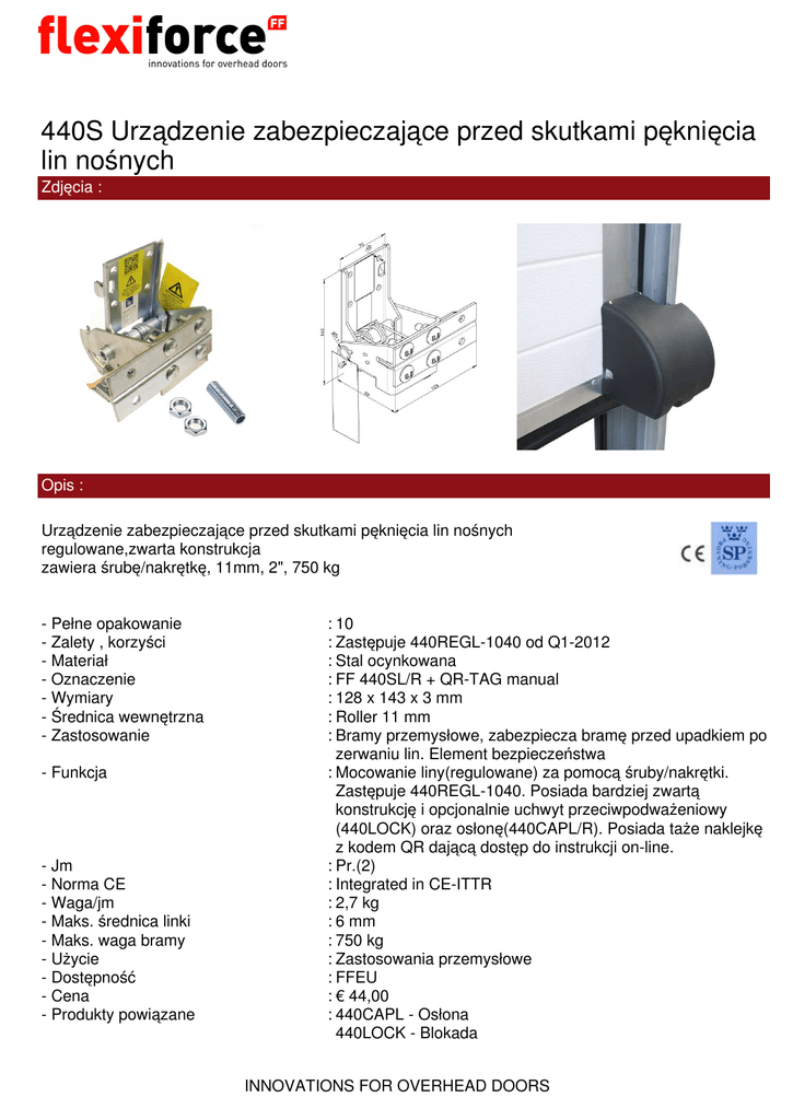 440S Urządzenie zabezpieczające przed skutkami pęknięcia lin nośnych Zdjęcia : Opis : Urządzenie zabezpieczające przed skutkami pęknięcia lin nośnych regulowane,zwarta konstrukcja zawiera śrubę/nakrętkę, 11mm, 2", 750 kg - Pełne opakowanie - Zalety , korzyści - Materiał - Oznaczenie - Wymiary - Średnica wewnętrzna - Zastosowanie - Funkcja - Jm - Norma CE - Waga/jm - Maks. średnica linki - Maks. waga bramy - Użycie - Dostępność - Cena - Produkty powiązane : 10 : Zastępuje 440REGL-1040 od Q1-2012 : Stal ocynkowana : FF 440SL/R + QR-TAG manual : 128 x 143 x 3 mm : Roller 11 mm : Bramy przemysłowe, zabezpiecza bramę przed upadkiem po zerwaniu lin. Element bezpieczeństwa : Mocowanie liny(regulowane) za pomocą śruby/nakrętki. Zastępuje 440REGL-1040. Posiada bardziej zwartą konstrukcję i opcjonalnie uchwyt przeciwpodważeniowy (440LOCK) oraz osłonę(440CAPL/R). Posiada taże naklejkę z kodem QR dającą dostęp do instrukcji on-line. : Pr.(2) : Integrated in CE-ITTR : 2,7 kg : 6 mm : 750 kg : Zastosowania przemysłowe : FFEU : € 44,00 : 440CAPL - Osłona 440LOCK - Blokada INNOVATIONS FOR OVERHEAD DOORS 445SW - Mikrowyłącznik INNOVATIONS FOR OVERHEAD DOORS