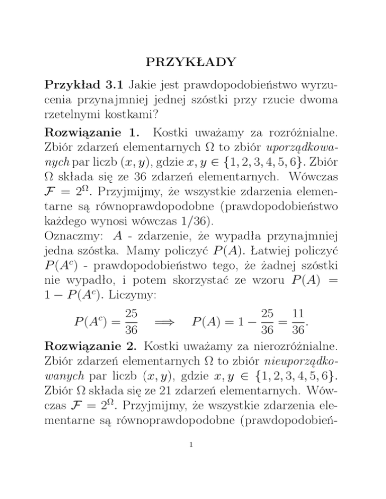 Przykład 3.1 Jakie jest prawdopodobieństwo wyrzucenia przynajmniej jednej szóstki przy rzucie dwoma