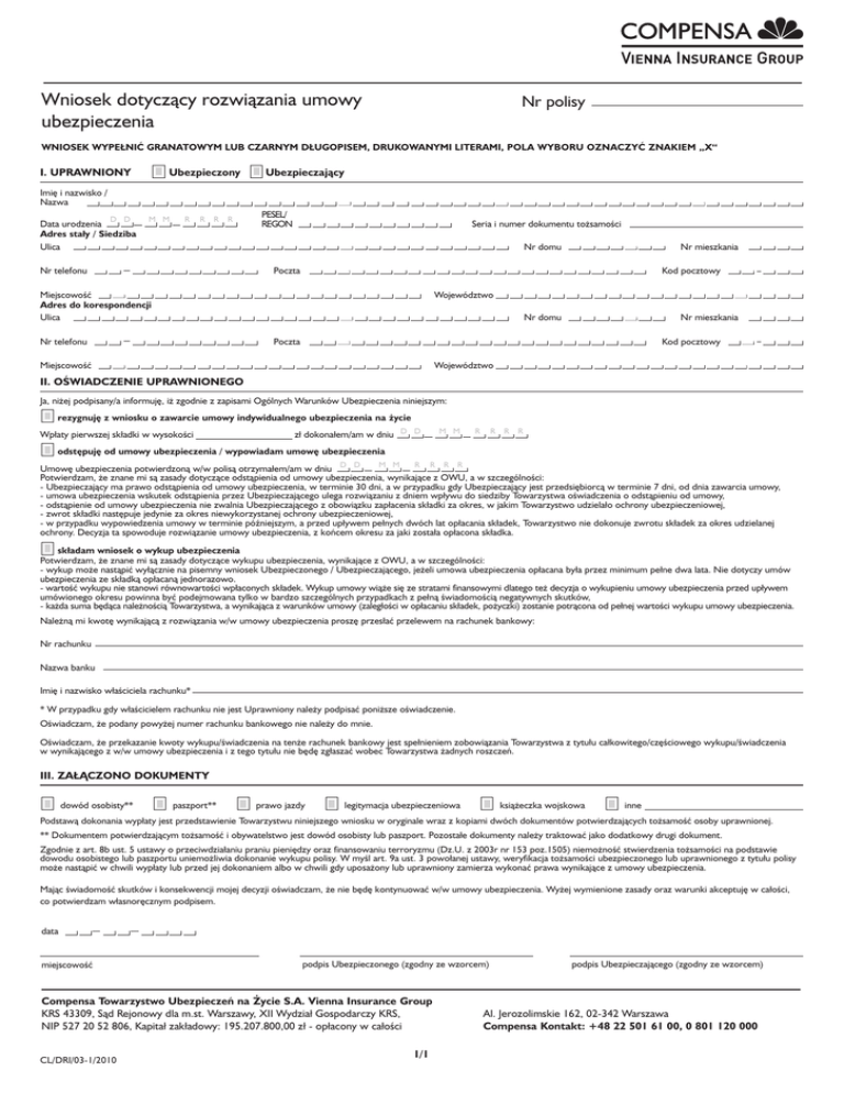 Wniosek dotyczący rozwiązania umowy ubezpieczenia Nr polisy WNIOSEK WYPE¸NIĆ GRANATOWYM LUB CZARNYM D¸UGOPISEM, DRUKOWANYMI LITERAMI, POLA WYBORU OZNACZYĆ ZNAKIEM „X“ I. UPRAWNIONY Ubezpieczony Ubezpieczający Imię i nazwisko / Nazwa D D Data urodzenia Adres sta∏y / Siedziba Ulica M M R R R R PESEL/ REGON Seria i numer dokumentu tożsamości Nr mieszkania Nr domu Nr telefonu Kod pocztowy Poczta Miejscowość Adres do korespondencji Ulica Województwo Nr mieszkania Nr domu Nr telefonu Kod pocztowy Poczta Miejscowość Województwo II. OŚWIADCZENIE UPRAWNIONEGO Ja, niżej podpisany/a informuję, iż zgodnie z zapisami Ogólnych Warunków Ubezpieczenia niniejszym: rezygnuję z wniosku o zawarcie umowy indywidualnego ubezpieczenia na życie Wpłaty pierwszej składki w wysokości zł dokonałem/am w dniu D D M M R R R R odstępuję od umowy ubezpieczenia / wypowiadam umowę ubezpieczenia M M R R R R Umowę ubezpieczenia potwierdzoną w/w polisą otrzymałem/am w dniu D D Potwierdzam, że znane mi są zasady dotyczące odstąpienia od umowy ubezpieczenia, wynikające z OWU, a w szczególności: - Ubezpieczający ma prawo odstąpienia od umowy ubezpieczenia, w terminie 30 dni, a w przypadku gdy Ubezpieczający jest przedsiębiorcą w terminie 7 dni, od dnia zawarcia umowy, - umowa ubezpieczenia wskutek odstąpienia przez Ubezpieczającego ulega rozwiązaniu z dniem wpływu do siedziby Towarzystwa oświadczenia o odstąpieniu od umowy, - odstąpienie od umowy ubezpieczenia nie zwalnia Ubezpieczającego z obowiązku zapłacenia składki za okres, w jakim Towarzystwo udzielało ochrony ubezpieczeniowej, - zwrot składki następuje jedynie za okres niewykorzystanej ochrony ubezpieczeniowej, - w przypadku wypowiedzenia umowy w terminie późniejszym, a przed upływem pełnych dwóch lat opłacania składek, Towarzystwo nie dokonuje zwrotu składek za okres udzielanej ochrony. Decyzja ta spowoduje rozwiązanie umowy ubezpieczenia, z końcem okresu za jaki została opłacona składka. składam wniosek o wykup ubezpieczenia Potwierdzam, że znane mi są zasady dotyczące wykupu ubezpieczenia, wynikające z OWU, a w szczególności: - wykup może nastąpić wyłącznie na pisemny wniosek Ubezpieczonego / Ubezpieczającego, jeżeli umowa ubezpieczenia opłacana była przez minimum pełne dwa lata. Nie dotyczy umów ubezpieczenia ze składką opłacaną jednorazowo. - wartość wykupu nie stanowi równowartości wpłaconych składek. Wykup umowy wiąże się ze stratami finansowymi dlatego też decyzja o wykupieniu umowy ubezpieczenia przed upływem umówionego okresu powinna być podejmowana tylko w bardzo szczególnych przypadkach z pełną świadomością negatywnych skutków, - każda suma będąca należnością Towarzystwa, a wynikająca z warunków umowy (zaległości w opłacaniu składek, pożyczki) zostanie potrącona od pełnej wartości wykupu umowy ubezpieczenia. Należną mi kwotę wynikającą z rozwiązania w/w umowy ubezpieczenia proszę przes∏ać przelewem na rachunek bankowy: Nr rachunku Nazwa banku Imię i nazwisko właściciela rachunku* * W przypadku gdy właścicielem rachunku nie jest Uprawniony należy podpisać poniższe oświadczenie. Oświadczam, że podany powyżej numer rachunku bankowego nie należy do mnie. Oświadczam, że przekazanie kwoty wykupu/świadczenia na tenże rachunek bankowy jest spełnieniem zobowiązania Towarzystwa z tytułu całkowitego/częściowego wykupu/świadczenia w wynikającego z w/w umowy ubezpieczenia i z tego tytułu nie będę zgłaszać wobec Towarzystwa żadnych roszczeń. III. ZAŁĄCZONO DOKUMENTY dowód osobisty** paszport** prawo jazdy legitymacja ubezpieczeniowa książeczka wojskowa inne Podstawą dokonania wypłaty jest przedstawienie Towarzystwu niniejszego wniosku w oryginale wraz z kopiami dwóch dokumentów potwierdzających tożsamość osoby uprawnionej. ** Dokumentem potwierdzającym tożsamość i obywatelstwo jest dowód osobisty lub paszport. Pozostałe dokumenty należy traktować jako dodatkowy drugi dokument. Zgodnie z art. 8b ust. 5 ustawy o przeciwdziałaniu praniu pieniędzy oraz finansowaniu terroryzmu (Dz.U. z 2003r nr 153 poz.1505) niemożność stwierdzenia tożsamości na podstawie dowodu osobistego lub paszportu uniemożliwia dokonanie wykupu polisy. W myśl art. 9a ust. 3 powołanej ustawy, weryfikacja tożsamości ubezpieczonego lub uprawnionego z tytułu polisy może nastąpić w chwili wypłaty lub przed jej dokonaniem albo w chwili gdy uposażony lub uprawniony zamierza wykonać prawa wynikające z umowy ubezpieczenia. Mając świadomość skutków i konsekwencji mojej decyzji oświadczam, że nie będę kontynuować w/w umowy ubezpieczenia. Wyżej wymienione zasady oraz warunki akceptuję w całości, co potwierdzam własnoręcznym podpisem. data miejscowość podpis Ubezpieczonego (zgodny ze wzorcem) Compensa Towarzystwo Ubezpieczeń na Życie S.A. Vienna Insurance Group KRS 43309, Sąd Rejonowy dla m.st. Warszawy, XII Wydzia∏ Gospodarczy KRS, NIP 527 20 52 806, Kapita∏ zak∏adowy: 195.207.800,00 z∏ - op∏acony w ca∏ości CL/DRI/03-1/2010 1/1 podpis Ubezpieczającego (zgodny ze wzorcem) Al. Jerozolimskie 162, 02-342 Warszawa Compensa Kontakt: +48 22 501 61 00, 0 801 120 000