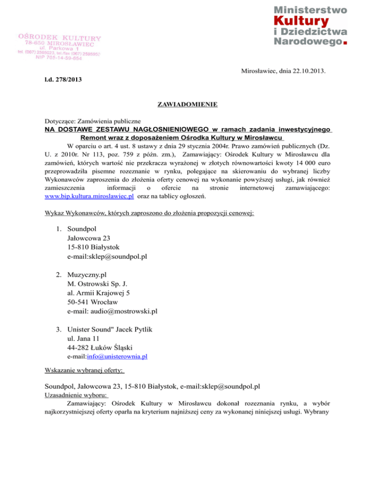 Mirosławiec, dnia 22.10.2013. l.d. 278/2013 ZAWIADOMIENIE Dotyczące: Zamówienia publiczne NA DOSTAWE ZESTAWU NAGŁOSNIENIOWEGO w ramach zadania inwestycyjnego Remont wraz z doposażeniem Ośrodka Kultury w Mirosławcu W oparciu o art. 4 ust. 8 ustawy z dnia 29 stycznia 2004r. Prawo zamówień publicznych (Dz. U. z 2010r. Nr 113, poz. 759 z późn. zm.), Zamawiający: Ośrodek Kultury w Mirosławcu dla zamówień, których wartość nie przekracza wyrażonej w złotych równowartości kwoty 14 000 euro przeprowadziła pisemne rozeznanie w rynku, polegające na skierowaniu do wybranej liczby Wykonawców zaproszenia do złożenia oferty cenowej na wykonanie powyższej usługi, jak również zamieszczenia informacji o ofercie na stronie internetowej zamawiającego: www.bip.kultura.miroslawiec.pl oraz na tablicy ogłoszeń. Wykaz Wykonawców, których zaproszono do złożenia propozycji cenowej: 1. Soundpol Jałowcowa 23 15-810 Białystok e-mail:[email protected] 2. Muzyczny.pl M. Ostrowski Sp. J. al. Armii Krajowej 5 50-541 Wrocław e-mail: [email protected] 3. Unister Sound" Jacek Pytlik ul. Jana 11 44-282 Łuków Śląski e-mail:[email protected] Wskazanie wybranej oferty: Soundpol, Jałowcowa 23, 15-810 Białystok, e-mail:[email protected] Uzasadnienie wyboru: Zamawiający: Ośrodek Kultury w Mirosławcu dokonał rozeznania rynku, a wybór najkorzystniejszej oferty oparła na kryterium najniższej ceny za wykonanej niniejszej usługi. Wybrany Wykonawca podał wartość usługi dostawy zestawu nagłaśniającego wg parametrum podanych w ogłoszeniu w wysokości: cena brutto: 9.995,00 zł stąd wybór powyższego Wykonawcy. Z poważaniem Zawiadomienie wysłane do: - Adresatów wg rozdzielnika; − aa. − ROZDZIELNIK ADRESATÓW DO PISMA nr l.d.278/2013 1. Soundpol Jałowcowa 23 15-810 Białystok e-mail:[email protected] 2. Sklep Muzyczny Jacek Kamiński ul. Królewiecka 25 pawilon 15 09-402 Płock 3. PHPU ZUBER Andrzej Zuber ul. Krakowska 29 c 50-424 Wrocław 4. Kam-I Music Media Jaroslaw Igielski ul. Dmowskiego 1 c 18-400 Łomża 5. ESS- Audio sp. z o.o. ul. Graniczna 17 05-092 Łomianki - Dąbrowa .