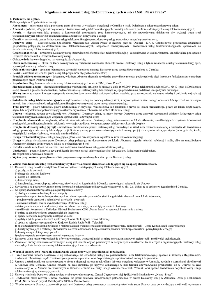 Regulamin świadczenia usług telekomunikacyjnych w sieci CSM „Nasza Praca” 1. Postanowienia ogólne. Definicje użyte w Regulaminie oznaczają: Abonament – miesięczna opłata ponoszona przez abonenta w wysokości określonej w Cenniku z tytułu świadczenia usług przez dostawcę usług; Abonent – podmiot, który jest stroną umowy o świadczenie usług telekomunikacyjnych zawartej z dostawcą publicznie dostępnych usług telekomunikacyjnych; Awaria – nieplanowana jako przerwa z konieczności prowadzenia prac konserwacyjnych, ani nie spowodowana działaniem siły wyższej wada sieci telekomunikacyjnej całkowicie uniemożliwiająca abonentowi korzystanie z usług; Cennik – zestawienie cen za świadczone usługi telekomunikacyjne przez dostawcę usług, stanowiący integralną część umowy; Dostawca usług – Częstochowska Spółdzielnia Mieszkaniowa „Nasza Praca” z siedzibą przy ul. Okólnej 113A w Częstochowie prowadząca działalność gospodarczą polegającą na dostarczaniu sieci telekomunikacyjnych, udogodnień towarzyszących i świadczeniu usług telekomunikacyjnych, uprawniona do świadczenia usług telekomunikacyjnych; Gniazdo abonenckie – urządzenia Dostawcy usług stanowiące zakończenie sieci telekomunikacyjnej, zainstalowane w lokalu Abonenta, umożliwiające podłączenie Urządzeń abonenckich i Urządzeń Dostawcy usług; Gniazdo dodatkowe – drugie lub następne gniazdo abonenckie; Okres rozliczeniowy – okres, za który dokonywane są rozliczenia należności abonenta wobec Dostawcy usług z tytułu świadczenia usług telekomunikacyjnych, wynosi jeden miesiąc kalendarzowy; Opłata aktywacyjna – opłata za jednorazowe czynności wnoszona na rzecz Dostawcy usług szczegółowo określona w Cenniku; Pakiet – określona w Cenniku grupa usług lub programów objętych abonamentem; Protokół odbioru technicznego – dokument, w którym Abonent pisemnie potwierdza prawidłowy montaż, podłączenie do sieci i sprawne funkcjonowanie urządzeń przekazanych przez Dostawcę usług; Regulamin – Regulamin świadczenia usług telekomunikacyjnych w sieci CSM „Nasza Praca”; Sieć telekomunikacyjna – sieć telekomunikacyjna w rozumieniu art. 2 pkt 35 ustawy z dnia 16.07.2004 Prawo telekomunikacyjne (Dz.U. Nr 171 poz. 1800) łącząca stację czołową z gniazdem abonenckim, będąca własnością Dostawcy usług bądź będąca w jego posiadaniu na podstawie innego tytułu prawnego; Siła wyższa – zdarzenie, którego wystąpienia nie można było przewidzieć ani jego skutkom zapobiec przy zastosowaniu najlepszej wiedzy i dołożeniu najwyższej staranności; Świadczenie usług telekomunikacyjnych – wykonywanie usług za pomocą własnej sieci, z wykorzystaniem sieci innego operatora lub sprzedaż we własnym imieniu i na własny rachunek usługi telekomunikacyjnej wykonywanej przez innego dostawcę usług; Tytuł prawny – prawo własności, prawo użytkowania wieczystego, własnościowe lub lokatorskie prawo do lokalu mieszkalnego, prawo do lokalu użytkowego, najem lub inny dokument potwierdzający możliwość wykonania zobowiązania wobec Dostawcy usług; Umowa – pisemne, zgodne oświadczenie woli Abonenta i Dostawcy usług, na mocy którego Dostawca usług zapewni Abonentowi odpłatne świadczenie usług telekomunikacyjnych, określające wzajemne uprawnienia i obowiązki stron; Urządzenia abonenckie – urządzenia, które nie stanowią własności Dostawcy usług, zainstalowane w lokalu Abonenta, umożliwiające korzystanie Abonentowi z usług telekomunikacyjnych (m.in. odbiornik telewizyjny, radiowy, komputer, aparat telefoniczny, konsola do gier); Urządzenia dostawcy usług (sprzęt) – urządzenia zainstalowane przez Dostawcę usług, wchodzące w skład sieci telekomunikacyjnej i niezbędne do świadczenia usługi, pozostające własnością lub w dyspozycji Dostawcy usług przez okres obowiązywania Umowy, po jej rozwiązaniu lub wygaśnięciu (m.in. gniazda, kable, rozgałęźniki, modemy kablowe, terminale multimedialne); Usługa telekomunikacyjna – usługa polegająca głównie na przekazywaniu sygnałów w sieci telekomunikacyjnej; Usługa – usługa świadczona przez Dostawcę usług polegająca na dostarczaniu do lokalu Abonenta sygnału telewizji kablowej i radia, albo na umożliwieniu Abonentowi dostępu do Internetu w lokalu za pośrednictwem Sieci; Usterka – wada sieci, która nie uniemożliwia całkowicie świadczenia usług przez dostawcę usług; Użytkownik – podmiot korzystający z publicznie dostępnej usługi telekomunikacyjnej lub żądający świadczenia takiej usługi, dla zaspokojenia własnych potrzeb; Wykaz programów – uporządkowana lista programów rozprowadzanych w sieci przez Dostawcę usług. 2. Zakres świadczonych usług telekomunikacyjnych ze wskazaniem elementów składających się na opłatę abonamentową. 2.1. Dostawca usług umożliwia użytkownikowi korzystanie z następujących usług telekomunikacyjnych: a) przyłączenie do sieci, b) dostęp do telewizji kablowej, c) dostęp do Internetu, d) konserwację sieci, e) innych usług zlecanych przez Abonenta, określonych w Regulaminie i Cenniku stanowiących załączniki do Umowy. 2.2. Użytkownik na podstawie Umowy może korzystać z usług telekomunikacyjnych wskazanych w pkt. 2.1. Usługi te są opisane w Regulaminie i Cenniku. 2.3. Na opłatę abonamentową składają się następujące elementy: a) obsługa w zakresie bieżącej konserwacji, tj.: – prowadzenie prac kontrolno-pomiarowych w celu utrzymania parametrów sieci i w gnieździe abonenckim w lokalu Abonenta; – przyjmowanie zgłoszeń o zaistniałych usterkach i awariach; – usuwanie usterek i awarii wynikłych z winy Dostawcy usług; – dokonywanie napraw i modernizacji sieci w celu utrzymania jej w należytym stanie technicznym. – możliwość konsultacji z Zakładem Obsługi Technicznej CSM „Nasza Praca” w sprawach korzystania z usług; b) op