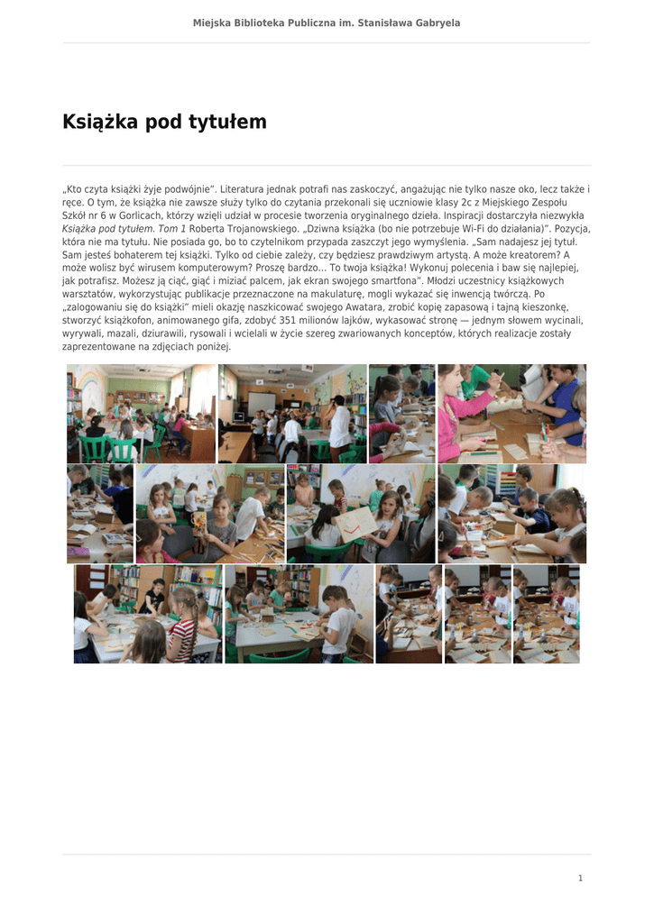 Miejska Biblioteka Publiczna im. Stanisława Gabryela Książka pod tytułem „Kto czyta książki żyje podwójnie”. Literatura jednak potrafi nas zaskoczyć, angażując nie tylko nasze oko, lecz także i ręce. O tym, że książka nie zawsze służy tylko do czytania przekonali się uczniowie klasy 2c z Miejskiego Zespołu Szkół nr 6 w Gorlicach, którzy wzięli udział w procesie tworzenia oryginalnego dzieła. Inspiracji dostarczyła niezwykła Książka pod tytułem. Tom 1 Roberta Trojanowskiego. „Dziwna książka (bo nie potrzebuje Wi-Fi do działania)”. Pozycja, która nie ma tytułu. Nie posiada go, bo to czytelnikom przypada zaszczyt jego wymyślenia. „Sam nadajesz jej tytuł. Sam jesteś bohaterem tej książki. Tylko od ciebie zależy, czy będziesz prawdziwym artystą. A może kreatorem? A może wolisz być wirusem komputerowym? Proszę bardzo… To twoja książka! Wykonuj polecenia i baw się najlepiej, jak potrafisz. Możesz ją ciąć, giąć i miziać palcem, jak ekran swojego smartfona”. Młodzi uczestnicy książkowych warsztatów, wykorzystując publikacje przeznaczone na makulaturę, mogli wykazać się inwencją twórczą. Po „zalogowaniu się do książki” mieli okazję naszkicować swojego Awatara, zrobić kopię zapasową i tajną kieszonkę, stworzyć książkofon, animowanego gifa, zdobyć 351 milionów lajków, wykasować stronę — jednym słowem wycinali, wyrywali, mazali, dziurawili, rysowali i wcielali w życie szereg zwariowanych konceptów, których realizacje zostały zaprezentowane na zdjęciach poniżej. 1