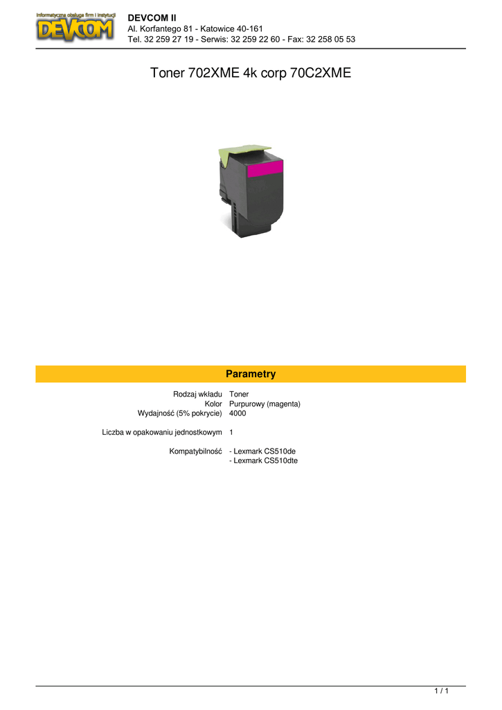 DEVCOM II Al. Korfantego 81 - Katowice 40-161 Tel. 32 259 27 19 - Serwis: 32 259 22 60 - Fax: 32 258 05 53 Toner 702XME 4k corp 70C2XME Parametry Rodzaj wkładu Toner Kolor Purpurowy (magenta) Wydajność (5% pokrycie) 4000 Liczba w opakowaniu jednostkowym 1 Kompatybilność - Lexmark CS510de - Lexmark CS510dte 1/1 Powered by TCPDF (www.tcpdf.org)