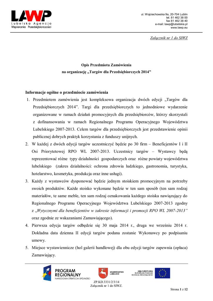 ul. Wojciechowska 9a, 20-704 Lublin tel. 81 462 38 00 fax 81 462 38 40 e-mail: [email protected] www.lawp.eu Załącznik nr 1 do SIWZ Opis Przedmiotu Zamówienia na organizację „Targów dla Przedsiębiorczych 2014” Informacje ogólne o przedmiocie zamówienia 1. Przedmiotem zamówienia jest kompleksowa organizacja dwóch edycji „Targów dla Przedsiębiorczych 2014”. Targi dla przedsiębiorczych to jednodniowe wydarzenie organizowane w ramach działań promocyjnych dla przedsiębiorców, którzy skorzystali z dofinansowania w ramach Regionalnego Programu Operacyjnego Województwa Lubelskiego 2007-2013. Celem targów dla przedsiębiorczych jest przedstawienie opinii publicznej dobrych praktyk korzystania z funduszy unijnych. 2. W każdej z dwóch edycji targów uczestniczyć będzie po 30 firm – Beneficjentów I i II Osi Priorytetowej RPO WL 2007-2013. Uczestnicy targów – Wystawcy będą reprezentować różne typy działalności gospodarczych oraz różne powiaty województwa lubelskiego (zakres działalności: ochrona zdrowia ludzkiego, gastronomia, turystyka, hotelarstwo, kosmetyka, produkcja oraz inne usługi). 3. Każdy z wystawców dysponować będzie jednym stoiskiem promocyjnym na potrzeby swoich produktów. Każde stoisko wykonane będzie w ten sam sposób (ten sam rodzaj materiałów, te same meble, ten sam rodzaj oznakowania każdego stoiska nawiązujący do Regionalnego Programu Operacyjnego Województwa Lubelskiego 2007-2013 zgodny z „Wytycznymi dla beneficjentów w zakresie informacji i promocji RPO WL 2007-2013” oraz zgodnie ze wskazaniami Zamawiającego). 4. Pierwsza edycja targów odbędzie się 30 maja 2014 r., druga we wrześniu 2014 r. Dokładna data dzienna II edycji targów podana zostanie Wykonawcy po podpisaniu umowy. 5. Miejsce wystawiennicze (hol galerii handlowej) dla obu edycji targów zapewnia (opłaca) Zamawiający. ZP.KD.3331/2/3/14 Załącznik nr 1 do SIWZ. Strona 1 z 12 ul. Wojciechowska 9a, 20-704 Lublin tel. 81 462 38 00 fax 81 462 38 40 e-mail: [email protected] www.lawp.eu Obowiązki Wykonawcy: W celu kompleksowej organizacji Targów dla przedsiębiorczych 2014 Wykonawca zobowiązany będzie każdorazowo (w każdej z dwóch edycji) do: 1. Wykonania 31 stoisk promocyjnych o powierzchni 6 m2 (3mx2m; +/-10%) i jednego stoiska promocyjnego o powierzchni 12 m2 (+/-10%), począwszy od zaprojektowania poprzez dostawę elementów stoisk oraz odpowiednie usytuowanie stoisk na miejscu targów i ich zmontowanie. Wykonawca zobowiązany jest do dokonania wszelkich czynności formalnych związanych z techniczno-organizacyjnym funkcjonowaniem stoiska w celu dostawy/transportu oraz montażu a następnie demontażu stoiska. 2. Ustawienia stoisk wystawienniczych w układzie umożliwiającym uczestnikom targów oraz zwiedzającym swobodne poruszanie się. Zabudowa stoisk wystawienniczych w ustawieniu szeregowym podwójnym. Zabudowy targowe wykonane w systemie typu octanorm lub równoważnym. Aluminiowe profile w kolorze anodowanego lub białego aluminium wypełnione białymi ekranami z HDF dwustronnie pokrytymi okleiną PCV. Na wszystkich stoiskach targowych musi być zamontowana instalacja oświetleniowa. Każde ze stoisk musi posiadać ladę o wymiarach: 90cm x 100cm x 50cm (+/- 10 cm), do której będą dostawione 2 hokery oraz w środku stoiska ustawiony stolik i dwa krzesła dla dorosłych o rozmiarach pozwalających na swobodne poruszanie się po stoisku. Jedno ze stoisk (na potrzeby Zamawiającego) – podwójnej wielkości – 12 m2. To stoisko wyposażone w 2 lady, 3 hokery oraz telewizor LED 32” z możliwością podpięcia do komputera. Wykonawca zapewnia montaż (zawieszenie) telewizora w widocznym miejscu na stoisku. Na fryzie każdego ze stoisk musi być zamieszczone logo Programu Regionalnego (jedno dla wszystkich 32 stoisk) oraz nazwa własna firmy – Wystawcy (nazwy firm poda Zamawiający). Na zewnętrznej ścianie lady logo oraz grafika (w oparciu o klucz graficzny przekazany przez Zamawiającego w formatach *.jpg oraz *.pdf). Aranżacja stoisk do uzgodnienia z Zamawiającym. 3. Zapewnienia odpowiedniego nagłośnienia, dostosowanego do warunków miejsca wystawienniczego (galeria handlowa) wraz z mikrofonem umożliwiającym odpowiednią słuchalność. ZP.KD.3331/2/3/14 Załącznik nr 1 do SIWZ. Strona 2 z 12 ul. Wojciechowska 9a, 20-704 Lublin tel. 81 462 38 00 fax 81 462 38 40 e-mail: [email protected] www.lawp.eu 4. Zapewnienia podestu dla 1-2 osób (przemawiających) i usytuowanie go w najbardziej widocznym miejscu w holu galerii. 5. Montażu stoisk promocyjnych w dzień poprzedzający targi, po godz. 18.00. 6. Zaaranżowania pomieszczenia, w którym będą znajdowały się stoiska promocyjne w sposób jednorodny nawiązujący do grafiki przekazanej Wykonawcy po podpisaniu umowy. 7. Wykonania 14 roll-upów o wymiarach 85 cm x 200 cm (+/-10%) z taką samą kolorystyką jak na stoiskach promocyjnych. Roll-upy zostaną umieszczone przy wejściach do budynku wystawienniczego, na korytarzach (szczegółowe rozmieszczenie do uzgodnienia z Zamawiającym). Nadruk graficzny znajdujący się na roll-upach oraz grafika znajdująca się na stoiskach promocyjnych musi być wykonana w pełnych kolorach. 8. Wykonania stojącej tablicy informacyjnej o wymiarach nie mniejszych niż 200 cm (szerokość) x 150 cm (wysokość). Tablica wykonana z pleksi w kolorze białym (tło). Na tablicy umieszczone zostaną informacje o rozmieszczeniu stoisk wystawienniczych, plan targów. Wymagane logotypy w kolorze. Litery w kolorze czarnym, czcionka Arial CE. Rozmiar liter i cyfr: proporcje dostosowane do rozmiaru tablicy i ilości tekstu – zachowanie zasad estetyki. Ostateczny rozmiar tablicy uwarunkowany i uzależniony od proporcji, ilości liter, tak aby zachować przejrzystość tablicy. Projekt graficzny tablicy podlega zatwierdzeniu przez Zamawiającego. Zapewnienie stelażu do ustawienia tablicy oraz rozstawienie tablicy w miejscu wskazanym przez Zamaw