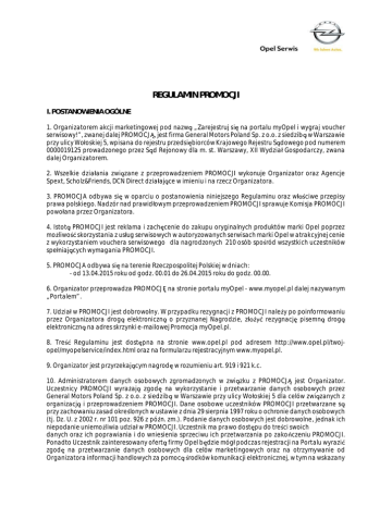 REGULAMIN PROMOCJI I. POSTANOWIENIA OGÓLNE 1. Organizatorem akcji marketingowej pod nazw „Zarejestruj si na portalu myOpel i wygraj voucher serwisowy!”, zwanej dalej PROMOCJ , jest firma General Motors Poland Sp. z o.o. z siedzib w Warszawie przy ulicy Wo oskiej 5, wpisana do rejestru przedsi biorców Krajowego Rejestru S dowego pod numerem 0000019125 prowadzonego przez S d Rejonowy dla m. st. Warszawy, XII Wydzia Gospodarczy, zwana dalej Organizatorem. 2. Wszelkie dzia ania zwi zane z przeprowadzeniem PROMOCJI wykonuje Organizator oraz Agencje Spext, Scholz&Friends, DCN Direct dzia aj ce w imieniu i na rzecz Organizatora. 3. PROMOCJA odbywa si w oparciu o postanowienia niniejszego Regulaminu oraz w ciwe przepisy prawa polskiego. Nadzór nad prawid owym przeprowadzeniem PROMOCJI sprawuje Komisja PROMOCJI powo ana przez Organizatora. 4. Istot PROMOCJI jest reklama i zach cenie do zakupu oryginalnych produktów marki Opel poprzez mo liwo skorzystania z us ug serwisowych w autoryzowanych serwisach marki Opel w atrakcyjnej cenie z wykorzystaniem vouchera serwisowego dla nagrodzonych 210 osób spo ród wszystkich uczestników spe niaj cych wymagania PROMOCJI. 5. PROMOCJA odbywa si na terenie Rzeczpospolitej Polskiej w dniach: - od 13.04.2015 roku od godz. 00.01 do 26.04.2015 roku do godz. 00.00. 6. Organizator przeprowadza PROMOCJ na stronie portalu myOpel - www.myopel.pl dalej nazywanym „Portalem”. 7. Udzia w PROMOCJI jest dobrowolny. W przypadku rezygnacji z PROMOCJI nale y po poinformowaniu przez Organizatora drog elektroniczn o przyznanej Nagrodzie, z rezygnacj pisemn drog elektroniczn na adres skrzynki e-mailowej Promocja myOpel.pl. 8. Tre Regulaminu jest dost pna na stronie www.opel.pl pod adresem http://www.opel.pl/twojopel/myopelservice/index.html oraz na formularzu rejestracyjnym www.myopel.pl. 9. Organizator jest przyrzekaj cym nagrod w rozumieniu art. 919 i 921 k.c. 10. Administratorem danych osobowych zgromadzonych w zwi zku z PROMOCJ jest Organizator. Uczestnicy PROMOCJI wyra aj zgod na wykorzystanie i przetwarzanie danych osobowych przez General Motors Poland Sp. z o.o. z siedzib w Warszawie przy ulicy Wo oskiej 5 dla celów zwi zanych z organizacj i przeprowadzeniem PROMOCJI. Dane osobowe uczestników PROMOCJI przetwarzane s przy zachowaniu zasad okre lonych w ustawie z dnia 29 sierpnia 1997 roku o ochronie danych osobowych (tj. Dz. U. z 2002 r. nr 101 poz. 926 z pó n. zm.). Podanie danych osobowych jest dobrowolne, jednak ich niepodanie uniemo liwia udzia w PROMOCJI. Uczestnik ma prawo dost pu do tre ci swoich danych oraz ich poprawiania i do wniesienia sprzeciwu ich przetwarzania po zako czeniu PROMOCJI. Ponadto Uczestnik zainteresowany ofert firmy Opel b dzie móg podczas rejestracji na Portalu wyrazi zgod na przetwarzanie danych osobowych dla celów marketingowych oraz na otrzymywanie od Organizatora informacji handlowych za pomoc rodków komunikacji elektronicznej, w tym na wskazany w formularzu zg oszeniowym adres e-mail zgodnie z ustaw o wiadczeniu us ug drog elektroniczn z dnia 18 lipca 2002 roku. ( Dz.U. z 2002 nr 144, poz. 1204 z pó n. zm.) 11. PROMOCJA nie jest gr losow , loteri fantow , zak adem wzajemnym ani loteri promocyjn , których wynik zale y od przypadku w rozumieniu art. 2 ustawy o grach hazardowych z dnia 19 listopada 2009 roku. 11. PROMOCJA nie jest gr losow , loteri fantow , zak adem wzajemnym aniloteri promocyjn , których wynik zale y od przypadku w rozumieniu art. 2 ustawy o grach hazardowych z dnia 19 listopada 2009r. II. UCZESTNICY PROMOCJI 1. W PROMOCJI mo e wzi udzia ka da osoba fizyczna zamieszka a na terenie Rzeczypospolitej Polskiej posiadaj ca pe zdolno do czynno ci prawnych oraz posiadaj ca tytu w asno ci do samochodu marki Opel. 2. Organizator dopuszcza do PROMOCJI Uczestników, którzy maj zarejestrowany samochód marki Opel na prowadzan przez siebie dzia alno gospodarcz , wpisan do ewidencji dzia alno ci gospodarczej przedsi biorców indywidualnych oraz leasingobiorców. 3. Uczestnikami PROMOCJI mog by wy cznie u ytkownicy Portalu posiadaj cy aktywne konto na Portalu. Ka dy uczestnik PROMOCJI uczestnicz c w niej, akceptuje warunki regulaminu PROMOCJI. 4. Z udzia u w PROMOCJI wy czeni s pracownicy Organizatora, General Motors Manufacturing Poland Sp. z o.o., Deloitte Polska Sp. z o.o. Sp. K. oraz podmioty wspó pracuj ce przy realizacji akcji marketingowej, a tak e pracownicy autoryzowanych dystrybutorów oraz serwisów marki Opel oraz ich ma onkowie, powinowaci w linii prostej pierwszego stopnia. 5. Prawo udzia u w PROMOCJI przys uguje wy cznie osobom spe niaj cym warunki okre lone Regulaminem Promocji. 6. Osoby fizyczne, które spe ni wskazane w Regulaminie warunki uczestnictwa w PROMOCJI oraz poprawnie wype ni formularz rejestracyjny oraz aktywuj konto na Portalu tym samym bior c udzia w PROMOCJI, zwane b w dalszej cz ci Regulaminu "Uczestnikami". 7. Uczestnicy, którzy uchybi którejkolwiek z zasad Regulaminu zostan wy czeni z udzia u w PROMOCJI. III. SPOSÓB PRZEPROWADZENIA PROMOCJI I ZASADY UCZESTNICTWA W PROMOCJI. 1. Aby wzi udzia w PROMOCJI nale y spe ni cznie wszystkie poni sze warunki: a) zarejestrowa si na Portalu myOpel poprzez wype nienie formularza rejestracyjnego i uzupe nienie wszystkich danych wymaganych oznaczonych gwiazdk (dane obowi zkowe) w formularzu rejestracyjnym, w tym wyra enie zgody na przetwarzanie danych osobowych zgodnie z Ustaw o ochronie danych osobowych. b) Po wype nieniu formularza rejestracyjnego oraz wyra eniu zgody na dwie pierwsze klauzule zawarte w formularzu rejestracyjnym nale y aktywowa konto na Portalu. Aktywacja konta odbywa si poprzez klikni cie linku aktywuj cego w wiadomo ci e-mail, któr Uczestnik otrzyma na podany w formularzu rejestracyjnym adres e-mail. c) W dniach: - od 13.04.2015 roku od godz. 00.01 do 26.04.2015 roku do godz. 00.00 w cznie albo zg osi swój udzia w PROMOCJI poprzez wype nienie formularza rejestracyjnego na Portalu oraz podanie: imienia i nazwiska, ulica, numer