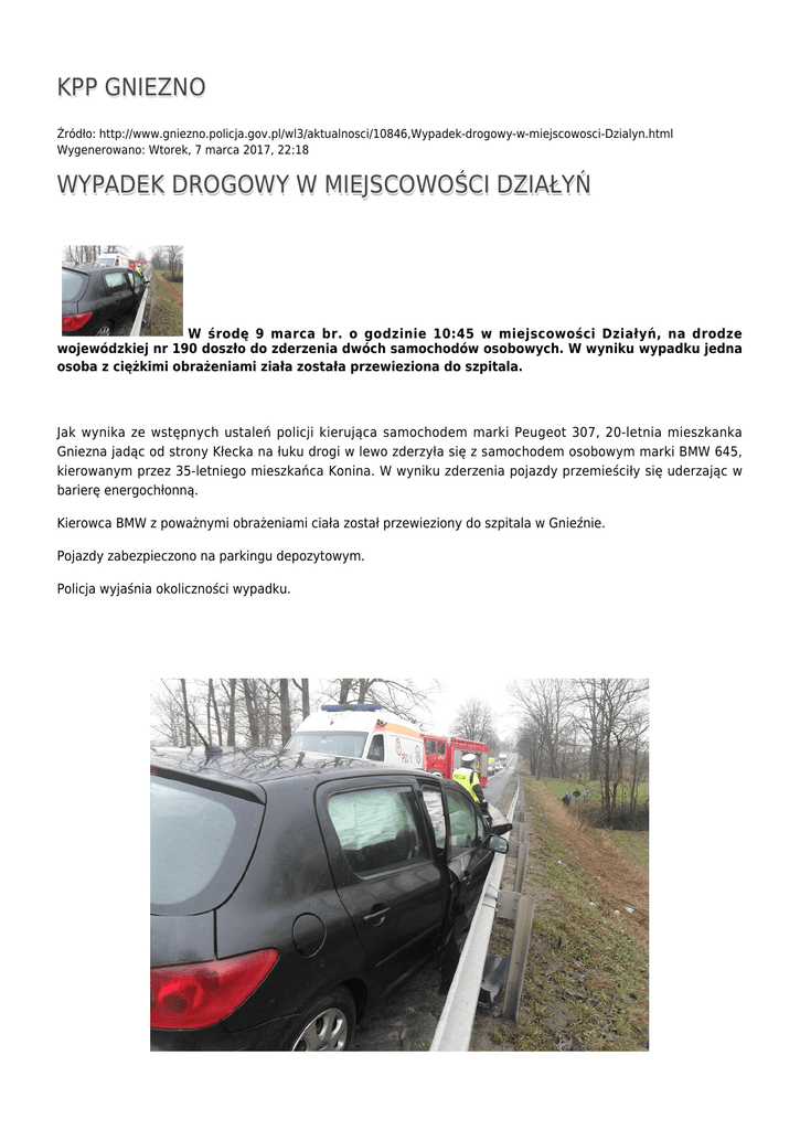 KPP GNIEZNO Źródło: http://www.gniezno.policja.gov.pl/wl3/aktualnosci/10846,Wypadek-drogowy-w-miejscowosci-Dzialyn.html Wygenerowano: Wtorek, 7 marca 2017, 22:18 WYPADEK DROGOWY W MIEJSCOWOŚCI DZIAŁYŃ W środę 9 marca br. o godzinie 10:45 w miejscowości Działyń, na drodze wojewódzkiej nr 190 doszło do zderzenia dwóch samochodów osobowych. W wyniku wypadku jedna osoba z ciężkimi obrażeniami ziała została przewieziona do szpitala. Jak wynika ze wstępnych ustaleń policji kierująca samochodem marki Peugeot 307, 20-letnia mieszkanka Gniezna jadąc od strony Kłecka na łuku drogi w lewo zderzyła się z samochodem osobowym marki BMW 645, kierowanym przez 35-letniego mieszkańca Konina. W wyniku zderzenia pojazdy przemieściły się uderzając w barierę energochłonną. Kierowca BMW z poważnymi obrażeniami ciała został przewieziony do szpitala w Gnieźnie. Pojazdy zabezpieczono na parkingu depozytowym. Policja wyjaśnia okoliczności wypadku. Ocena: 0/5 (0) Tweetnij