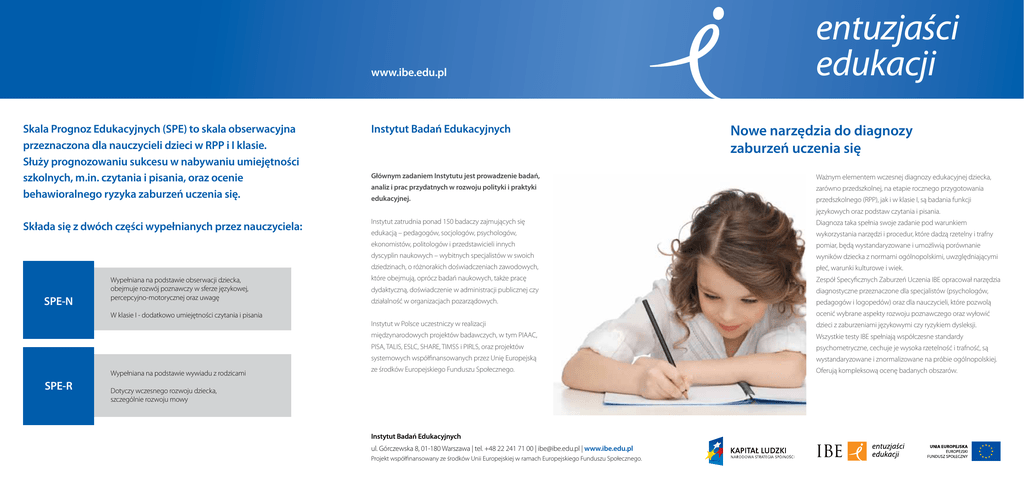 www.ibe.edu.pl entuzjaści edukacji Nowe narzędzia do diagnozy zaburzeń uczenia się Skala Prognoz Edukacyjnych (SPE) to skala obserwacyjna przeznaczona dla nauczycieli dzieci w RPP i I klasie. Służy prognozowaniu sukcesu w nabywaniu umiejętności szkolnych, m.in. czytania i pisania, oraz ocenie behawioralnego ryzyka zaburzeń uczenia się. Instytut Badań Edukacyjnych Składa się z dwóch części wypełnianych przez nauczyciela: Instytut zatrudnia ponad 150 badaczy zajmujących się Diagnoza taka spełnia swoje zadanie pod warunkiem edukacją – pedagogów, socjologów, psychologów, wykorzystania narzędzi i procedur, które dadzą rzetelny i trafny ekonomistów, politologów i przedstawicieli innych pomiar, będą wystandaryzowane i umożliwią porównanie dyscyplin naukowych – wybitnych specjalistów w swoich wyników dziecka z normami ogólnopolskimi, uwzględniającymi dziedzinach, o różnorakich doświadczeniach zawodowych, płeć, warunki kulturowe i wiek. które obejmują, oprócz badań naukowych, także pracę Zespół Specyficznych Zaburzeń Uczenia IBE opracował narzędzia dydaktyczną, doświadczenie w administracji publicznej czy diagnostyczne przeznaczone dla specjalistów (psychologów, działalność w organizacjach pozarządowych. pedagogów i logopedów) oraz dla nauczycieli, które pozwolą Głównym zadaniem Instytutu jest prowadzenie badań, Ważnym elementem wczesnej diagnozy edukacyjnej dziecka, analiz i prac przydatnych w rozwoju polityki i praktyki zarówno przedszkolnej, na etapie rocznego przygotowania edukacyjnej. przedszkolnego (RPP), jak i w klasie I, są badania funkcji językowych oraz podstaw czytania i pisania. SPE-N Wypełniana na podstawie obserwacji dziecka, obejmuje rozwój poznawczy w sferze językowej, percepcyjno-motorycznej oraz uwagę ocenić wybrane aspekty rozwoju poznawczego oraz wyłowić W klasie I - dodatkowo umiejętności czytania i pisania Wypełniana na podstawie wywiadu z rodzicami SPE-R Instytut w Polsce uczestniczy w realizacji dzieci z zaburzeniami językowymi czy ryzykiem dysleksji. międzynarodowych projektów badawczych, w tym PIAAC, Wszystkie testy IBE spełniają współczesne standardy PISA, TALIS, ESLC, SHARE, TIMSS i PIRLS, oraz projektów psychometryczne, cechuje je wysoka rzetelność i trafność, są systemowych współfinansowanych przez Unię Europejską wystandaryzowane i znormalizowane na próbie ogólnopolskiej. ze środków Europejskiego Funduszu Społecznego. Oferują kompleksową ocenę badanych obszarów. Dotyczy wczesnego rozwoju dziecka, szczególnie rozwoju mowy Instytut Badań Edukacyjnych ul. Górczewska 8, 01-180 Warszawa | tel. +48 22 241 71 00 | [email protected] | www.ibe.edu.pl Projekt współfinansowany ze środków Unii Europejskiej w ramach Europejskiego Funduszu Społecznego. entuzjaści edukacji Test Rozwoju Językowego (TRJ) służy do oceny mowy biernej i czynnej u dzieci w wieku 4–8 lat. Zawiera 7 podskal do pomiaru wiedzy leksykalnej, gramatycznej (składniowej i fleksyjnej) oraz dyskursywnej. 1 Baterie Testów Czytania i Pisania są przeznaczone dla dzieci uczęszczających do RPP i klasy I, a oceniają umiejętności leżące u podstaw czytania i pisania oraz wczesne próby w tym zakresie. Pozwalają wskazać dzieci, u których mogą pojawić się w przyszłości zaburzenia uczenia, głównie ryzyko dysleksji, oraz ukierunkować pracę z nimi. Bateria Testów Fonologicznych zawiera kilkanaście różnych zadań służących ocenie sprawności podstawowych dla czytania i pisania: słuchu fonemowego, łączenia i dzielenia wyrazów na głoski i litery, rozpoznawania i tworzenia rymów, świadomości fonologicznej w zadaniach przekształcania słów. Słownik - recepcja Bateria Testów Czytania 2 Słownik - produkcja 3 Rozumienie konstrukcji składniowych 4 Powtarzanie zdań RPP RPP i klasa I klasa I Rymy i aliteracje Nazywanie liter - prezentowanych w seriach na planszach Wyrazy - czytanie niepowiązanych wyrazów Wyspa - czytanie prostych pseudowyrazów w kontekście zabawnych ilustracji Tekst - czytanie Sztuczne wyrazy - czytanie izolowanych pseudowyrazów Rozpoznawanie Tworzenie Dzielenie słów na sylaby Sylaby Łączenie sylab w słowa Usuwanie sylab ze słów 5 Tworzenie zdań według modelu 6 Odmiana wyrazów 7 Rozpoznawanie liter - wskazywanie na planszy nazwanych przez badającego liter Rozumienie tekstów ze słuchu TRJ umożliwia pełną diagnozę różnicową dzieci ze specyficznym zaburzeniem językowym (SLI) oraz innymi zaburzeniami językowymi. Uzyskany profil językowy pozwala ukierunkować terapię w zależności od rodzaju i natężenia występujących u dziecka deficytów. Bateria Testów Pisania RPP Wyrazy - układanie - budowanie prostych wyrazów z ruchomego alfabetu Wyrazy - pisanie 1 - pisanie ze słuchu prostych wyrazów RPP i klasa I Napisy - dziecko wskazuje układ liter bardziej prawdopodobny w języku polskim (świadomość grafotaktyczna) klasa I Wyrazy - uzupełnianie wyrazów z trudnością ortograficzną powiązanych z fleksją Wyrazy - pisanie 2 - pisanie ze słuchu Tekst - dyktando „Rybka Lena” Dzielenie słów na głoski Głoski Łączenie głosek w słowa Usuwanie głosek ze słów Test Rozwoju Językowego opracował Zespół pod kierunkiem profesor Magdaleny Smoczyńskiej. Baterie Testów Czytania, Pisania i Fonologicznych oraz Skalę Prognoz Edukacyjnych opracował Zespół pod kierunkiem profesor Grażyny Krasowicz-Kupis.