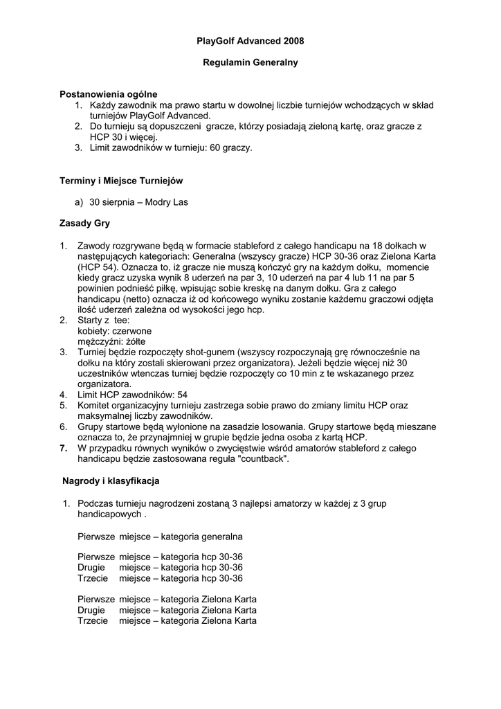 regulamin generalny playgolf advanced