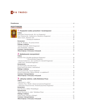 SPIS TREŚCI Przedmowa . . . . . . . . . . . . . . . . . . . . . . . . . . . . . . . . . . . . . . . . . . . . . . . . . . . . . . . . . . . . . . . . . . . . 10 POZYTYWIZM . . . . . . . . . . . . . . . . . . . . . . . . . . . . . . . . . . . . . . . . . . . . . . . . . . . . . . . . . . . . . . . . 11 1. Pozytywiści wobec przeszłości i teraźniejszości Teksty Aleksander Świętochowski, My i wy (fragmenty) . . . . . . . Piotr Chmielowski, Utylitaryzm w literaturze (fragmenty) Adam Asnyk, Daremne żale . . . . . . . . . . . . . . . . . . . . . . * Dzisiejszym idealistom . . . . . . . . . . . . . . Komentarz Jerzy W. Borejsza, Noc postyczniowa . . . . . . . . . . . . . . . Dialogi z tradycją Tadeusz Konwicki, Bohiń (fragmenty) . . . . . . . . . . . . . . Anna Kamieńska, Niemowa . . . . . . . . . . . . . . . . . . . . . . Czytamy i interpretujemy . . . . . . . . . . . . . . . . . . . . . . Obserwujemy i ćwiczymy swój język . . . . . . . . . . . . . . . . . . . . . . . . . . . . . . . . . . . . . . . . . . . 12 . . . . . . . . . . . . . . . . . . . . . . . . . . . . . . . . . . . . . . . . . . . . . . . . . . . . . . . . . . . . . . . . . . . . . . . . . . . . . . . . . . . . . . . . . . . . . . . . . . . . . . . . 17 18 20 20 . . . . . . . . . . . . . . . . . . . . . . . . . . . 21 . . . . . . . . . . . . . . . . . . . . . . . . . . . . . . . . . . . . . . . . . . . . . . . . . . . . . . . . . . . . . . . . . . . . . . . . . . . . . . . . . . . . . . . . . . . . . . . . . . . . . . . . . . . . 22 24 24 25 2. Naśladowanie rzeczywistości . . . . . . . . . . . . . . . . . . . . . . . . . . . . . . . . . . . . . . . . . . 26 Teksty Bolesław Prus, Kronika tygodniowa (fragmenty) . . . . . . . . . . . . . . . . . . . . . . . . . . . . . . . . . . * Wieża paryska (fragmenty) . . . . . . . . . . . . . . . . . . . . . . . . . . . . . . . . . . . . . * Henryk Sienkiewicz, List z podróży do Ameryki (fragmenty) . . . . . . . . . . . . . . . . . . . . . . . . * Émile Zola, Germinal (fragmenty) . . . . . . . . . . . . . . . . . . . . . . . . . . . . . . . . . . . . . . . . . . . Komentarze Jan Józef Lipski, [Kroniki Prusa] . . . . . . . . . . . . . . . . . . . . . . . . . . . . . . . . . . . . . . . . . . . . . . Janina Kulczycka−Saloni, [Naturalizm ] . . . . . . . . . . . . . . . . . . . . . . . . . . . . . . . . . . . . . . . . . Dialogi z tradycją Andrzej Zaniewski, Szczur (fragment) . . . . . . . . . . . . . . . . . . . . . . . . . . . . . . . . . . . . . . . . . Ryszard Kapuściński, [Mówić prawdę, czy upiększać? ] . . . . . . . . . . . . . . . . . . . . . . . . . . . . . . Czytamy i interpretujemy . . . . . . . . . . . . . . . . . . . . . . . . . . . . . . . . . . . . . . . . . . . . . . . . . Obserwujemy i ćwiczymy swój język . . . . . . . . . . . . . . . . . . . . . . . . . . . . . . . . . . . . . . . . 3. Labirynty realizmu. Lalka Bolesława Prusa .............................. Teksty * Recenzenci o „Lalce” . . . . . . . . . . . . . . . . . . . . . . . . . . . . . . . . . . . . . . . . . . . . . . . . . . . . . . . . * Bolesław Prus, Słówko o krytyce pozytywnej (fragmenty) . . . . . . . . . . . . . . . . . . . . . . . . . . . * Aleksander Świętochowski, Dumania pesymisty (fragmenty) . . . . . . . . . . . . . . . . . . . . . . . . Komentarz Józef Bachórz, [Miłość Wokulskiego] . . . . . . . . . . . . . . . . . . . . . . . . . . . . . . . . . . . . . . . . . . . Interpretacja Obraz Warszawy w „Lalce” Bolesława Prusa . . . . . . . . . . . . . . . . . . . . . . . . . . . . . . . . . . . . . . Dialogi z tradycją Stefan Chwin, [Wizyta u Hersego] . . . . . . . . . . . . . . . . . . . . . . . . . . . . . . . . . . . . . . . . . . . . . Czytamy i interpretujemy . . . . . . . . . . . . . . . . . . . . . . . . . . . . . . . . . . . . . . . . . . . . . . . . . Obserwujemy i ćwiczymy swój język . . . . . . . . . . . . . . . . . . . . . . . . . . . . . . . . . . . . . . . . 29 32 33 35 41 42 43 43 44 45 46 49 62 63 63 65 67 68 70 4. Swoi, obcy i wyobcowani . . . . . . . . . . . . . . . . . . . . . . . . . . . . . . . . . . . . . . . . . . . . . Teksty Maria Konopnicka, * * * [A kto ciebie będzie złotem] . . . . . . . . . . . . . . . . . . . . . . . . . . . . . . . . * * * [A jak poszedł król na wojnę] . . . . . . . . . . . . . . . . . . . . . . . . . . . . . . Eliza Orzeszkowa, O Żydach i kwestii żydowskiej (fragmenty) . . . . . . . . . . . . . . . . . . . . . . . . * Wiktor Gomulicki, „El mole rachmim” (fragmenty) . . . . . . . . . . . . . . . . . . . . . . . . . . . . . . . * Eliza Orzeszkowa, Kilka słów o kobietach (fragmenty) . . . . . . . . . . . . . . . . . . . . . . . . . . . . . Maria Konopnicka, Kubek . . . . . . . . . . . . . . . . . . . . . . . . . . . . . . . . . . . . . . . . . . . . . . . . . . * * * * [Wiem, że w okienku] . . . . . . . . . . . . . . . . . . . . . . . . . . . . . . . . . . * * * * [Tu się droga załamała] . . . . . . . . . . . . . . . . . . . . . . . . . . . . . . . . Komentarze Henryk Grynberg, [Wizerunek Żyda w literaturze pozytywistycznej ] . . . . . . . . . . . . . . . . . . . Eva Hoffman, [Rozterki asymilacji ] . . . . . . . . . . . . . . . . . . . . . . . . . . . . . . . . . . . . . . . . . . . . [Wspólne życie] . . . . . . . . . . . . . . . . . . . . . . . . . . . . . . . . . . . . . . . . . . . . . . . Grażyna Borkowska, [Maria Konopnicka – żywot emancypantki ] . . . . . . . . . . . . . . . . . . . . . Dialogi z tradycją Józef Hen, Nowolipie (fragmenty) . . . . . . . . . . . . . . . . . . . . . . . . . . . . . . . . . . . . . . . . . . . . . Anna Świrszczyńska, Odwaga . . . . . . . . . . . . . . . . . . . . . . . . . . . . . . . . . . . . . . . . . . . . . . . Czytamy i interpretujemy . . . . . . . . . . . . . . . . . . . . . . . . . . . . . . . . . . . . . . . . . . . . . . . . . Obserwujemy i ćwiczymy swój język . . . . . . . . . . . . . . . . . . . . . . . . . . . . . . . . . . . . . . .