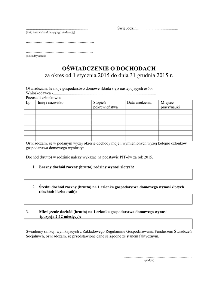 .............................................................. Świebodzin, ....................................... (imię i nazwisko składającego deklarację) .............................................................. ............................................................. (dokładny adres) OŚWIADCZENIE O DOCHODACH za okres od 1 stycznia 2015 do dnia 31 grudnia 2015 r. Oświadczam, że moje gospodarstwo domowe składa się z następujących osób: Wnioskodawca -...................................................................................................... Pozostali członkowie: Lp. Imię i nazwisko Stopień Data urodzenia pokrewieństwa Miejsce pracy/nauki Oświadczam, że w podanym wyżej okresie dochody moje i wymienionych wyżej kolejno członków gospodarstwa domowego wyniosły: Dochód (brutto) w rodzinie należy wykazać na podstawie PIT-ów za rok 2015. 1. Łączny dochód roczny (brutto) rodziny wynosi złotych: 2. Średni dochód roczny (brutto) na 1 członka gospodarstwa domowego wynosi złotych (dochód: liczba osób): 3. Miesięcznie dochód (brutto) na 1 członka gospodarstwa domowego wynosi (pozycja 2:12 miesięcy): Świadomy sankcji wynikających z Zakładowego Regulaminu Gospodarowania Funduszem Świadczeń Socjalnych, oświadczam, że przedstawione dane są zgodne ze stanem faktycznym. ................................................................ (podpis)