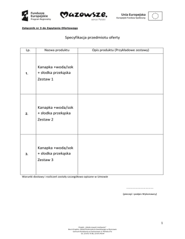 Załącznik nr 3 do Zapytania Ofertowego Specyfikacja przedmiotu oferty Lp. 1. Nazwa produktu Opis produktu (Przykładowe zestawy) Kanapka +woda/sok + słodka przekąska Zestaw 1 2. Kanapka +woda/sok + słodka przekąska Zestaw 2 3. Kanapka +woda/sok + słodka przekąska Zestaw 3 Warunki dostawy i rozliczeń zostały szczegółowo opisane w Umowie …………………………………… (pieczęć i podpis Wykonawcy) 1 Projekt: „Szkoła nowych możliwości” Biuro Projektu: Zakład Doskonalenia Zawodowego w Warszawie Centrum Kształcenia w Ciechanowie ul. Płońska 57a tel. 23 672 75 86, 23 672 46 64
