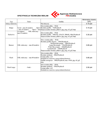 SPECYFIKACJA TECHNICZNA REKLAM Typ boksy tekstowe Image Exclusive Banner Flash Flash Large Tekst Grafika Nie dotyczy Max rozmiar pliku – 50 kb Tytuł – max 25 znaków Opis1 Rozmiar grafiki – 72x60 pikseli – max 35 znaków Opis2 – max Dopuszczalne formaty plików: jpg, png, tif, gif, bmp 35 znaków URL widoczny – Max rozmiar pliku – 50 kb max 35 znaków Rozmiar grafiki – 240x120, 125x125, 200x50, 140x120 pikseli Dopuszczalne formaty plików: jpg, png, tif, gif, bmp Minimalna stawka CPC 0.15 pkt 0.15 pkt 0.30 pkt Max. rozmiar pliku – 50 kb Rozmiar grafiki: Square – 250x250 pikseli Medium Restangle – 300x250 pikseli URL widoczny – max 40 znaków Large Rectangle – 336x280 pikseli Wide Skyscraper – 160x600 pikseli Leaderboard – 728x90 pikseli Dopuszczalne formaty plików: jpg, png, tif, gif, bmp 0.85 pkt Max rozmiar pliku – 40 kb Rozmiar animacji – 300x250 pikseli Format pliku: swf URL widoczny – max 40 znaków Dodatkowa warstwa z przyciskiem (button) Grafika zastępcza – 300x250 pikseli, max. 10 kb, jpg, tif, gif, png 0.85 pkt - brak - Max rozmiar pliku – 40 kb Rozmiar animacji – 550x350 pikseli Format pliku: swf Dodatkowa warstwa z przyciskiem (button) 2.50 pkt