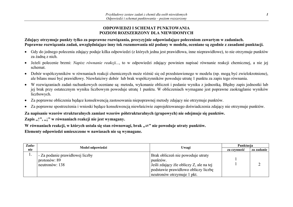 Przykładowy zestaw zadań z chemii dla osób niewidomych Odpowiedzi i schemat punktowania – poziom rozszerzony 1 ODPOWIEDZI I SCHEMAT PUNKTOWANIA POZIOM ROZSZERZONY DLA NIEWIDOMYCH Zdający otrzymuje punkty tylko za poprawne rozwiązania, precyzyjnie odpowiadające poleceniom zawartym w zadaniach. Poprawne rozwiązania zadań, uwzględniające inny tok rozumowania niż podany w modelu, oceniane są zgodnie z zasadami punktacji. • • • • • • Gdy do jednego polecenia zdający podaje kilka odpowiedzi (z których jedna jest prawidłowa, inne nieprawidłowe), to nie otrzymuje punktów za żadną z nich. Jeżeli polecenie brzmi: Napisz równanie reakcji..., to w odpowiedzi zdający powinien napisać równanie reakcji chemicznej, a nie jej schemat. Dobór współczynników w równaniach reakcji chemicznych może różnić się od przedstawionego w modelu (np. mogą być zwielokrotnione), ale bilans musi być prawidłowy. Niewłaściwy dobór lub brak współczynników powoduje utratę 1 punktu za zapis tego równania. W rozwiązaniach zadań rachunkowych oceniane są: metoda, wykonanie obliczeń i podanie wyniku z jednostką. Błędny zapis jednostki lub jej brak przy ostatecznym wyniku liczbowym powoduje utratę 1 punktu. W obliczeniach wymagane jest poprawne zaokrąglanie wyników liczbowych. Za poprawne obliczenia będące konsekwencją zastosowania niepoprawnej metody zdający nie otrzymuje punktów. Za poprawne spostrzeżenia i wnioski będące konsekwencją niewłaściwie zaprojektowanego doświadczenia zdający nie otrzymuje punktów. Za napisanie wzorów strukturalnych zamiast wzorów półstrukturalnych (grupowych) nie odejmuje się punktów. Zapis „↑”, „↓” w równaniach reakcji nie jest wymagany. W równaniach reakcji, w których ustala się stan równowagi, brak „⇄” nie powoduje utraty punktów. Elementy odpowiedzi umieszczone w nawiasach nie są wymagane. Zadanie 1. Model odpowiedzi - Za podanie prawidłowej liczby protonów: 89 neutronów: 138 Uwagi Brak obliczeń nie powoduje utraty punktów. Jeśli zdający źle obliczy Z, ale na tej podstawie prawidłowo obliczy liczbę neutronów otrzymuje 1 pkt. Punktacja za czynność za zadanie 1 1 2 Przykładowy zestaw zadań z chemii dla osób niewidomych Odpowiedzi i schemat punktowania – poziom rozszerzony 2 2. 3. a) – Za ustalenie liczb masowych: A pierwszego izotopu = 63 A drugiego izotopu = 65 b) - Za zastosowanie prawidłowej metody np. wzoru na średnią ważoną. - Za obliczenia i podanie poprawnego wyniku z jednostką: m(at) = 63,546 u Przykładowe rozwiązanie: 63 ⋅ 72,7 + 65 ⋅ 27,3 m(at) = [u] 100 m(at) = 63,546 u - Za zastosowanie prawidłowej metody łączącej dane z szukanymi. - Za obliczenia i podanie prawidłowego wyniku z jednostką: m CO2 ≈ 10,6 g lub 11 g Przykładowe rozwiązanie: I sposób m pV = RT M 1500 hPa ⋅ 4 dm 3 ⋅ 44 g ⋅ mol−1 = 10,58 g ≈ 10,6 g m= 83,14 hPa ⋅ dm 3 ⋅ K −1 ⋅ mol−1 ⋅ 300 K II sposób p 0 ⋅ V0 p ⋅ V = T0 T V0 = 273 K ⋅ 1500 hPa ⋅ 4 dm3 = 5,39 dm3 300 K ⋅ 1013 hPa 1 Uznaje się każde rozsądne przybliżenie, np. 63,5 lub 63,6 ale nie 64. 1 1 3 1 1 2 Przykładowy zestaw zadań z chemii dla osób niewidomych Odpowiedzi i schemat punktowania – poziom rozszerzony 3 5,39 dm3 = 0,24 mola 22,4 dm3 ⋅ mol−1 m CO2 = 0,24 mol · 44 g · mol-1 = 10,56 g ≈ 10,6 g n CO2 = 4. - Za podanie prawidłowych nazw pierwiastków: A – glin B – krzem 5. - Za napisanie równania reakcji: NaOH + H2SO4 → NaHSO4 + H2O 6. - Za napisanie równania reakcji: 2CuO + H2O + CO2 →(CuOH)2CO3 7. - Za napisanie równań reakcji: (T ) CaCO3↓ + CO2 + H2O I. Ca(HCO3)2 ⎯⎯→ II. Ca(HCO3)2 + Ca(OH)2 → 2CaCO3↓ + 2H2O 8. 9. - Za poprawne określenie charakteru chemicznego tlenków: SiO2 – kwasowy ZnO – amfoteryczny 1 1 1 1 1 1 2 1 1 2 1 1 Dopuszcza się odpowiedź: SiO2 -kwaśny - Za podanie prawidłowego wzoru lub prawidłowej nazwy odczynnika: (roztwór) H2SO4 lub (roztwór) kwasu siarkowego(VI) - Za napisanie równania reakcji: K2S + H2SO4 → K2SO4 + H2S↑ 1 10. - Za poprawne sformułowanie wniosku: (Wzrost temperatury powoduje) zmniejszenie (ilości powstającego N2O4) 1 11. - Za poprawne sformułowanie wniosku: Zwiększenie ciśnienia powoduje tworzenie większych ilości N2O4 lub zmniejszenie ciśnienia powoduje tworzenie mniejszych ilości N2O4. 1 1 2 1 1 Przykładowy zestaw zadań z chemii dla osób niewidomych Odpowiedzi i schemat punktowania – poziom rozszerzony 4 12. 13. - Za zastosowanie prawidłowej metody uwzględniającej obliczenie mas substancji i mas roztworów. - Za obliczenia i podanie prawidłowego wyniku z jednostką: cp = 20,27% lub 20% Przykładowe rozwiązanie: mr o stężeniu 3% = mrI = 20 cm3 · 1,02 g·cm-3 = 20,40 g mr o stężeniu 24% = mrII = 80 cm3 · 1,18 g·cm-3 = 94,40 g 3% ⋅ 20,40g = 0,612 g msI = 100% 24% ⋅ 94,40g msII = = 22,656 g 100% 0,612 g + 22,656 g cp = · 100% = 20,27% 20,40 g + 94,40 g - Za obliczenie masy chlorków w badanej wodzie (i porównanie jej z normą) lub przeliczenie normy na objętość próbki wody. - Za dokonanie oceny wody: Nadaje się do celów spożywczych. 1 1 2 Jeżeli zdający popełni błąd rachunkowy i sformułuje wniosek wynikający z obliczeń otrzymuje 1 punkt. 1 1 Przykładowe rozwiązania: I sposób (obliczenie masy chlorków w 1 dm3 badanej wody) 150 cm3 wody – 25 mg chlorków 1000 cm3 wody – X X= 1000 cm3 ⋅ 25 mg = 166,67 mg chlorków 150 cm3 (Porównanie z normą 166,67mg<250 mg) i wniosek II sposób (obliczenie masy chlorków w 150 cm3 badanej wody na podstawie normy) 1000 cm3 wody – 250 mg chlorków 150 cm3 wody – X 2 Przykładowy zestaw zadań z chemii dla osób niewidomych Odpowiedzi i schemat punktowania – poziom rozszerzony X= 14. 15. 150 cm3 ⋅ 250 mg = 37,5 mg chlorków 1000 cm3 (Porównanie 37,5 mg>25 mg) i wniosek - Za uszeregowanie płynów ustrojowych: 1, 4, 3, 2 lub sok trzustkowy, żółć, ślina, sok żołądkowy - Za napisanie r