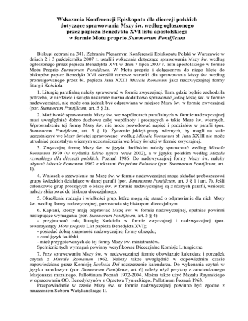 Wskazania Konferencji Episkopatu dla diecezji polskich dotyczące sprawowania Mszy św. według ogłoszonego przez papieża Benedykta XVI listu apostolskiego w formie Motu proprio Summorum Pontificum Biskupi zebrani na 341. Zebraniu Plenarnym Konferencji Episkopatu Polski w Warszawie w dniach 2 i 3 października 2007 r. ustalili wskazania dotyczące sprawowania Mszy św. według ogłoszonego przez papieża Benedykta XVI w dniu 7 lipca 2007 r. listu apostolskiego w formie Motu Proprio Summorum Pontificum. W Motu proprio i dołączonym do niego liście do biskupów papież Benedykt XVI określił ramowe warunki dla sprawowania Mszy św. według promulgowanego przez bł. papieża Jana XXIII Missale Romanum jako nadzwyczajnej formy liturgii Kościoła. 1. Liturgię parafialną należy sprawować w formie zwyczajnej. Tam, gdzie będzie zachodziła potrzeba, w niedziele i święta nakazane można dodatkowo sprawować jedną Mszę św. w formie nadzwyczajnej, nie może ona jednak być odprawiana w miejsce Mszy św. w formie zwyczajnej (por. Summorum Pontificum, art. 5 § 2). 2. Możliwość sprawowania Mszy św. we wspólnotach parafialnych w formie nadzwyczajnej musi uwzględniać dobro duchowe całej wspólnoty i proszących o takie Msze św. wiernych. Wprowadzenie tej formy Mszy św. nie może powodować napięć i podziałów w parafii (por. Summorum Pontificum, art. 5 § 1). Życzenie jakiejś grupy wiernych, by mogli na stałe uczestniczyć we Mszy świętej sprawowanej według Missale Romanum bł. Jana XXIII nie może utrudniać pozostałym wiernym uczestniczenia we Mszy świętej w formie zwyczajnej. 3. Zwyczajną formę Mszy św. w języku łacińskim należy sprawować według Missale Romanum 1970 (w wydaniu Editio typica tertia 2002), a w języku polskim według Mszału rzymskiego dla diecezji polskich, Poznań 1986. Do nadzwyczajnej formy Mszy św. należy używać Missale Romanum 1962 z tekstami Proprium Poloniae (por. Summorum Pontificum, art. 1). 4. Wniosek o zezwolenie na Mszę św. w formie nadzwyczajnej mogą składać proboszczowi grupy świeckich działające w danej parafii (por. Summorum Pontificum, art. 5 § 1 i art. 7). Jeśli członkowie grup proszących o Mszę św. w formie nadzwyczajnej są z różnych parafii, wniosek należy skierować do biskupa diecezjalnego. 5. Określenie rodzaju i wielkości grup, które mogą się starać o odprawianie dla nich Mszy św. według formy nadzwyczajnej, pozostawia się biskupom diecezjalnym. 6. Kapłani, którzy mają odprawiać Mszę św. w formie nadzwyczajnej, spełniać powinni następujące wymagania (por. Summorum Pontificum, art. 5 § 4): - przyjmować całą liturgię Kościoła w formie zwyczajnej i nadzwyczajnej (por. towarzyszący Motu proprio List papieża Benedykta XVI); - posiadać dobrą znajomość nadzwyczajnej formy obrzędu; - znać język łaciński; - mieć przygotowanych do tej formy Mszy św. ministrantów. Spełnienie tych wymagań powinny weryfikować Diecezjalne Komisje Liturgiczne. 7. Przy sprawowaniu Mszy św. w nadzwyczajnej formie obowiązuje kalendarz i porządek czytań z Missale Romanum 1962. Należy także uwzględnić w odpowiednim czasie zapowiedziane przez Komisję Ecclesia Dei rozszerzenie kalendarza. Do wykonania czytań w języku narodowym (por. Summorum Pontificum, art. 6) należy użyć perykop z zatwierdzonego lekcjonarza mszalnego, Pallottinum Poznań 1972-2004. Można także użyć Mszału Rzymskiego w opracowaniu OO. Benedyktynów z Opactwa Tynieckiego, Pallotinum Poznań 1963. Przepowiadanie w czasie Mszy św. w formie nadzwyczajnej powinno być zgodne z nauczaniem Soboru Watykańskiego II. 8. Biskupi diecezjalni nie widzą aktualnie potrzeby ustanawiania parafii personalnych dla sprawowania nadzwyczajnej formy obrządku rzymskiego (Summorum Pontificum, art. 10). 9. Celem sporządzenia po trzech latach przez biskupa diecezjalnego relacji na temat doświadczeń z wprowadzaniem w życie Motu proprio (por. towarzyszący Motu proprio List papieża Benedykta XVI) proboszczowie wzgl. rektorzy kościołów, w których zezwolono na Mszę św. w nadzwyczajnej formie, powinni informować o tym swego biskupa. 10. Przypominając wskazania Motu proprio należy rozważyć, czy w dużych miastach nie powinna być sprawowana jedna Eucharystia niedzielna w języku łacińskim według mszału Pawła VI. Są osoby, które chcą w takiej Mszy świętej uczestniczyć. W niektórych kościołach taka liturgia w języku łacińskim jest sprawowana i ogólnie dostępna dla wiernych. Wskazania obowiązują od 15 października 2007 r. + Arcybiskup Józef Michalik Przewodniczący Konferencji Episkopatu Polski + Bp Stefan Cichy Przewodniczący Komisji Episkopatu ds. Kultu Bożego i Dyscypliny Sakramentów. Warszawa, dnia 3 października 2007 r. 341. Zebranie Plenarne Konferencji Episkopatu Polski 2