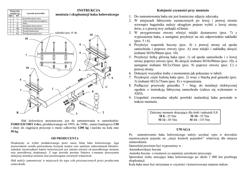 Oznaczenie zacisku wg ISO PN 1 L 2 + 3 31 4 R 5 58R 6 54 7 58L INSTRUKCJA montaŜu i eksploatacji haka holowniczego Łączenie przewodów Kierunkowskazy lewe Tylne światła przeciwmgłowe Masa Kierunkowskazy prawe Światła pozycyjne prawe Światła hamowania Światła pozycyjne lewe nakładka (poz. 5 i 6) 10 10 6 4 7 10 A 9 5 7 B C 1 8 3 2 Hak holowniczy przeznaczony jest do zamontowania w samochodzie: FORD ESCORT 4 drz., produkowanego od 1995r. do 1998r., numer katalogowy C05 i słuŜy do ciągnięcia przyczep o masie całkowitej 1200 kg i nacisku na kulę max 50 kg. OD PRODUCENTA Dziękujemy za wybór produkowanego przez naszą firmę haka holowniczego. Jego niezawodność została potwierdzona licznymi testami oraz opiniami zadowolonych klientów. JednakŜe niezawodność haków holowniczych jest zaleŜna równieŜ od prawidłowego montaŜu oraz prawidłowej eksploatacji. Z tego powodu prosimy Państwa o staranne przeczytanie niniejszej instrukcji montaŜu oraz przestrzeganie zawartych wskazówek. Hak naleŜy zamontować w miejscach do tego celu przeznaczonych przez producenta samochodu. Kolejność czynności przy montaŜu 1. Do zamontowania haka nie jest konieczne zdjęcie zderzaka. 2. W miejscach fabrycznie zaznaczonych po lewej i prawej stronie wewnątrz bagaŜnika naleŜy okrągłym prętem wybić z lewej strony dwie, a z prawej trzy zaślepki ø24mm. 3. W przygotowane otwory włoŜyć tulejki dystansowe (poz. 7) z wyposaŜenia haka, a następnie przyłoŜyć na nie odpowiednio nakładki (poz. 5 i 6). 4. PrzyłoŜyć wspornik boczny (poz. 4) z prawej strony od spodu samochodu i poprzez otwory (poz. A) oraz tulejki i nakładkę skręcić śrubami M10x90mm (poz. 10). 5. PrzyłoŜyć belkę główną haka (poz. 1) od spodu samochodu i z lewej strony poprzez otwory (poz. B) skręcić śrubami M10x90mm (poz. 10), a następnie śrubami M12x35mm (poz. 9) poprzez otwory (poz. C) z prawej strony. 6. Dokręcić wszystkie śruby z momentem jak pokazano w tabeli. 7. Przykręcić część kulistą haka (poz. 2) wraz z blachą pod gniazdo (poz. 3) śrubami M12x75mm (poz. 8) z wyposaŜenia. 8. Podłączyć przewody gniazdka 7 - bieg. do instalacji elektrycznej zgodnie z instrukcją fabryczną samochodu (zaleca się wykonanie w ASO). 9. Uzupełnić ewentualne ubytki powłoki malarskiej haka powstałe w trakcie montaŜu. Zalecany moment skręcający dla śrub i nakrętek 8,8: M 8 - 25 Nm M 10 - 55 Nm M 12 - 85 Nm M 14 - 135 Nm UWAGA Po zamontowaniu haka holowniczego naleŜy uzyskać wpis w dowodzie rejestracyjnym pojazdu na „stacji kontroli pojazdów” właściwej dla miejsca zamieszkania. Samochód powinien być wyposaŜony w : -kierunkowskazy boczne -lusterka boczne o rozstawie co najmniej szerokości przyczepy Sprawdzać śruby mocujące haka holowniczego po około 1 000 km przebiegu eksploatacji. Kula haka musi być utrzymana w czystości i konserwowana smarem stałym. PPUH AUTO-HAK S.J. WyposaŜenie haka: Produkcja Haków Holowniczych Henryk & Zbigniew Nejman 76-200 SŁUPSK ul. Słoneczna 16K tel/fax (059) 8-414-414; 8-414-413 E-mail: [email protected] www. autohak.com.pl Hak holowniczy bez wyposaŜenia elektrycznego Klasa: A50-X Nr kat. C05 Przeznaczony do zamontowania w samochodzie: Producent: FORD Model: ESCORT Typ: 4drz. produkowanym od 1995r. do 1998r. Dane techniczne: Wartość siły D : 6,64 kN maksymalna masa przyczepy: 1200 kg maksymalny nacisk na kulę: 50 kg Numer homologacji zgodnie z wytycznymi regulaminu EKG/ONZ 55.01: KARTA GWARANCYJNA Producent udziela gwarancji niniejszą kartą gwarancyjną na okres 24 miesięcy licząc od dnia zakupu haka holowniczego do samochodu: FORD ESCORT 4 drz. produkowanego od 1995r. do 1998r. Data produkcji .............................. Data zakupu............................................. Zakres gwarancji obejmuje wyłącznie wady jakościowe wynikające z winy producenta. Gwarancja nie obejmuje natomiast uszkodzeń zawinionych przez nabywcę, wynikających z niewłaściwego montaŜu, uŜytkowania lub konserwacji, uszkodzeń mechanicznych, normalnego zuŜycia podczas eksploatacji itp. Gwarancja udzielona na zakupiony towar nie wyłącza, nie ogranicza ani nie zawiesza uprawnień kupującego wynikających z niezgodności towaru z umową. Reklamacje naleŜy zgłaszać w punkcie sprzedaŜy, składając jednocześnie kartę gwarancyjną. Usunięcie "wady" następuje po stwierdzeniu przez punkt sprzedaŜy wspólnie z producentem słuszności złoŜonej reklamacji. Reklamacja powinna być załatwiona w ciągu 14 dni od dnia uznania reklamacji. Karta gwarancyjna jest niewaŜna jeŜeli nie jest wypełniona i podpisana. Data zgłoszenia reklamacji: ................................................................... INFORMACJA WSTĘPNA Hak holowniczy jest skonstruowany zgodnie z zasadami bezpieczeństwa ruchu drogowego. Hak holowniczy jest elementem wpływającym na bezpieczeństwo jazdy i moŜe zostać zainstalowany wyłącznie przez personel wyspecjalizowany. Niedopuszczalne jest dokonywanie jakichkolwiek zmian w konstrukcji haka. Powoduje to wygaśniecie dopuszczenia do stosowania. W przypadku obecności masy izolacyjnej lub osłony podwozia w miejscu przylegania haka, naleŜy ją usunąć. Nieosłonięte miejsca karoserii oraz wywiercone otwory naleŜy pomalować farbą antykorozyjną. Informacjami wiąŜącymi odnośnie wartości obciąŜeń są dane podawane przez producenta samochodu, względnie wartości maksymalnej masy przyczepy oraz maksymalnego nacisku na kulę, przy czym wartości parametrów haka holowniczego nie mogą być przekroczone. Wzór do obliczania wartości siły D: Maks. masa przyczepy [kg] x Maks. masa samochodu [kg] Maks. masa przyczepy [kg] + Maks. masa samochodu [kg] X 9,81 = 1000 D [kN]