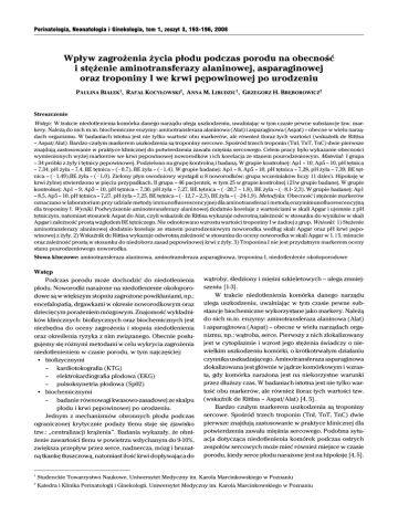 Perinatologia, Neonatologia i Ginekologia, tom 1, zeszyt 3, 193-196, 2008 Wpływ zagrożenia życia płodu podczas porodu na obecność i stężenie aminotransferazy alaninowej, asparaginowej oraz troponiny I we krwi pępowinowej po urodzeniu PAULINA BIAŁEK1, RAFAŁ KOCYŁOWSKI2, ANNA M. LIBUDZIC1, GRZEGORZ H. BRĘBOROWICZ2 Streszczenie Wstęp: W trakcie niedotlenienia komórka danego narządu ulega uszkodzeniu, uwalniając w tym czasie pewne substancje tzw. markery. Należą do nich m.in. biochemiczne enzymy: aminotransferaza alaninowa (Alat) i asparaginowa (Aspat) – obecne w wielu narządach organizmu. W badaniach istotna jest nie tylko wartość obu markerów, ale również iloraz tych wartości (wskaźnik de Rittisa – Aspat/Alat). Bardzo czułym markerem uszkodzenia są troponiny sercowe. Spośród trzech troponin (TnI, TnT, TnC) dwie pierwsze znajdują zastosowanie w praktyce klinicznej do potwierdzenia zawału mięśnia sercowego. Celem pracy było wykazanie obecności wymienionych wyżej markerów we krwi pępowinowej noworodków i ich korelacja ze stanem pourodzeniowym. Materiał: I grupa – 34 próbki z żyły i tętnicy pępowinowej. Podzielono na grupę kontrolną i badaną. W grupie kontrolnej: Ap1 – 10, Ap5 – 10, pH tętnica – 7,34, pH żyła – 7,4, BE tętnica – (!0,7), BE żyła – (!1,4). W grupie badanej: Ap1 – 8, Ap5 – 10, pH tętnica – 7,28, pH żyła – 7,39, BE tętnica – (!1,49),BE żyła – (!1,0). Zielony płyn owodniowy wystąpił u 8 noworodków; grupa wcześniaków liczy 11 dzieci. Hipoksję w krwi żylnej stwierdzono w pięciu przypadkach. II grupa – 46 pacjentek, w tym 25 w grupie kontrolnej i 21w grupie badanej. W grupie kontrolnej: Ap1 – 9, Ap5 – 10, pH tętnica – 7,30, pH żyła – 7,27, BE tętnica – (!20,7 – 1,8), BE żyła – (!8,1- 2,3). W grupie badanej: Ap1 – 8,5, Ap5 – 10, pH tętnica – 7,27, pH żyła – 7,25, BE tętnica – (!12,7 – 2,3), BE żyła – (!24-1,9). Metodyka: Obecność i stężenie markerów oznaczano w laboratorium przy udziale metody immunofluorescencyjnej dla aminotransferaz i metodą enzymimunofluorescencyjną dla troponiny I. Wyniki. Podwyższenie aminoteransferazy alaninowej dodatnio koreluje z wartościami w skali Apgar i ujemnie z pH tętniczym, natomiast stosunek Aspat do Alat, czyli wskaźnik de Rittisa wykazuje odwrotną zależność w stosunku do wyników w skali Apgar i zależność prostą względem BE tętniczego. Nie odnotowano wzrostu wartości troponiny I w żadnej z grup. Wnioski: 1) Stężenie aminotransferazy alaninowej dodatnio koreluje ze stanem pourodzeniowym noworodka według skali Apgar oraz pH krwi pępowinowej z żyły. 2) Wskaźnik de Rittisa wykazuje odwrotną zależność w stosunku do oceny noworodka w skali Apgar w 1. i 5. minucie oraz zależność prostą w stosunku do niedoboru zasad pępowinowej krwi z żyły. 3) Troponina I nie jest przydatnym markerem oceny stanu pourodzeniowego noworodka. Słowa kluczowe: aminotransferaza alaninowa, aminotransferaza asparaginowa, troponina I, niedotlenienie okołoporodowe Wstęp Podczas porodu może dochodzić do niedotlenienia płodu. Noworodki narażone na niedotlenienie okołoporodowe są w większym stopniu zagrożone powikłaniami, np.: encefalopatią, drgawkami w okresie noworodkowym oraz dziecięcym porażeniem mózgowym. Znajomość wykładników klinicznych: biofizycznych oraz biochemicznych jest niezbędna do oceny zagrożenia i stopnia niedotlenienia oraz określenia ryzyka z nim związanego. Obecnie posługujemy się różnymi metodami w celu wykrycia zagrożenia niedotlenieniem w czasie porodu, w tym najczęściej: C biofizycznymi – kardiotokografia (KTG) – elektrokardiografia płodowa (EKG) – pulsoksynetria płodowa (Sp02) C biochemicznymi – badanie równowagi kwasowo-zasadowej ze skalpu płodu i krwi pępowinowej po urodzeniu. Jednym z mechanizmów obronnych płodu podczas ograniczonej krytycznie podaży tlenu staje się zjawisko tzw.: „centralizacji krążenia”. Badania wykazały, że obniżenie zawartości tlenu w powietrzu wdychanym do 9-10%, zwiększa przepływ przez serce, nadnercza, mózg i brunatną tkankę tłuszczową, natomiast ilość krwi dopływająca do wątroby, śledziony i mięśni szkieletowych – ulega zmniejszeniu [1-3]. W trakcie niedotlenienia komórka danego narządu ulega uszkodzeniu, uwalniając w tym czasie pewne substancje biochemiczne wykorzystane jako markery. Należą do nich m.in. enzymy: aminotransferaza alaninowa (Alat) i asparaginowa (Aspat) – obecne w wielu narządach organizmu, np.: wątroba, serce. Pierwszy z nich zlokalizowany jest w cytoplazmie i wzrost jego stężenia świadczy o niewielkim uszkodzeniu komórki, o krótkotrwałym działaniu czynnika uszkadzającego. Aminotransferaza asparaginowa zlokalizowana jest głównie w jądrze komórkowym i wzrasta, gdy komórka narażona jest na niekorzystne warunki przez dłuższy czas. W badaniach istotna jest nie tylko wartość obu markerów, ale również iloraz tych wartości tzw. (wskaźnik de Rittisa – Aspat/Alat) [4, 5]. Bardzo czułym markerem uszkodzenia są troponiny sercowe. Spośród trzech troponin (TnI, TnT, TnC) dwie pierwsze znajdują zastosowanie w praktyce klinicznej dla potwierdzenia zawału mięśnia sercowego. Podobna sytuacja dotycząca niedotlenienia komórek podczas ostrych zespołów sercowych może mieć również miejsce w czasie porodu, kiedy serce płodu narażone jest na hipoksję [4, 5]. 1 Studenckie Towarzystwo Naukowe, Uniwersytet Medyczny im. Karola Marcinkowskiego w Poznaniu 2 Katedra i Klinika Perinatologii i Ginekologii, Uniwersytet Medyczny im. Karola Marcinkowskiego w Poznaniu 194 P. Białek, R. Kocyłowski, A. M. Libudzic, G. H. Bręborowicz Cel Ocena wpływu zagrożenia życia płodu w trakcie porodu na stężenie markerów uszkodzenia wątroby (aminotransferazy alaninowej – Alat, aminotransferazy asparaginowej – Aspat) i mięśnia sercowego (troponina 