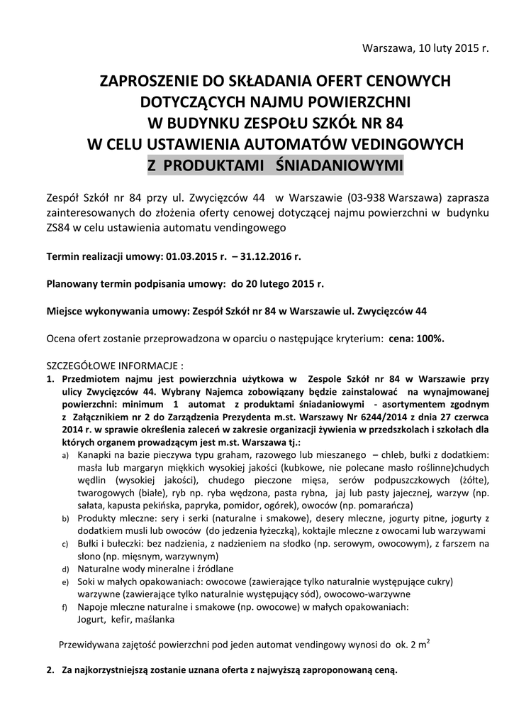 Warszawa, 10 luty 2015 r. ZAPROSZENIE DO SKŁADANIA OFERT CENOWYCH DOTYCZĄCYCH NAJMU POWIERZCHNI W BUDYNKU ZESPOŁU SZKÓŁ NR 84 W CELU USTAWIENIA AUTOMATÓW VEDINGOWYCH Z PRODUKTAMI ŚNIADANIOWYMI Zespół Szkół nr 84 przy ul. Zwycięzców 44 w Warszawie (03-938 Warszawa) zaprasza zainteresowanych do złożenia oferty cenowej dotyczącej najmu powierzchni w budynku ZS84 w celu ustawienia automatu vendingowego Termin realizacji umowy: 01.03.2015 r. – 31.12.2016 r. Planowany termin podpisania umowy: do 20 lutego 2015 r. Miejsce wykonywania umowy: Zespół Szkół nr 84 w Warszawie ul. Zwycięzców 44 Ocena ofert zostanie przeprowadzona w oparciu o następujące kryterium: cena: 100%. SZCZEGÓŁOWE INFORMACJE : 1. Przedmiotem najmu jest powierzchnia użytkowa w Zespole Szkół nr 84 w Warszawie przy ulicy Zwycięzców 44. Wybrany Najemca zobowiązany będzie zainstalować na wynajmowanej powierzchni: minimum 1 automat z produktami śniadaniowymi - asortymentem zgodnym z Załącznikiem nr 2 do Zarządzenia Prezydenta m.st. Warszawy Nr 6244/2014 z dnia 27 czerwca 2014 r. w sprawie określenia zaleceń w zakresie organizacji żywienia w przedszkolach i szkołach dla których organem prowadzącym jest m.st. Warszawa tj.: a) Kanapki na bazie pieczywa typu graham, razowego lub mieszanego – chleb, bułki z dodatkiem: masła lub margaryn miękkich wysokiej jakości (kubkowe, nie polecane masło roślinne)chudych wędlin (wysokiej jakości), chudego pieczone mięsa, serów podpuszczkowych (żółte), twarogowych (białe), ryb np. ryba wędzona, pasta rybna, jaj lub pasty jajecznej, warzyw (np. sałata, kapusta pekińska, papryka, pomidor, ogórek), owoców (np. pomarańcza) b) Produkty mleczne: sery i serki (naturalne i smakowe), desery mleczne, jogurty pitne, jogurty z dodatkiem musli lub owoców (do jedzenia łyżeczką), koktajle mleczne z owocami lub warzywami c) Bułki i bułeczki: bez nadzienia, z nadzieniem na słodko (np. serowym, owocowym), z farszem na słono (np. mięsnym, warzywnym) d) Naturalne wody mineralne i źródlane e) Soki w małych opakowaniach: owocowe (zawierające tylko naturalnie występujące cukry) warzywne (zawierające tylko naturalnie występujący sód), owocowo-warzywne f) Napoje mleczne naturalne i smakowe (np. owocowe) w małych opakowaniach: Jogurt, kefir, maślanka Przewidywana zajętość powierzchni pod jeden automat vendingowy wynosi do ok. 2 m2 2. Za najkorzystniejszą zostanie uznana oferta z najwyższą zaproponowaną ceną. 3. ZS 84 wymaga ubezpieczenia OC oferenta w zakresie związanym z prowadzoną działalnością gospodarczą ze wskazaniem odpowiedzialności deliktowej, tj. za szkody wyrządzone w mieniu i na osobie ( polisa powinna wynosić na łączną kwotę nie niższą niż 100.000 zł) 4. Minimalne stawki miesięczne za najem powierzchni pod automat wynosi: 300 zł brutto/ automat /miesięcznie Czynsz za najem ustalony będzie w formie opłat miesięcznych. Minimalne stawki czynszu za najem podane przez ZS84 jw. zawierają zryczałtowane koszty zużycia mediów (zużycie energii elektrycznej, dostarczanie wody zimnej i odprowadzanie ścieków) oraz koszty z tytułu wywozu śmieci. 5. 6. 7. b) 8. 9. Oferty mogą składać podmioty prowadzące działalność gospodarczą niezależnie od formy organizacyjnej (osoby prawne, jednostki organizacyjne nie posiadające osobowości prawnej, osoby fizyczne prowadzące działalność gospodarczą). Każdy z oferentów może złożyć tylko jedną ofertę. Oferta powinna zawierać: a) wypełniony formularz oferty podpisany przez uprawnioną osobę ( wzór w załączeniu do ogłoszenia ) , kopię aktualnej polisy OC potwierdzającej ubezpieczenie oferenta w zakresie związanym z prowadzoną działalnością ze wskazaniem odpowiedzialności deliktowej, tj. za szkody wyrządzone w mieniu i na osobie; uwaga: polisa powinna potwierdzać ubezpieczenie oferenta albo na łączną kwotę nie niższą niż 100.000 zł Oferty należy składać osobiście do dnia 18 lutego 2015 r. do godziny 15:00: w sekretariacie Zespołu Szkół nr 84 w Warszawie przy ul. Zwycięzców 44 (kod pocztowy: 03-938 Warszawa), Uwagi: 1. Oferta powinna być złożona w zamkniętej kopercie oraz wyraźnie opisana: „Oferta na najem powierzchni w obiektach ZS84 w celu ustawienia automatu vendingowego z produktami śniadaniowymi. Nie otwierać przed godz. 15.10 w dniu 18 lutego 2015 r.” 2. Złożonej pisemnie oferty cenowej nie można zmienić 3. Oferty złożone po terminie oraz oferty niekompletne nie będą brane pod uwagę przez ZS84. W przypadku równorzędności ofert, ZS84 przeprowadzi dodatkowe postępowanie. O terminie i formie dodatkowego postepowania Zespół Szkół nr 84 poinformuje Oferentów przedstawiających najkorzystniejsze cenowo oferty. 10. Dyrekcja Zespołu Szkół nr 84 w Warszawie zastrzega sobie możliwość unieważnienia lub odwołania konkursu ofert na każdym jego etapie bez podania przyczyny, a oferentom nie przysługują z tego tytułu jakiekolwiek roszczenia. Kontakt w sprawie szczegółów konkursu ofert: Marcin Łajca Kierownik gospodarczy ZS84 e-mail: [email protected] , tel. (22) 617 63 28 Termin składania ofert: 18 luty 2015 r. do godziny 15:00 Anna Tkaczyk Dyrektor Zespołu Szkół Nr 84 w Warszawie OFERTA CENOWA dotycząca najmu powierzchni użytkowych w Zespole Szkół nr 84 w celu ustawienia automatów vendingowych z produktami śniadaniowymi Ja niżej podpisana/-y ..................................................................................................................................... działając w imieniu i na rzecz (nazwa firmy) ................................................................................................ ......................................................................................................................................................................... NIP....................................................................... REGON: .........