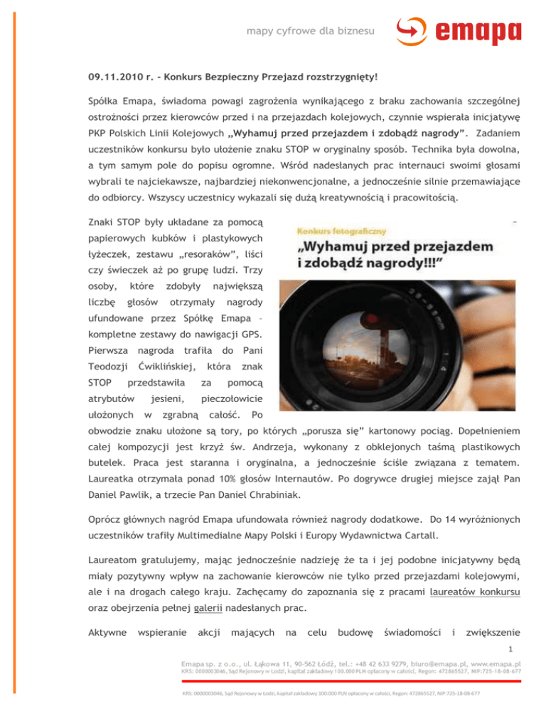 mapy cyfrowe dla biznesu 09.11.2010 r. - Konkurs Bezpieczny Przejazd rozstrzygnięty! Spółka Emapa, świadoma powagi zagroŜenia wynikającego z braku zachowania szczególnej ostroŜności przez kierowców przed i na przejazdach kolejowych, czynnie wspierała inicjatywę PKP Polskich Linii Kolejowych „Wyhamuj przed przejazdem i zdobądź nagrody”. Zadaniem uczestników konkursu było ułoŜenie znaku STOP w oryginalny sposób. Technika była dowolna, a tym samym pole do popisu ogromne. Wśród nadesłanych prac internauci swoimi głosami wybrali te najciekawsze, najbardziej niekonwencjonalne, a jednocześnie silnie przemawiające do odbiorcy. Wszyscy uczestnicy wykazali się duŜą kreatywnością i pracowitością. Znaki STOP były układane za pomocą papierowych kubków i plastykowych łyŜeczek, zestawu „resoraków”, liści czy świeczek aŜ po grupę ludzi. Trzy osoby, które liczbę głosów zdobyły największą otrzymały nagrody ufundowane przez Spółkę Emapa – kompletne zestawy do nawigacji GPS. Pierwsza nagroda trafiła do Pani Teodozji STOP Ćwiklińskiej, która przedstawiła atrybutów ułoŜonych za jesieni, w znak pomocą pieczołowicie zgrabną całość. Po obwodzie znaku ułoŜone są tory, po których „porusza się” kartonowy pociąg. Dopełnieniem całej kompozycji jest krzyŜ św. Andrzeja, wykonany z obklejonych taśmą plastikowych butelek. Praca jest staranna i oryginalna, a jednocześnie ściśle związana z tematem. Laureatka otrzymała ponad 10% głosów Internautów. Po dogrywce drugiej miejsce zajął Pan Daniel Pawlik, a trzecie Pan Daniel Chrabiniak. Oprócz głównych nagród Emapa ufundowała równieŜ nagrody dodatkowe. Do 14 wyróŜnionych uczestników trafiły Multimedialne Mapy Polski i Europy Wydawnictwa Cartall. Laureatom gratulujemy, mając jednocześnie nadzieję Ŝe ta i jej podobne inicjatywny będą miały pozytywny wpływ na zachowanie kierowców nie tylko przed przejazdami kolejowymi, ale i na drogach całego kraju. Zachęcamy do zapoznania się z pracami laureatów konkursu oraz obejrzenia pełnej galerii nadesłanych prac. Aktywne wspieranie akcji mających na celu budowę świadomości i zwiększenie 1 Emapa sp. z o.o., ul. Łąkowa 11, 90-562 Łódź, tel.: +48 42 633 9279, [email protected], www.emapa.pl KRS: 0000003046, Sąd Rejonowy w Łodzi, kapitał zakładowy 100.000 PLN opłacony w całości, Regon: 472865527, NIP:725-18-08-677 mapy cyfrowe dla biznesu bezpieczeństwa podróŜujących w przypadku Emapy nie kończy się na pozostaniu partnerem konkursu. W celu wcześniejszego ostrzegania kierowców o występowaniu przejazdów kolejowych, Spółka Emapa rozszerzyła zestaw swoich atrybutów mapowych o bazę ponad 13 000 przejazdów z wyróŜnieniem strzeŜonych i niestrzeŜonych oraz podziałem na 4 szczegółowe kategorie A, B, C, D wyszczególnione przez PKP Polskie Linie Kolejowe S.A. Poszczególne grupy informują o występowaniu rogatek, sygnalizacji świetlnej czy natęŜeniu ruchu w miejscu danego przejazdu. Wśród przejazdów kolejowych znajdują się równieŜ przejazdy niezdefiniowane, czyli takie dla których brak jest odpowiednich danych. Najczęściej są to nieaktywne szlaki kolejowe. Informacje o przejazdach zaimplementowane w produktach Spółki Emapa z pewnością zwiększają bezpieczeństwo na drogach, a takŜe mogą przyczynić się do znacznej oszczędności czasu dojazdu do wybranego punktu. Zachęcamy do zapoznania się z tym innymi atrybutami mapowymi na www.emapi.pl. Kontakt dla mediów: Marcin Maroszek MenedŜer ds. Projektów Marketingowych i PR [email protected] tel. kom.: +48 693 356 128 INFORMACJE DODATKOWE: Emapa Spółka Emapa powstała w 2001 roku jako spółka-córka firmy Cartall – jednego z najdłuŜej działających w Polsce Wydawnictw Multimedialnych. Celem Spółki Emapa od samego początku było zaspokojenie coraz bardziej wyspecjalizowanych potrzeb klientów w zakresie profesjonalnych systemów logistycznych i systemów informacji przestrzennej oraz wysokiej jakości map cyfrowych. Efektem pracy zespołu specjalistów GIS jest rodzina systemów Emapa, tworzonych przy uwzględnieniu specyfiki poszczególnych branŜ. Asortyment Spółki Emapa obejmuje same dane cyfrowe (najdokładniejsza mapa Polski, kompletna mapa Europy i przejazdowa mapa Azji), zaawansowaną technologię umoŜliwiającą ich wykorzystywanie zgodnie z potrzebami Klienta (serwer MapCenter), jednostanowiskowe aplikacje do profesjonalnego wytyczania tras, współpracy z monitoringiem (Emapa Transport+, Emapa Emapa sp. z o.o., ul. Łąkowa 11, 90-562 Łódź, tel.: +48 42 633 9279, [email protected], www.emapa.pl KRS: 0000003046, Sąd Rejonowy w Łodzi, kapitał zakładowy 100.000 PLN opłacony w całości, Regon: 472865527, NIP:725-18-08-677 2 mapy cyfrowe dla biznesu Transport Europa, Emapa Transport+ Europa) analiz geoprzestrzennych (Emapa GeoMarketing) oraz ich sieciowe odpowiedniki (seria GeoNet). Priorytetem biznesowym Emapy są zaawansowane technologicznie rozwiązania dla wymagającego klienta biznesowego. Więcej informacji o firmie moŜna uzyskać na stronie www.emapa.pl. 3 Emapa sp. z o.o., ul. Łąkowa 11, 90-562 Łódź, tel.: +48 42 633 9279, [email protected], www.emapa.pl KRS: 0000003046, Sąd Rejonowy w Łodzi, kapitał zakładowy 100.000 PLN opłacony w całości, Regon: 472865527, NIP:725-18-08-677