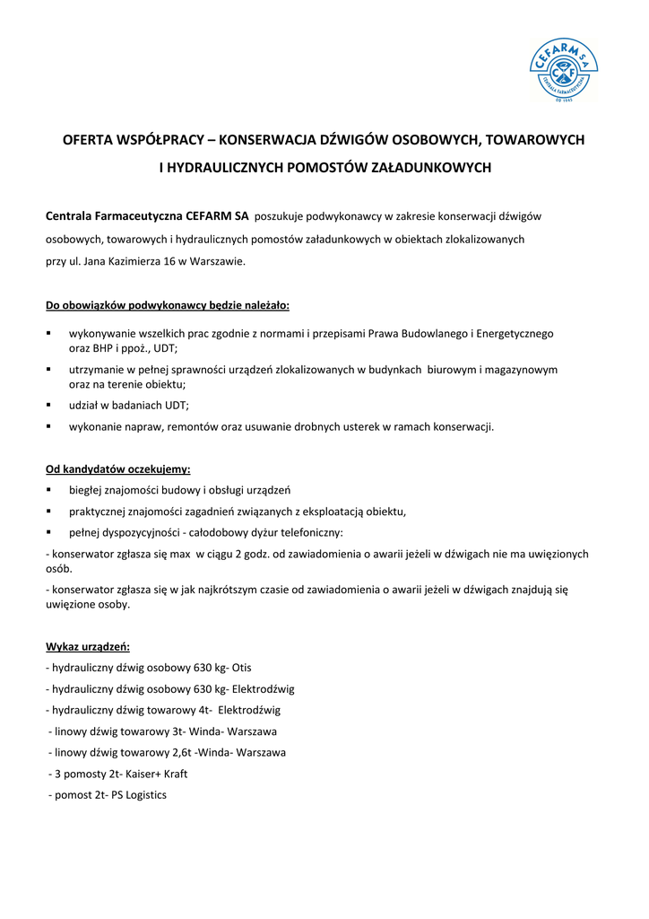 OFERTA WSPÓŁPRACY – KONSERWACJA DŹWIGÓW OSOBOWYCH, TOWAROWYCH I HYDRAULICZNYCH POMOSTÓW ZAŁADUNKOWYCH Centrala Farmaceutyczna CEFARM SA poszukuje podwykonawcy w zakresie konserwacji dźwigów osobowych, towarowych i hydraulicznych pomostów załadunkowych w obiektach zlokalizowanych przy ul. Jana Kazimierza 16 w Warszawie. Do obowiązków podwykonawcy będzie należało: wykonywanie wszelkich prac zgodnie z normami i przepisami Prawa Budowlanego i Energetycznego oraz BHP i ppoż., UDT; utrzymanie w pełnej sprawności urządzeń zlokalizowanych w budynkach biurowym i magazynowym oraz na terenie obiektu; udział w badaniach UDT; wykonanie napraw, remontów oraz usuwanie drobnych usterek w ramach konserwacji. Od kandydatów oczekujemy: biegłej znajomości budowy i obsługi urządzeń praktycznej znajomości zagadnień związanych z eksploatacją obiektu, pełnej dyspozycyjności - całodobowy dyżur telefoniczny: - konserwator zgłasza się max w ciągu 2 godz. od zawiadomienia o awarii jeżeli w dźwigach nie ma uwięzionych osób. - konserwator zgłasza się w jak najkrótszym czasie od zawiadomienia o awarii jeżeli w dźwigach znajdują się uwięzione osoby. Wykaz urządzeń: - hydrauliczny dźwig osobowy 630 kg- Otis - hydrauliczny dźwig osobowy 630 kg- Elektrodźwig - hydrauliczny dźwig towarowy 4t- Elektrodźwig - linowy dźwig towarowy 3t- Winda- Warszawa - linowy dźwig towarowy 2,6t -Winda- Warszawa - 3 pomosty 2t- Kaiser+ Kraft - pomost 2t- PS Logistics Oferty współpracy prosimy kierować: - listownie – na adres: Centrala Farmaceutyczna CEFARM SA ul. Jana Kazimierza 16, 01-248 Warszawa z dopiskiem: Dział Dystrybucji i Infrastruktury – konserwacja dźwigów - drogą elektroniczną – na adres: [email protected] oraz [email protected] Oferta współpracy powinna zawierać: - podstawowe informacje o firmie (dane firmy, od kiedy funkcjonuje na rynku, ilość pracowników), - potwierdzenie wymaganych uprawnień, - referencje, - propozycję miesięcznej stawki ryczałtowej. Przed złożeniem oferty współpracy umożliwiamy wizytację obiektu – po telefonicznym uzgodnieniu z Zespołem Technicznym pod nr tel.: 22 63 40 399 w godz. 7:00 – 15:00