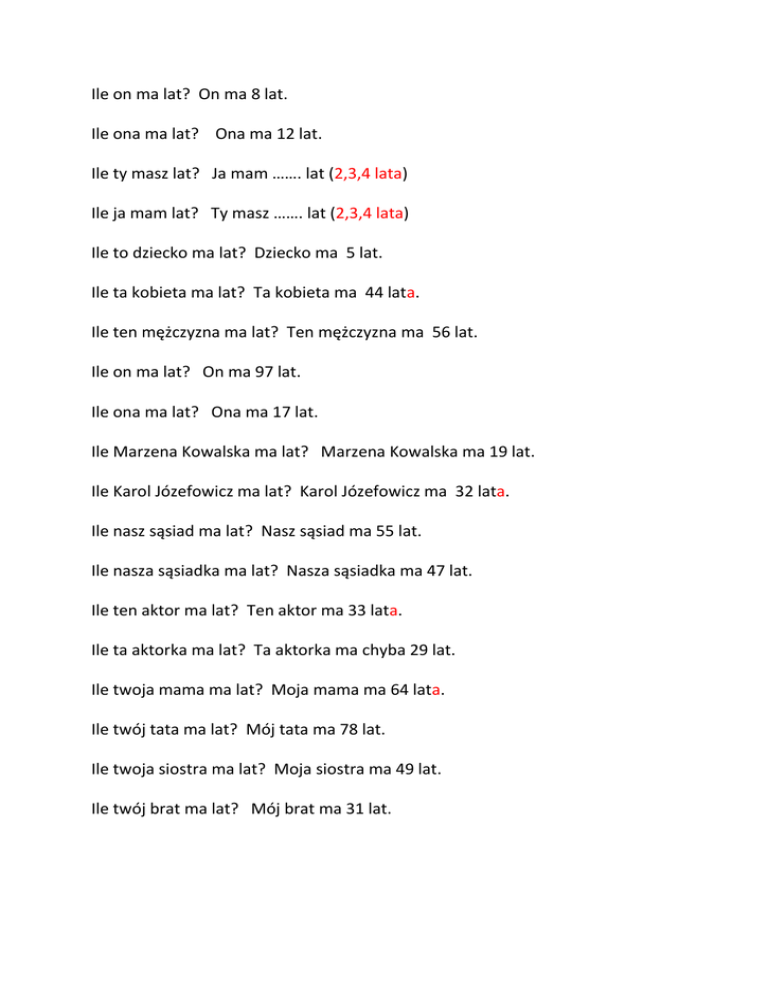 Ile on ma lat? On ma 8 lat. Ile ona ma lat? Ona ma 12 lat. Ile ty masz lat? Ja mam ……. lat (2,3,4 lata) Ile ja mam lat? Ty masz ……. lat (2,3,4 lata) Ile to dziecko ma lat? Dziecko ma 5 lat. Ile ta kobieta ma lat? Ta kobieta ma 44 lata. Ile ten mężczyzna ma lat? Ten mężczyzna ma 56 lat. Ile on ma lat? On ma 97 lat. Ile ona ma lat? Ona ma 17 lat. Ile Marzena Kowalska ma lat? Marzena Kowalska ma 19 lat. Ile Karol Józefowicz ma lat? Karol Józefowicz ma 32 lata. Ile nasz sąsiad ma lat? Nasz sąsiad ma 55 lat. Ile nasza sąsiadka ma lat? Nasza sąsiadka ma 47 lat. Ile ten aktor ma lat? Ten aktor ma 33 lata. Ile ta aktorka ma lat? Ta aktorka ma chyba 29 lat. Ile twoja mama ma lat? Moja mama ma 64 lata. Ile twój tata ma lat? Mój tata ma 78 lat. Ile twoja siostra ma lat? Moja siostra ma 49 lat. Ile twój brat ma lat? Mój brat ma 31 lat.