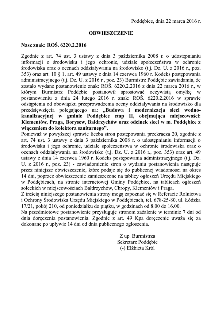 Poddębice, dnia 22 marca 2016 r. OBWIESZCZENIE Nasz znak: ROŚ. 6220.2.2016 Zgodnie z art. 74 ust. 3 ustawy z dnia 3 października 2008 r. o udostępnianiu informacji o środowisku i jego ochronie, udziale społeczeństwa w ochronie środowiska oraz o ocenach oddziaływania na środowisko (t.j. Dz. U. z 2016 r., poz. 353) oraz art. 10 § 1, art. 49 ustawy z dnia 14 czerwca 1960 r. Kodeks postępowania administracyjnego (t.j. Dz. U. z 2016 r., poz. 23) Burmistrz Poddębic zawiadamia, że zostało wydane postanowienie znak: ROŚ. 6220.2.2016 z dnia 22 marca 2016 r., w którym Burmistrz Poddębic postanowił sprostować oczywistą omyłkę w postanowieniu z dnia 24 lutego 2016 r. znak: ROŚ. 6220.2.2016 w sprawie odstąpienia od obowiązku przeprowadzenia oceny oddziaływania na środowisko dla przedsięwzięcia polegającego na: „Budowa i modernizacja sieci wodnokanalizacyjnej w gminie Poddębice etap II, obejmująca miejscowości: Klementów, Praga, Borysew, Bałdrzychów oraz odcinek sieci w m. Poddębice z włączeniem do kolektora sanitarnego”. Ponieważ w powyższej sprawie liczba stron postępowania przekracza 20, zgodnie z art. 74 ust. 3 ustawy z dnia 3 października 2008 r. o udostępnianiu informacji o środowisku i jego ochronie, udziale społeczeństwa w ochronie środowiska oraz o ocenach oddziaływania na środowisko (t.j. Dz. U. z 2016 r., poz. 353) oraz art. 49 ustawy z dnia 14 czerwca 1960 r. Kodeks postępowania administracyjnego (t.j. Dz. U. z 2016 r., poz. 23) - zawiadomienie stron o wydaniu postanowienia następuje przez niniejsze obwieszczenie, które podaje się do publicznej wiadomości na okres 14 dni, poprzez obwieszczenie zamieszczone na tablicy ogłoszeń Urzędu Miejskiego w Poddębicach, na stronie internetowej Gminy Poddębice, na tablicach ogłoszeń sołeckich w miejscowościach Bałdrzychów, Chropy, Klementów i Praga. Z treścią niniejszego postanowienia strony mogą zapoznać się w Referacie Rolnictwa i Ochrony Środowiska Urzędu Miejskiego w Poddębicach, tel. 678-25-80, ul. Łódzka 17/21, pokój 210, od poniedziałku do piątku, w godzinach od 8.00 do 16.00. Na przedmiotowe postanowienie przysługuje stronom zażalenie w terminie 7 dni od dnia doręczenia postanowienia. Zgodnie z art. 49 Kpa doręczenie uważa się za dokonane po upływie 14 dni od dnia publicznego ogłoszenia. Z up. Burmistrza Sekretarz Poddębic (-) Elżbieta Król