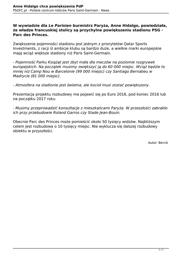 Anne Hidalgo chce powiększenia PdP PSGFC.pl - Polskie centrum kibiców Paris Saint-Germain - News W wywiadzie dla Le Parisien burmistrz Paryża, Anne Hidalgo, powiedziała, że władze francuskiej stolicy są przychylne powiększeniu stadionu PSG Parc des Princes. Zwiększenie pojemności stadionu jest jednym z priorytetów Qatar Sports Investments, z racji iż ambicje klubu są bardzo duże, a wielkie marki europejskie mają wciąż większe stadiony niż Paris Saint-Germain. - Pojemność Parku Książąt jest zbyt mała dla meczów na poziomie rozgrywek europejskich. Na początek musimy zwiększyć ją do 60 000 miejsc. Wciąż będzie to mniej niż Camp Nou w Barcelonie (99 000 miejsc) czy Santiago Bernabeu w Madrycie (81 000 miejsc). - Atmosfera na stadionie jest świetna, ale kocioł musi zostać powiększony. Prezentacja projektu rozbudowy ma pojawić się po Euro 2016, pod koniec 2016 lub na początku 2017 roku. - Musimy przeprowadzić konsultacje z mieszkańcami Paryża. W przeszłości zabrakło ich przy przebudowie Roland Garros czy Stade Jean-Bouin. Obecnie Parc des Princes może pomieścić około 50 tysięcy widzów. Najbliższym celem jest rozbudowa o 10 tysięcy miejsc. Nie wyklucza się dalszej rozbudowy obiektu w przyszłości. Autor: Bercik 1/1 Powered by TCPDF (www.tcpdf.org)