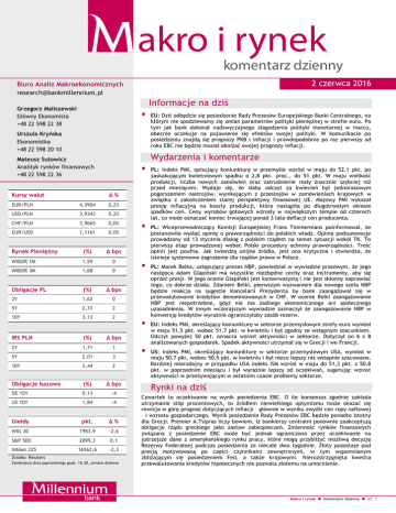 2 czerwca 2016 Biuro Analiz Makroekonomicznych [email protected] Informacje na dziś Grzegorz Maliszewski Główny Ekonomista +48 22 598 22 38 Urszula Kryńska Ekonomistka +48 22 598 20 10 Wydarzenia i komentarze Mateusz Sutowicz Analityk rynków finansowych +48 22 598 22 36 Kursy walut EU: Dziś odbędzie się posiedzenie Rady Prezesów Europejskiego Banki Centralnego, na którym nie spodziewamy się zmian parametrów polityki pieniężnej w strefie euro. Po tym jak bank dokonał nadzwyczajnego złagodzenia polityki monetarnej w marcu, obecnie oczekuje na pojawienie się efektów swojej polityki. W komunikacie po posiedzeniu znajdą się prognozy PKB i inflacji i prawdopodobnie po raz pierwszy od roku EBC nie będzie musiał obniżać swojej prognozy inflacji. Δ% EUR/PLN 4,3904 0,2% USD/PLN 3,9343 0,2% CHF/PLN 3,9665 0,0% EUR/USD 1,1161 0,0% Rynek Pieniężny (%) Δ bps WIBOR 1M 1,59 0 WIBOR 3M 1,68 0 Obligacje PL (%) Δ bps 2Y 1,62 0 5Y 2,33 2 10Y 3,13 2 IRS PLN (%) Δ bps 2Y 1,71 1 5Y 2,01 3 10Y 2,44 2 Obligacje bazowe (%) Δ bps DE 10Y 0,13 -4 US 10Y 1,84 -4 Giełdy pkt. Δ% WIG 30 1953,9 -2,6 S&P 500 2099,3 0,1 Nikkei 225 16562,6 -2,3 Źródło: Reuters Zamknięcia dnia poprzedniego godz. 16.30, zmiana dzienna PL: Indeks PMI, opisujący koniunkturę w przemyśle wzrósł w maju do 52,1 pkt. po zaskakującym kwietniowym spadku o 2,8 pkt. proc., do 51 pkt. W maju wielkość produkcji, liczba nowych zamówień oraz zatrudnienie rosły znacznie szybciej niż przed miesiącem. Wydaje się, że słaby odczyt za kwiecień był jednorazowym pogorszeniem nastrojów, wynikającym z przestojów w zamówieniach krajowych w związku z zakończeniem starej perspektywy finansowej UE. Majowy PMI wykazał presję inflacyjną na koszty produkcji, która nastąpiła po długotrwałym okresie spadków cen. Ceny wyrobów gotowych wzrosły w największym tempie od czterech lat, co może oznaczać koniec trwającej ponad 3 lata deflacji cen producenta. PL: Wiceprzewodniczący Komisji Europejskiej Frans Timmermans poinformował, że postanowiła wysłać opinię o praworządności do polskich władz. Opinia podsumowuje prowadzony od 13 stycznia dialog z polskim rządem na temat sytuacji wokół TK. To pierwszy etap prowadzonej wobec Polski procedury ochrony praworządności. Treść opinii jest poufna. Jak twierdzą unijne źródła, jest ona krytyczna i stwierdza, że istnieje systemowe zagrożenie dla rządów prawa w Polsce. PL: Marek Belka, ustępujący prezes NBP, powiedział w wywiadzie prasowym, że jego następca Adam Glapiński ma wszystkie niezbędne cechy oraz instrumenty, aby się oprzeć presji. W jego ocenie Glapiński jest konserwatystą i nie jest skłonny naprawiać tego, co dobrze działa. Zdaniem Belki, pierwszym wyzwaniem dla nowego szefa NBP będzie reakcja na sugestie Kancelarii Prezydenta by bank zaangażował się w przewalutowanie kredytów denominowanych w CHF. W ocenie Belki zaangażowanie NBP jest niepotrzebne, gdyż nie ma żadnego ekonomicznego ani społecznego uzasadnienia. W innym wczorajszym wywiadzie zaznaczył że zaangażowanie NBP w konwersję kredytów wyraźnie ograniczyłoby zasób rezerw. EU: Indeks PMI, określający koniunkturę w sektorze przemysłowym strefy euro wyniósł w maju 51,5 pkt. wobec 51,7 pkt. w kwietniu i był zgodny ze wstępnym szacunkiem. Odczyt powyżej 50 pkt. oznacza wzrost aktywności w sektorze. Dotyczył on 6 z 8 analizowanych gospodarek. Spadek aktywności utrzymał się w Grecji i we Francji. US: Indeks PMI, określający koniunkturę w sektorze przemysłowym USA, wyniósł w maju 50,7 pkt. wobec 50,5 pkt. w kwietniu i był nieco lepszy niż wstępnie szacowano. Bardziej miarodajny w przypadku USA indeks ISM wzrósł w maju do 51,3 pkt. z 50,8 pkt. w poprzednim miesiącu i był wyraźnie lepszy od oczekiwań, sugerując wzrost aktywności w przeżywającym w ostatnim czasie problemy sektorze. Rynki na dziś Czwartek to oczekiwanie na wynik posiedzenia EBC. O ile konsensus zgodnie zakłada utrzymanie stóp procentowych, to źródłem niewielkiego optymizmu może okazać się rewizja w górę prognoz dotyczących inflacji – głównie w wyniku zwyżki cen ropy naftowej – i wzrostu gospodarczego. Wynik posiedzenia Rady Prezesów EBC będzie ponadto istotny dla Grecji. Premier A.Tsipras liczy bowiem, iż bankierzy centralni ponownie zaakceptują obligacje rządu greckiego jako zastaw zabezpieczeń. Zmienność rynków finansowych związana z posiedzenie EBC może być jednak ograniczona przez oczekiwanie na jutrzejsze dane z amerykańskiego rynku pracy, które mogą przybliżyć możliwą decyzję Rezerwy Federalnej podczas posiedzenia za niecałe dwa tygodnie. Złoty pozostaje pod presją motywowaną po części czynnikami zewnętrznymi, w tym wspomnianym zbliżającym się posiedzeniem Fed, a także krajowymi. Nierozstrzygnięta kwestia przewalutowania kredytów hipotecznych nie pozwala złotemu na umocnienie. `Makro i rynek komentarz dzienny str. 1 Rynek krajowy Kursy walutowe EUR/PLN i EUR/USD 4,50 1,16 4,45 1,14 4,40 1,12 4,35 1,10 4,30 4,25 1,08 4,20 1,06 EURPLN EURUSD /prawa skala/ Źródło: Reuters Złoty słabszy we wtorek głównie na skutek czynników krajowych. Polskiej walucie nie sprzyjało bowiem przyjęcie przez Komisję Europejską, choć oczekiwane, prawdopodobnie krytycznej opinii w sprawie praworządności w Polsce. Nie bez znaczenia dla osłabienia złotego była ponadto wypowiedź M.Belki, który przestrzegł przed możliwością sięgnięcia po rezerwy walutowe NBP, by zrealizować ustawę dotyczącą konwersji kredytów fx. W rezultacie kurs EUR/PLN przejściowo wzrósł do niemal 4,40 przy relatywnie stabilnych notowaniach tureckiej liry, czy węgierskiego forinta. Na krajowym rynku czwartek zakończył się nieznacznym wystromieniem krzywej SPW na skutek stabilizacji krótkiego końca i niewielkiego wzrostu obligacji o 10-letnim terminie zapadalności. Wczorajsza sesja to druga z rzędu gwałtowna przecena polsk