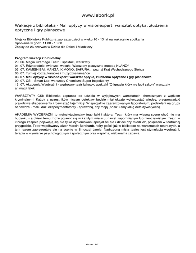 www.lebork.pl Wakacje z biblioteką - Mali optycy w visionexpert: warsztat optyka, złudzenia optyczne i gry planszowe Miejska Biblioteka Publiczna zaprasza dzieci w wieku 10 - 13 lat na wakacyjne spotkania Spotkania w godz. 11.00 - 13.00 Zapisy do 26 czerwca w Dziale dla Dzieci i Młodzieży Program wakacji z biblioteką: 29. 06. Magia Czarnego Teatru: spektakl, warsztaty 01. 07. Różnorodnie, twórczo i wesoło. Warsztaty plastyczne metodą KLANZY 03. 07. KAMISHIBAI, MANGA, KIMONO, SAKURA… poznaj Kraj Wschodzącego Słońca 06. 07. Turniej xboxa, karaoke i muzyczne łamańce 08. 07. Mali optycy w visionexpert: warsztat optyka, złudzenia optyczne i gry planszowe 09. 07. CSI - Smart Lab: warsztaty Chemiczni Super Inspektorzy 13. 07. Akademia Wyobraźni - wędrowny teatr lalkowy, spektakl “O Ignasiu który nie lubił szkoły” warsztaty animacji lalek WARSZTATY CSI: Biblioteka zaprasza do udziału w wyjątkowych warsztatach chemicznych z wątkiem kryminalnym! Każdy z uczestników niczym detektyw będzie miał okazję wykorzystać wiedzę, przeprowadzić prawdziwe eksperymenty i rozwiązać tajemnicę! W specjalnie zaaranżowanym laboratorium, podzieleni na grupy badawcze - mali i duzi eksperymentatorzy - sprawdzą, czy mają „nosa” i smykałkę detektywistyczną. AKADEMIA WYOBRAŹNI to nieinstytucjonalny teatr lalki i aktora. Teatr, który ma własną scenę choć nie ma budynku - a dzięki temu może pojawić się w każdym miejscu, nawet zapomnianym lub nieoczywistym. Teatr, w którego zespole pojawiają się nie tylko dyplomowani specjaliści ale i dzieci czy młodzież, połączeni w teatralnej przygodzie. Teatr współtworzy aktor Marcin Borchardt, który gościł już w bibliotece na warsztatach teatralnych, a tym razem zaprezentuje się na scenie w Smoczej Jamie. Nadrzędną misją teatru jest stymulacja wyobraźni, terapia w wymiarze psychologicznym i społecznym oraz wspólna, niebanalna zabawa. strona 1/1 Powered by TCPDF (www.tcpdf.org)