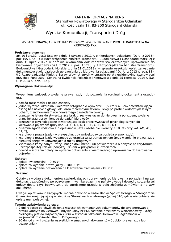 KARTA INFORMACYJNA KD-6 Starostwa Powiatowego w Starogardzie Gdańskim ul. Kościuszki 17, 83-200 Starogard Gdański Wydział Komunikacji, Transportu i Dróg WYDANIE PRAWA JAZDY PO RAZ PIERWSZY. WYGENEROWANIE PROFILU KANDYDATA NA KIEROWCĘ- PKK. Podstawa prawna: art.10 i art.32 ust.3 Ustawy z dnia 5 stycznia 2011 r. o kierujących pojazdami (Dz.U. z 2015r. poz.155 ), §5 - § 8 Rozporządzenia Ministra Transportu, Budownictwa i Gospodarki Morskiej z dnia 31 lipca 2012r. w sprawie wydawania dokumentów stwierdzających uprawnienia do kierowania pojazdami (Dz.U.z 2012 r. poz. 1005 ), § 1 Rozporządzenia Ministra Transportu, Budownictwa i Gospodarki Morskiej z dnia 11.01.2013 r. w sprawie wysokości opłat za wydanie dokumentów stwierdzających uprawnienia do kierowania pojazdami ( Dz. U. z 2013 r. poz. 83), § 2 Rozporządzenia Ministra Spraw Wewnętrznych w sprawie opłaty ewidencyjnej stanowiącej przychód Funduszu - Centralna Ewidencja Pojazdów i Kierowców z dnia 25 czerwca 2014 r. (Dz. U. z 2014 r. poz. 852 ). Wymagane dokumenty: Wypełniony wniosek o wydanie prawa jazdy lub pozwolenia (orginalny dokument z urzędu) oraz: ● ● ● ● ● ● ● ● ● dowód tożsamości ( dowód osobisty), jedna wyraźna, aktualna i kolorowa fotografia o wymiarze 3,5 cm x 4,5 cm przedstawiająca osobę bez nakrycia głowy i okularów z ciemnymi szkłami, lewy półprofil z widocznym lewym uchem, z zachowaniem równomiernego oswietlenia twarzy, orzeczenie lekarskie stwierdzające brak przeciwwskazań do kierowania pojazdem, wydane przez lekarza uprawnionego do badań kierowców, orzeczenie psychologiczne stwierdzające brak przeciwwskazań psychologicznych do kierowania pojazdem (przy kat. C1, C, D1, D, C1+E, C+E, D1+E, D+E), pisemna zgoda rodziców lub opiekunów, jeżeli osoba nie ukończyła 18 lat (przy kat. AM, A1, B1, T), kserokopia prawa jazdy (w przypadku, gdy wnioskodawca posiada prawo jazdy), kserokopia prawa jazdy wydanego za granicą wraz tłumaczeniem (przy wymianie prawa jazdy nieokreślonego w konwencjach o ruchu drogowym), kserokopia karty pobytu, wizy, innego dokumentu lub potwierdzenia o pobycie na terytorium Rzeczpospolitej Polskiej powyżej 185 dni w przypadku cudzoziemca, dowód uiszczenia opłaty za wydanie dokumentu stwierdzającego uprawnienia do kierowania pojazdami. Opłaty: opłata ewidencyjna – 0,50 zł opłata za wydanie prawa jazdy – 100,00 zł opłata za wydanie pozwolenia na kierowanie tramwajem -30,00 zł ● ● ● Ważne: Opłaty za wydanie dokumentów stwierdzających uprawnienia do kierowania pojazdami należy dokonać bezpośrednio po pozytywnym wyniku egzaminu państwowego i dowód uiszczenia tej opłaty dostarczyć bezwłocznie do tutejszego urzędu w celu złożenia zamówienia na w/w dokument. Uwaga: opłat komunikacyjnych można dokonać w kasie Banku Spółdzielczego w Starogardzie Gdańskim znajdującej się w siedzibie Starostwa Powiatowego (pokój 010) gdzie nie pobiera się opłaty manipulacyjnej. Termin załatwienia sprawy: 2 dni robocze od chwili złożenia wszystkich wymaganych dokumentów do wygenerowania profilu kandyta na kierowcę. Indywidualny nr PKK zostanie przekazany wnioskodawcy , który niezbędny jest do rozpoczęcia kursu w Ośrodku Szkolenia Kierowców i egzaminów w Wojewódzkim Ośrodku Ruchu Drogowego 30 dni od chwili złożenia wszystkich wymaganych dokumentów ( odbiór prawa jazdy lub pozwolenia ) ● ● strona 1 z 2 Miejsce załatwienia sprawy: pokój 012, telefon: 587673527, 587673528, fax: 587673531 ● Godziny pracy: poniedziałek, środa, czwartek i piątek 900 - 1500, wtorek 900 - 1700 ● Jednostka wykonująca: Referat Komunikacji – pracownicy zajmujacy sie prawami jazdy Jednostka nadzorująca: Naczelnik Wydziału Komunikacji, Transportu i Dróg, telefon 587673534 ● Tryb odwoławczy: stronie przysługuje wniesienie odwołania do Samorządowego Kolegium Odwoławczego w Gdańsku za pośrednictwem Starosty Starogardzkiego ● Uwagi: szczegółowych informacji udzielają Naczelnik i pracownicy Referatu Komunikacji zajmujący się prawami jazdy ● Inne informacje Profil Kandydata na Kierowcę (PKK) jest to elektroniczy dokument, generowany w systemie "Kierowca", zawierający dane i informacje identyfikujące i opisujące osobę ubiegającą się o wydanie dokumentu stwierdzającego uprawnienia do kierowania pojazdami (prawo jazdy, pozwolenie do kierownia tramwajem). Dokument ten jest niezbędny do rozpoczęcia szkolenia oraz przystąpienia do egzaminu. PKK wydaje się w przypadku: ● ● ● ● ubiegania się po raz pierwszy o uprawnienie, rozszerzenia uprawnień, wymiany prawa jazdy z zagranicy (z wymaganym egzaminem teoretycznym), sprawdzenia kwalifikacji (po dostarczeniu orzeczenia lekarskiego i/lub psychologicznego): - przywrócenia uprawnień cofniętych powyżej 1 toku, - przywrócenia uprawnień cofniętych w związku z utratą kwalifikacji, - zwrotu prawa jazdy zatrzymanego conajmniej od 1 roku, ● ● posiadającego uprawnienia do jazdy pojazdami z automatyczną skrzynią biegów ubiegającego się o uprawnienia bez ograniczeń, w przypadku ubiegania się ponownie o uprawnienia po rocznej przerwie (dokumenty przesłane przez WORD po niezdanym egzaminie. strona 2 z 2