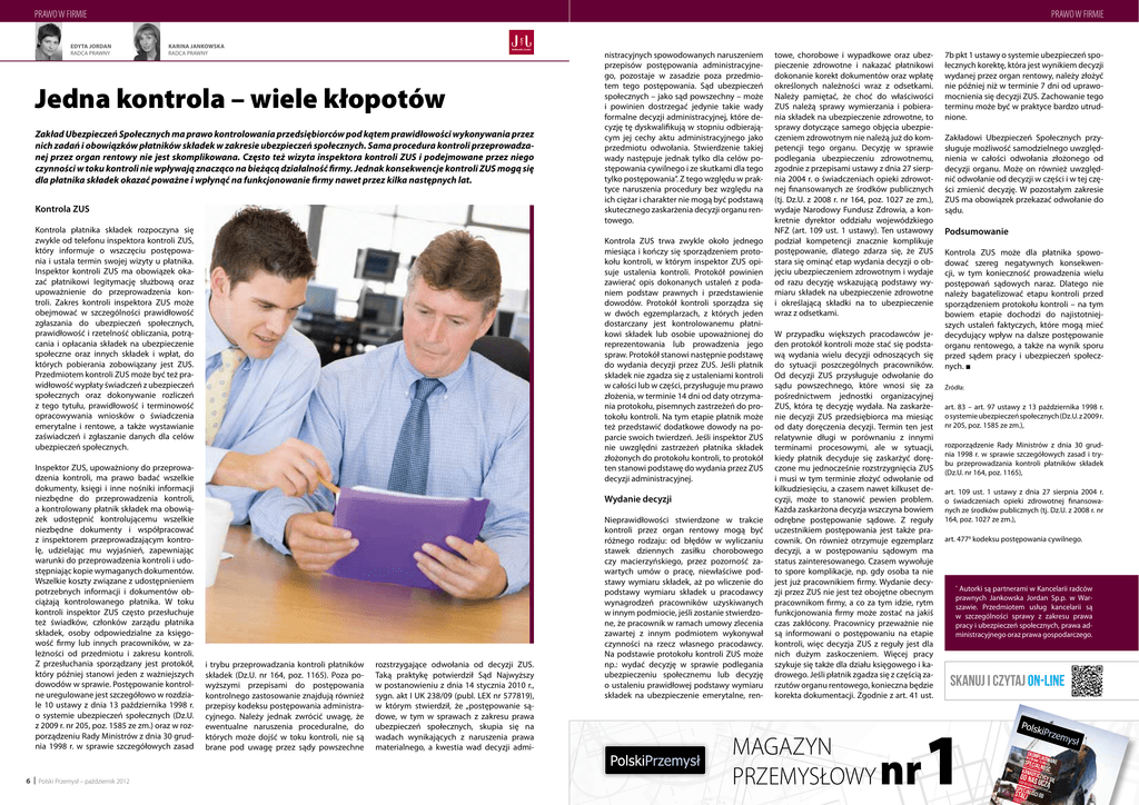 PRAWO W FIRMIE Edyta Jordan RADCA PRAWNY PRAWO W FIRMIE Karina Jankowska RADCA PRAWNY Jedna kontrola – wiele kłopotów Zakład Ubezpieczeń Społecznych ma prawo kontrolowania przedsiębiorców pod kątem prawidłowości wykonywania przez nich zadań i obowiązków płatników składek w zakresie ubezpieczeń społecznych. Sama procedura kontroli przeprowadzanej przez organ rentowy nie jest skomplikowana. Często też wizyta inspektora kontroli ZUS i podejmowane przez niego czynności w toku kontroli nie wpływają znacząco na bieżącą działalność firmy. Jednak konsekwencje kontroli ZUS mogą się dla płatnika składek okazać poważne i wpłynąć na funkcjonowanie firmy nawet przez kilka następnych lat. Kontrola ZUS Kontrola płatnika składek rozpoczyna się zwykle od telefonu inspektora kontroli ZUS, który informuje o wszczęciu postępowania i ustala termin swojej wizyty u płatnika. Inspektor kontroli ZUS ma obowiązek okazać płatnikowi legitymację służbową oraz upoważnienie do przeprowadzenia kontroli. Zakres kontroli inspektora ZUS może obejmować w szczególności prawidłowość zgłaszania do ubezpieczeń społecznych, prawidłowość i rzetelność obliczania, potrącania i opłacania składek na ubezpieczenie społeczne oraz innych składek i wpłat, do których pobierania zobowiązany jest ZUS. Przedmiotem kontroli ZUS może być też prawidłowość wypłaty świadczeń z ubezpieczeń społecznych oraz dokonywanie rozliczeń z tego tytułu, prawidłowość i terminowość opracowywania wniosków o świadczenia emerytalne i rentowe, a także wystawianie zaświadczeń i zgłaszanie danych dla celów ubezpieczeń społecznych. Wydanie decyzji Podsumowanie Kontrola ZUS może dla płatnika spowodować szereg negatywnych konsekwencji, w tym konieczność prowadzenia wielu postępowań sądowych naraz. Dlatego nie należy bagatelizować etapu kontroli przed sporządzeniem protokołu kontroli – na tym bowiem etapie dochodzi do najistotniejszych ustaleń faktyczych, które mogą mieć decydujący wpływ na dalsze postępowanie organu rentowego, a także na wynik sporu przed sądem pracy i ubezpieczeń społecznych. ■ W przypadku większych pracodawców jeden protokół kontroli może stać się podstawą wydania wielu decyzji odnoszących się do sytuacji poszczególnych pracowników. Od decyzji ZUS przysługuje odwołanie do sądu powszechnego, które wnosi się za Źródła: pośrednictwem jednostki organizacyjnej ZUS, która tę decyzję wydała. Na zaskarże- art. 83 – art. 97 ustawy z 13 października 1998 r. nie decyzji ZUS przedsiębiorca ma miesiąc o systemie ubezpieczeń społecznych (Dz.U. z 2009 r. od daty doręczenia decyzji. Termin ten jest nr 205, poz. 1585 ze zm.), relatywnie długi w porównaniu z innymi terminami procesowymi, ale w sytuacji, rozporządzenie Rady Ministrów z dnia 30 grudkiedy płatnik decyduje się zaskarżyć dorę- nia 1998 r. w sprawie szczegółowych zasad i trybu przeprowadzania kontroli płatników składek czone mu jednocześnie rozstrzygnięcia ZUS (Dz.U. nr 164, poz. 1165), i musi w tym terminie złożyć odwołanie od kilkudziesięciu, a czasem nawet kilkuset de- art. 109 ust. 1 ustawy z dnia 27 sierpnia 2004 r. cyzji, może to stanowić pewien problem. o świadczeniach opieki zdrowotnej finansowaKażda zaskarżona decyzja wszczyna bowiem nych ze środków publicznych (tj. Dz.U. z 2008 r. nr odrębne postępowanie sądowe. Z reguły 164, poz. 1027 ze zm.), uczestnikiem postępowania jest także pracownik. On również otrzymuje egzemplarz art. 4779 kodeksu postępowania cywilnego. decyzji, a w postępowaniu sądowym ma status zainteresowanego. Czasem wywołuje to spore komplikacje, np. gdy osoba ta nie jest już pracownikiem firmy. Wydanie decy* Autorki są partnerami w Kancelarii radców zji przez ZUS nie jest też obojętne obecnym prawnych Jankowska Jordan Sp.p. w Warpracownikom firmy, a co za tym idzie, rytm szawie. Przedmiotem usług kancelarii są funkcjonowania firmy może zostać na jakiś w szczególności sprawy z zakresu prawa czas zakłócony. Pracownicy przeważnie nie pracy i ubezpieczeń społecznych, prawa adsą informowani o postępowaniu na etapie ministracyjnego oraz prawa gospodarczego. kontroli, więc decyzja ZUS z reguły jest dla nich dużym zaskoczeniem. Więcej pracy szykuje się także dla działu księgowego i kadrowego. Jeśli płatnik zgadza się z częścią zarzutów organu rentowego, konieczna będzieBranża spoty ka s ię w Sosn korekta dokumentacji. Zgodnie z art. 41 ust. o wc u SKANUJ I CZYTAJ ON-LINE N ow o w naj czesny więks obiekt zej p w olski ystawie ej ag n lomer niczy acji MAGAZYN PRZEMYSŁOWY 1 P PR RZZEE M MYYS SŁŁO OW WA 2– 4 A JJE pa ESSIE TOOL ździern IEŃ ika 20 EX ŃW 5. Mi www. 12 W EE ędzy narod toolex.pl X XP owe PO OS Targi 16 – SIL Obrab 18 pa ILEES iarek ździe Expo SIA , Narzę W IA Międ ELDING rnika 20 dz nr i i Te 12 chno rodow - www.ex logii e Targi powe Obrób 6–7 Spaw lding.pl ki listo alnicz pada Stee e lM 2012 5. Mi ET - ww ędzy w. narod steelm SURF et. ow pl PROT e Targi 6. Mi Stali, ędzy ECT - ww Metal narod w.su TEZ i Nież rfprot owe Ex elazn Targi ect.p Targi po - ww ych, Zabe l w.tez Produ Tech zpiec ex kcji i nolog zeń Po Zasto po.pl ii i Pro wierz 13 – sowa duktó chni 15 lis nia Ele w topa HAPe ment da 20 xpo ów Złą 4. Ta 12 czny rgi Hy www.ha ch pexp drau ROBO o.p liki, Au tomaty l Targi Tshow www. Robo ki i Pneu rob tyzac RubP matyk ji i Au otshow last i tomaty .pl EXPO 5. Ta rgi Prz - ww zacji em w w O zyna www.p olskip rzemys l.com.p l NUMER 12 rozstrzygające odwołania od decyzji ZUS. Taką praktykę potwierdził Sąd Najwyższy w postanowieniu z dnia 14 stycznia 2010 r., sygn. akt I UK 238/09 (publ. LEX nr 577819), w którym stwierdził, że „postępowanie sądowe, w tym w sprawach z zakresu prawa ubezpieczeń społecznych, skupia się na wadach wynikających z naruszenia prawa materialnego, a kwestia wad decyzji