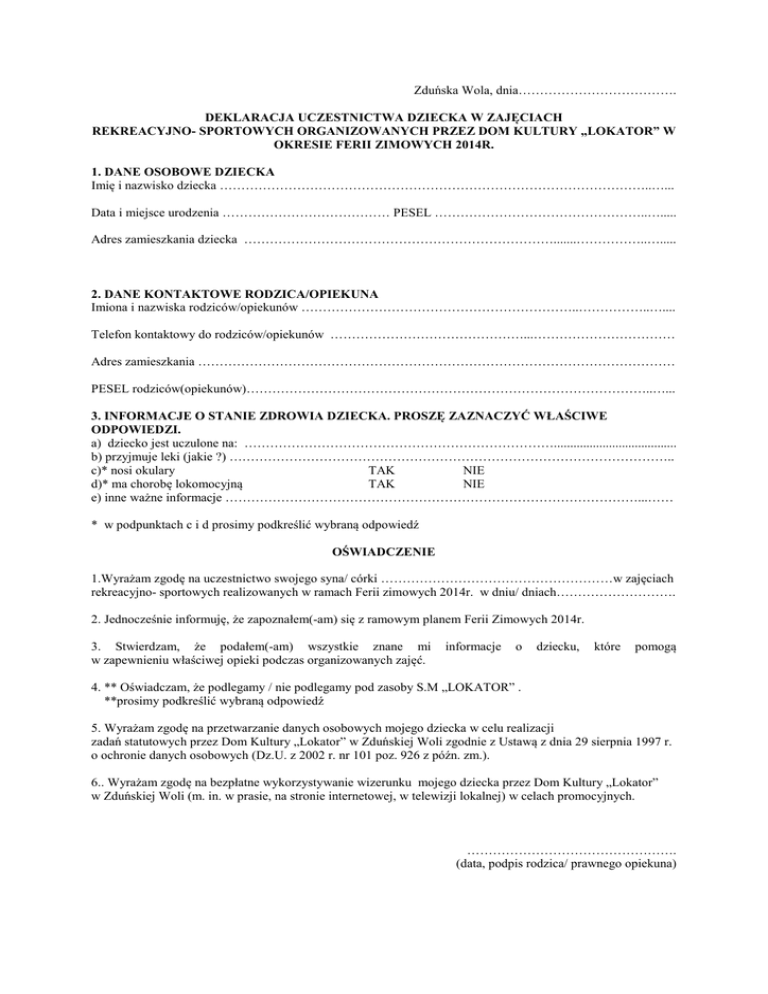 Zduńska Wola, dnia………………………………. DEKLARACJA UCZESTNICTWA DZIECKA W ZAJĘCIACH REKREACYJNO- SPORTOWYCH ORGANIZOWANYCH PRZEZ DOM KULTURY „LOKATOR” W OKRESIE FERII ZIMOWYCH 2014R. 1. DANE OSOBOWE DZIECKA Imię i nazwisko dziecka ………………………………………………………………………………………..…... Data i miejsce urodzenia ………………………………… PESEL …………………………………………..…..... Adres zamieszkania dziecka ……………………………………………………………….......……………..…..... 2. DANE KONTAKTOWE RODZICA/OPIEKUNA Imiona i nazwiska rodziców/opiekunów ………………………………………………………..……………..….... Telefon kontaktowy do rodziców/opiekunów ………………………………………...…………………………… Adres zamieszkania ………………………………………………………………………………………………… PESEL rodziców(opiekunów)…………………………………………………………………………………..…... 3. INFORMACJE O STANIE ZDROWIA DZIECKA. PROSZĘ ZAZNACZYĆ WŁAŚCIWE ODPOWIEDZI. a) dziecko jest uczulone na: ………………………………………………………………...................................... b) przyjmuje leki (jakie ?) ………………………………………………………………………………………….. c)* nosi okulary TAK NIE d)* ma chorobę lokomocyjną TAK NIE e) inne ważne informacje ……………………………………………………………………………………...…… * w podpunktach c i d prosimy podkreślić wybraną odpowiedź OŚWIADCZENIE 1.Wyrażam zgodę na uczestnictwo swojego syna/ córki ………………………………………………w zajęciach rekreacyjno- sportowych realizowanych w ramach Ferii zimowych 2014r. w dniu/ dniach………………………. 2. Jednocześnie informuję, że zapoznałem(-am) się z ramowym planem Ferii Zimowych 2014r. 3. Stwierdzam, że podałem(-am) wszystkie znane mi w zapewnieniu właściwej opieki podczas organizowanych zajęć. informacje o dziecku, które pomogą 4. ** Oświadczam, że podlegamy / nie podlegamy pod zasoby S.M „LOKATOR” . **prosimy podkreślić wybraną odpowiedź 5. Wyrażam zgodę na przetwarzanie danych osobowych mojego dziecka w celu realizacji zadań statutowych przez Dom Kultury „Lokator” w Zduńskiej Woli zgodnie z Ustawą z dnia 29 sierpnia 1997 r. o ochronie danych osobowych (Dz.U. z 2002 r. nr 101 poz. 926 z późn. zm.). 6.. Wyrażam zgodę na bezpłatne wykorzystywanie wizerunku mojego dziecka przez Dom Kultury „Lokator” w Zduńskiej Woli (m. in. w prasie, na stronie internetowej, w telewizji lokalnej) w celach promocyjnych. …………………………………………. (data, podpis rodzica/ prawnego opiekuna)
