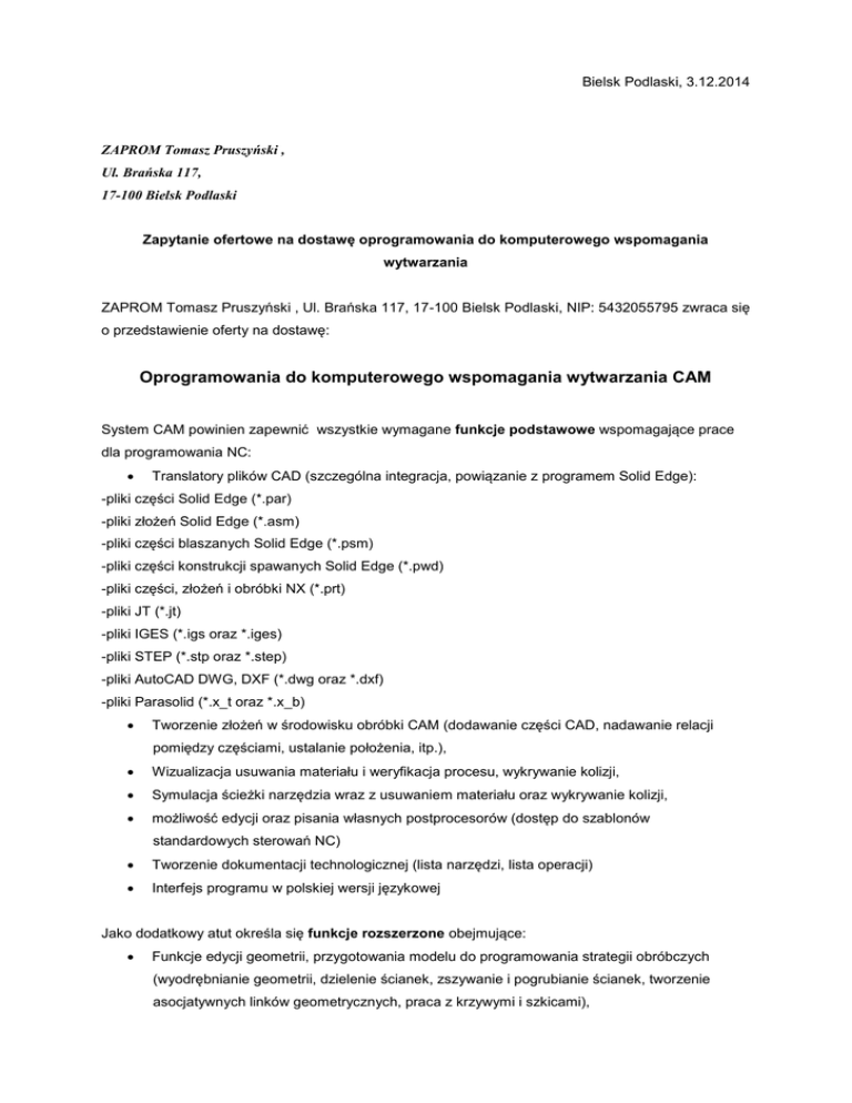 Bielsk Podlaski, 3.12.2014 ZAPROM Tomasz Pruszyński , Ul. Brańska 117, 17-100 Bielsk Podlaski Zapytanie ofertowe na dostawę oprogramowania do komputerowego wspomagania wytwarzania ZAPROM Tomasz Pruszyński , Ul. Brańska 117, 17-100 Bielsk Podlaski, NIP: 5432055795 zwraca się o przedstawienie oferty na dostawę: Oprogramowania do komputerowego wspomagania wytwarzania CAM System CAM powinien zapewnić wszystkie wymagane funkcje podstawowe wspomagające prace dla programowania NC: Translatory plików CAD (szczególna integracja, powiązanie z programem Solid Edge): -pliki części Solid Edge (*.par) -pliki złożeń Solid Edge (*.asm) -pliki części blaszanych Solid Edge (*.psm) -pliki części konstrukcji spawanych Solid Edge (*.pwd) -pliki części, złożeń i obróbki NX (*.prt) -pliki JT (*.jt) -pliki IGES (*.igs oraz *.iges) -pliki STEP (*.stp oraz *.step) -pliki AutoCAD DWG, DXF (*.dwg oraz *.dxf) -pliki Parasolid (*.x_t oraz *.x_b) Tworzenie złożeń w środowisku obróbki CAM (dodawanie części CAD, nadawanie relacji pomiędzy częściami, ustalanie położenia, itp.), Wizualizacja usuwania materiału i weryfikacja procesu, wykrywanie kolizji, Symulacja ścieżki narzędzia wraz z usuwaniem materiału oraz wykrywanie kolizji, możliwość edycji oraz pisania własnych postprocesorów (dostęp do szablonów standardowych sterowań NC) Tworzenie dokumentacji technologicznej (lista narzędzi, lista operacji) Interfejs programu w polskiej wersji językowej Jako dodatkowy atut określa się funkcje rozszerzone obejmujące: Funkcje edycji geometrii, przygotowania modelu do programowania strategii obróbczych (wyodrębnianie geometrii, dzielenie ścianek, zszywanie i pogrubianie ścianek, tworzenie asocjatywnych linków geometrycznych, praca z krzywymi i szkicami), Funkcje edycji geometrii, przygotowania modelu do programowania strategii obróbczych, który nie posiada historii jego tworzenie: przesuń, wyciągnij, zastąp, zmień rozmiar ścianki; zmień promień zaokrąglenia, zmień kolejność zaokrąglenia, zmień rozmiar fazy; usuń ściankę; optymalizacja geometrii możliwość rozbudowy o moduł do programowania 2-oraz 4-osiowych wycinarek drutowych EDM: 10% możliwość rozbudowy o moduł do programowania maszyn pomiarowych CMM: 10% Zakres obróbki: Toczenie - oparte na krawędziowej geometrii 2D lub na modelach bryłowych 3D. Procedury obróbki zgrubnej, wykańczania wieloprzejściowego, toczenia rowków, gwintowania oraz wiercenia w osi przedmiotu. Frezowanie ze stałą osią frezu - funkcje obróbki 2-i 3-osiowej o dowolnym kształcie począwszy od ręcznego tworzenia i edytowania ścieżki narzędziowej po zaawansowane metody zautomatyzowanej obróbki. Automatyczne wykrywanie kolizji zapewniające bezpieczną obróbkę skomplikowanych geometrii. Obróbka HSM (obróbka szybkoobrotowa) -wydajna obróbka zgrubna HSM zapewniająca wysokie tempo usuwania naddatku materiału przy pełnej kontroli obciążenia narzędzia. Obróbka 5-osiowa skomplikowanych powierzchniach, przy zapewnieniu pełnej kontroli kolizji. Postprocesory: tokarka 2 osiowa (Fanuc) - 1 szt. tokarka 2 osiowa (Fagor) - 1 szt. frezarka 3 osiowa (Fanuc Oi-MD) - 2 szt. frezarka 4 osiowa (Fanuc Oi-MD) - 1 szt. Maksymalny, wymagany termin realizacji do 31.12.2014r. Kryteria wyboru ofert: - cena: 60%, - funkcje edycji geometrii, przygotowania modelu do programowania strategii obróbczych: 20% - możliwość rozbudowy o moduł do programowania 2-oraz 4-osiowych wycinarek drutowych EDM: 10% - możliwość rozbudowy o moduł do programowania maszyn pomiarowych CMM: 10% Termin składania ofert: do 23.12.2014r. Firma zastrzega sobie możliwość rezygnacji z zamówienia. Oferty dla swojej ważności muszą zawierać informacje określone w kryteriach wyboru ofert. Oferowana cenowa powinna być podana w wartościach netto i brutto. Dodatkowe pytania prosimy kierować do: Tomasz Pruszyński, Tel. kom: 510-81-65-65, fax: (85) 73093-68, e-mail: [email protected] Z poważaniem Tomasz Pruszyński "Dotyczy projektu numer UDA-RPPD.01.04.02-20-166/12 pt. ,,Utworzenie nowoczesnego zakładu produkcji innowacyjnych pras mimośrodowych do pracy ciągłej przez przedsiębiorstwo ZAPROM Tomasz Pruszyński” realizowanego w ramach umowy nr UDARPPD.01.04.02-20-166/12-00 zawartej w ramach Regionalnego Programu Operacyjnego Województwa Podlaskiego na lata 2007-2013 Osi Priorytetowej I Wzrost innowacyjności i wspieranie przedsiębiorczości w regionie, Działanie 1.4. Wsparcie inwestycyjne przedsiębiorstw, Poddziałanie 1.4.2 Małe i średnie przedsiębiorstwa, w dniu 26/08/2013r."