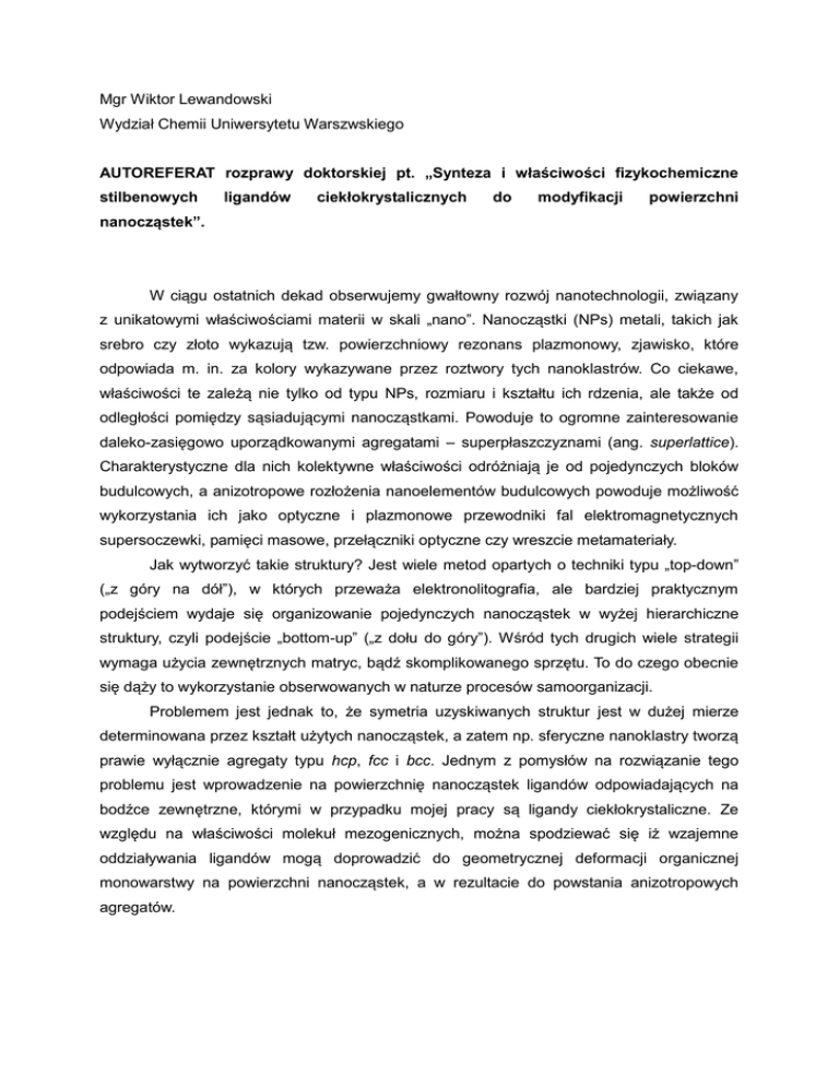 Mgr Wiktor Lewandowski Wydział Chemii Uniwersytetu Warszwskiego AUTOREFERAT rozprawy doktorskiej pt. „Synteza i właściwości fizykochemiczne stilbenowych ligandów ciekłokrystalicznych do modyfikacji powierzchni nanocząstek”. W ciągu ostatnich dekad obserwujemy gwałtowny rozwój nanotechnologii, związany z unikatowymi właściwościami materii w skali „nano”. Nanocząstki (NPs) metali, takich jak srebro czy złoto wykazują tzw. powierzchniowy rezonans plazmonowy, zjawisko, które odpowiada m. in. za kolory wykazywane przez roztwory tych nanoklastrów. Co ciekawe, właściwości te zależą nie tylko od typu NPs, rozmiaru i kształtu ich rdzenia, ale także od odległości pomiędzy sąsiadującymi nanocząstkami. Powoduje to ogromne zainteresowanie daleko-zasięgowo uporządkowanymi agregatami – superpłaszczyznami (ang. superlattice). Charakterystyczne dla nich kolektywne właściwości odróżniają je od pojedynczych bloków budulcowych, a anizotropowe rozłożenia nanoelementów budulcowych powoduje możliwość wykorzystania ich jako optyczne i plazmonowe przewodniki fal elektromagnetycznych supersoczewki, pamięci masowe, przełączniki optyczne czy wreszcie metamateriały. Jak wytworzyć takie struktury? Jest wiele metod opartych o techniki typu „top-down” („z góry na dół”), w których przeważa elektronolitografia, ale bardziej praktycznym podejściem wydaje się organizowanie pojedynczych nanocząstek w wyżej hierarchiczne struktury, czyli podejście „bottom-up” („z dołu do góry”). Wśród tych drugich wiele strategii wymaga użycia zewnętrznych matryc, bądź skomplikowanego sprzętu. To do czego obecnie się dąży to wykorzystanie obserwowanych w naturze procesów samoorganizacji. Problemem jest jednak to, że symetria uzyskiwanych struktur jest w dużej mierze determinowana przez kształt użytych nanocząstek, a zatem np. sferyczne nanoklastry tworzą prawie wyłącznie agregaty typu hcp, fcc i bcc. Jednym z pomysłów na rozwiązanie tego problemu jest wprowadzenie na powierzchnię nanocząstek ligandów odpowiadających na bodźce zewnętrzne, którymi w przypadku mojej pracy są ligandy ciekłokrystaliczne. Ze względu na właściwości molekuł mezogenicznych, można spodziewać się iż wzajemne oddziaływania ligandów mogą doprowadzić do geometrycznej deformacji organicznej monowarstwy na powierzchni nanocząstek, a w rezultacie do powstania anizotropowych agregatów. : Ryc. 1. Reorganizacja ligandów ciekłokrystalicznych na powierzchni nanocząstek prowadząca do geometrycznej anizotropii. W momencie rozpoczęcia przeze mnie badań opublikowano zaledwie kilka artykułów wykorzystujących opisaną strategię i uzasadnionym wydaje się stwierdzenie iż nadal podejście to obarczone jest kilkoma wadami, a których dwie najpoważniejsze to mała wiedza na temat wpływu czynników architektury hybrydowych nanocząstek na procesy samoorganizacji i aplikacja tej strategii praktycznie wyłącznie do nanocząstek złota. Z punktu widzenia potencjalnych zastosowań wymagana jest m. in. samoorganizacja nanocząstek srebra. W swojej pracy podjąłem opisaną powyżej tematykę skupiając się na poszerzeniu wiedzy w zakresie wspomnianych aspektów. Można wyróżnić cztery podstawowe etapy badań: zaprojektowanie i synteza mezogenicznych lub pro-mezogenicznych ligandów powierzchniowych dla nanocząstek, które będą różnić się elementami budowy pozwalając śledzić ich wpływ na procesy samoorganizacji synteza hydrofobowych, sferycznych nanocząstek złota i srebra, częściowa wymiana ligandów kowalencyjnie związanych z powierzchnią nanocząstek na molekuły zsyntetyzowane przeze mnie w pierwszym etapie analiza fizykochemiczna uzyskiwanych układów. Zaprojektowane przez mnie ligandy ciekłokrystaliczne to trójpierścieniowe, aromatyczne związki posiadające w swojej strukturze ugrupowanie merkaptanowe pozwalające kowalencyjnie przyłączyć ligandy do powierzchni nanocząstek. Ich architektura została zdeterminowana za pomocą jednostki (E)-stilbenowej, a zmieniane elementy to m. in. typ i długość terminalnego łańcucha alkoksylowego, obecność lateralnego podstawnika w terminalnym pierścieniu aromatycznym, długość łańcucha alkilowego łączącego sztywny rdzeń molekuły z powierzchnią nanocząstki oraz różne podstawniki w trzecim pierścieniu aromatycznym. Otrzymane związki zostały podzielone na cztery serie w zależności od wprowadzonego zmiennego elementu architektury molekularnej. Uzyskałem 12 ligandów merkaptanowych (35 nowych wcześniej nieotrzymanych organicznych). Do syntezy nanocząstek złota wykorzystałem metodę Brust’a-Schiffrin’a, co pozwoliło mi otrzymać trzy serie stabilnych nanocząstek, pokrytych alkilowymi tiolami o różnej długości i średniej wielkości ok. 2.2 nm (średnica metalicznego rdzenia). Z kolei do syntezy nanocząstek otrzymałem srebra wykorzystałem zmodyfikowaną metodę literaturową, w której nanocząstki o średnicy ok. 4.4 nm stabilizowanymi na powierzchni heksanotiolem. Zgodnie z planem przeprowadziłem szereg reakcji wymiany ligandów uzyskując kilkadziesiąt nanocząstek hybrydowych, dla których określiłem zdolność i typ samoorganizacji. Dla większości zsyntetyzowanych układów hybrydowych nie zaobserwowałem tworzenia superpłaszczyzn. Związane to było z pewnymi strukturalnymi cechami. Wyniki te pozwoliły mi jednak na racjonalne zaplanowanie struktury kolejnych związków, które powodowały tworzenie przestrzennie zorganizowanych agregatów nanocząstek złota: 1D warstw smektycznych i 3D faz kolumnowych. Szczegółowa analiza fizykochemiczna (SAXS, SAXRD, XPS, TEM, POM, NMR) pozwoliła powiązać elementy budowy z właściwościami uzyskiwanych struktur. Okazało się, że za stopień organizacji odpowiada „giętkość” ligandów mezogenicznych, strukturalnie wyrażona przez długość łącznika pomiędzy powierzchnią nanoc