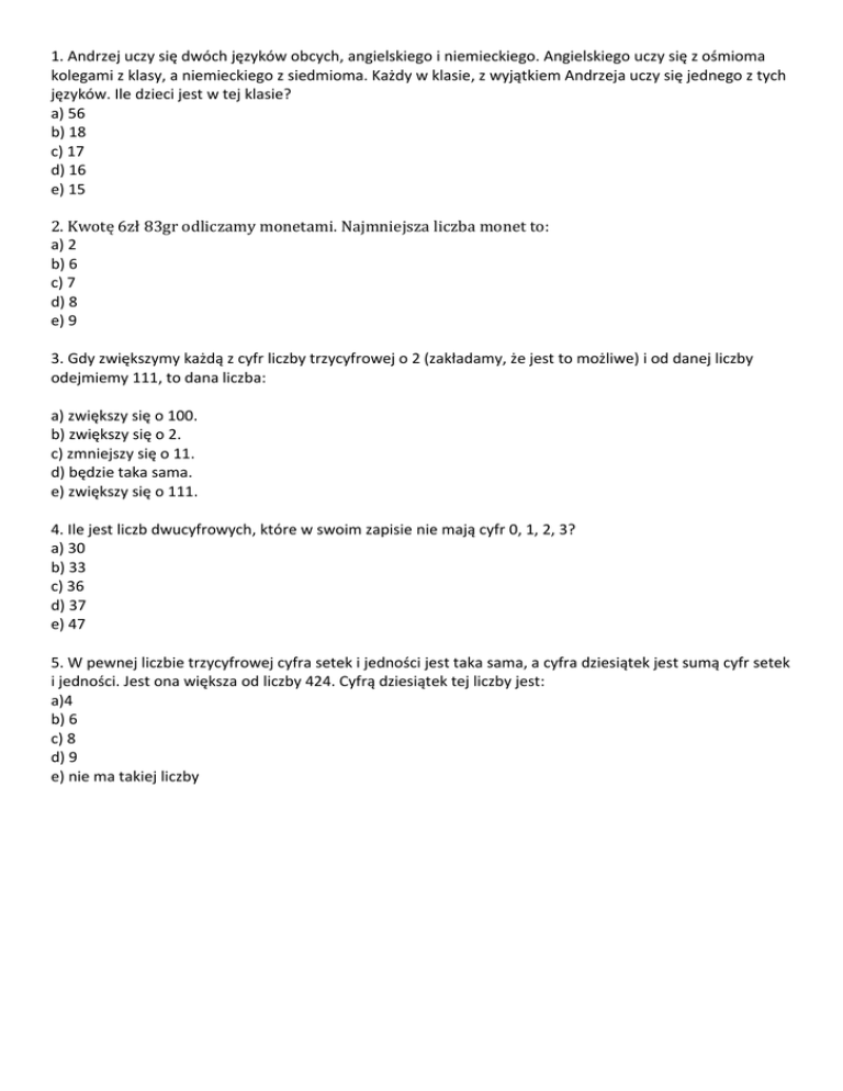 1. Andrzej uczy się dwóch języków obcych, angielskiego i niemieckiego. Angielskiego uczy się z ośmioma kolegami z klasy, a niemieckiego z siedmioma. Każdy w klasie, z wyjątkiem Andrzeja uczy się jednego z tych języków. Ile dzieci jest w tej klasie? a) 56 b) 18 c) 17 d) 16 e) 15 2. Kwotę 6zł 83gr odliczamy monetami. Najmniejsza liczba monet to: a) 2 b) 6 c) 7 d) 8 e) 9 3. Gdy zwiększymy każdą z cyfr liczby trzycyfrowej o 2 (zakładamy, że jest to możliwe) i od danej liczby odejmiemy 111, to dana liczba: a) zwiększy się o 100. b) zwiększy się o 2. c) zmniejszy się o 11. d) będzie taka sama. e) zwiększy się o 111. 4. Ile jest liczb dwucyfrowych, które w swoim zapisie nie mają cyfr 0, 1, 2, 3? a) 30 b) 33 c) 36 d) 37 e) 47 5. W pewnej liczbie trzycyfrowej cyfra setek i jedności jest taka sama, a cyfra dziesiątek jest sumą cyfr setek i jedności. Jest ona większa od liczby 424. Cyfrą dziesiątek tej liczby jest: a)4 b) 6 c) 8 d) 9 e) nie ma takiej liczby