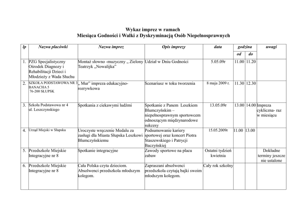 Wykaz imprez w ramach Miesiąca Godności i Walki z Dyskryminacją Osób Niepełnosprawnych lp Nazwa placówki Nazwa imprez Opis imprezy data godzina od 1. PZG Specjalistyczny Montaż słowno -muzyczny „ Zielony Udział w Dniu Godności Ośrodek Diagnozy i Teatrzyk „Nowalijka” Rehabilitacji Dzieci i Młodzieży z Wada Słuchu 2. SZKOŁA PODSTAWOWA NR 3 „ Mur” impreza edukacyjnoBANACHA 5 rozrywkowa Scenariusz w toku tworzenia uwagi do 5.05.09r 11.00 11.20 8 maja 2009 r. 11.30 12.30 76-200 SŁUPSK 3. Szkoła Podstawowa nr 4 ul. Leszczynskiego 4. Urząd Miejski w Słupsku 5. Przedszkole Miejskie Integracyjne nr 8 6. Przedszkole Miejskie Integracyjne nr 8 Spotkania z ciekawymi ludźmi Spotkanie z Panem Leszkiem 13.05.09r 13.00 14.00 Impreza Blumczyńskim – cykliczna- raz niepełnosprawnym sportowcem w miesiącu odnoszącym międzynarodowe sukcesy 15.05.2009r 11.00 13.00 Uroczyste wręczenie Medalu za Podsumowanie kariery zasługi dla Miasta Słupska Leszkowi sportowej oraz koncert Piotra Blumczyńskiemu Staszewskiego i Patrycji Baczyńskiej Spotkanie integracyjne Zawody sportowe na placu Ostatni tydzień Dokładne zabaw kwietnia terminy jeszcze nie ustalone Cała Polska czyta dzieciom. Zapraszani absolwenci Cały rok szkolny Absolwenci przedszkola młodszym przedszkola czytają bajki swoim kolegom. młodszym kolegom. 7. Przedszkole Miejskie Integracyjne nr 8 8. Przedszkole Miejskie Integracyjne nr 8 9. ZSP nr 4 w Słupsku Spotkanie integracyjne 10. ZSP nr 4 w Słupsku w SOSW w Słupsku „Cała Polska Czyta Dzieciom” 11. ZSP nr 4 w Słupsku i SOSW w Słupsku „Dzień Sportu” 12. PZN W SŁUPSKU Integracyjny Dzień Dziecka 13. OT RONDO Koncert Piotra Staszewskiego KKFSiTIW ”ZRYW” BIBLIOTEKA Wycieczka do Bierkowa „Czy naprawdę jesteśmy inni?” Przedstawienie „Dzieci w lesie” i zabawy integracyjne Występ artystyczny i wspólne zabawy W czasie tych zajęć uczniowie uczą się tolerancji wobec osób niepełnosprawnych. uczniowie ZSP nr 4, czytają opowiadania podopiecznym SOSW w Słupsku. Dzień Sportu, podczas którego, uczniowie ZSP nr 4 oraz SOSW biorą udział w różnych konkurencjach sportowych. Przy kinie Milenium zorganizowana zostanie integracyjna impreza z okazji dnia Dziecka Odbywać się będzie to w formie zabawy, gry, sportu . Przewidywane są konkurencje z nagrodami i drobny poczęstunek. Wszystko odbywać się będzie przy muzyce. Koncert na Fletnie Pana Miesiąc kwiecień kwiecień /maj W miesiącu kwietniu 8:00 13:00 W każdym miesiącu jedno spotkanie Impreza jest organizowana co roku – w czasie imprezy jest zorganizowany ciepły i słodki poczęstunek oraz napoje chłodzące. 1 czerwca 23.05.2009 10.00 14.00 25.05.2009 18.00 20.00