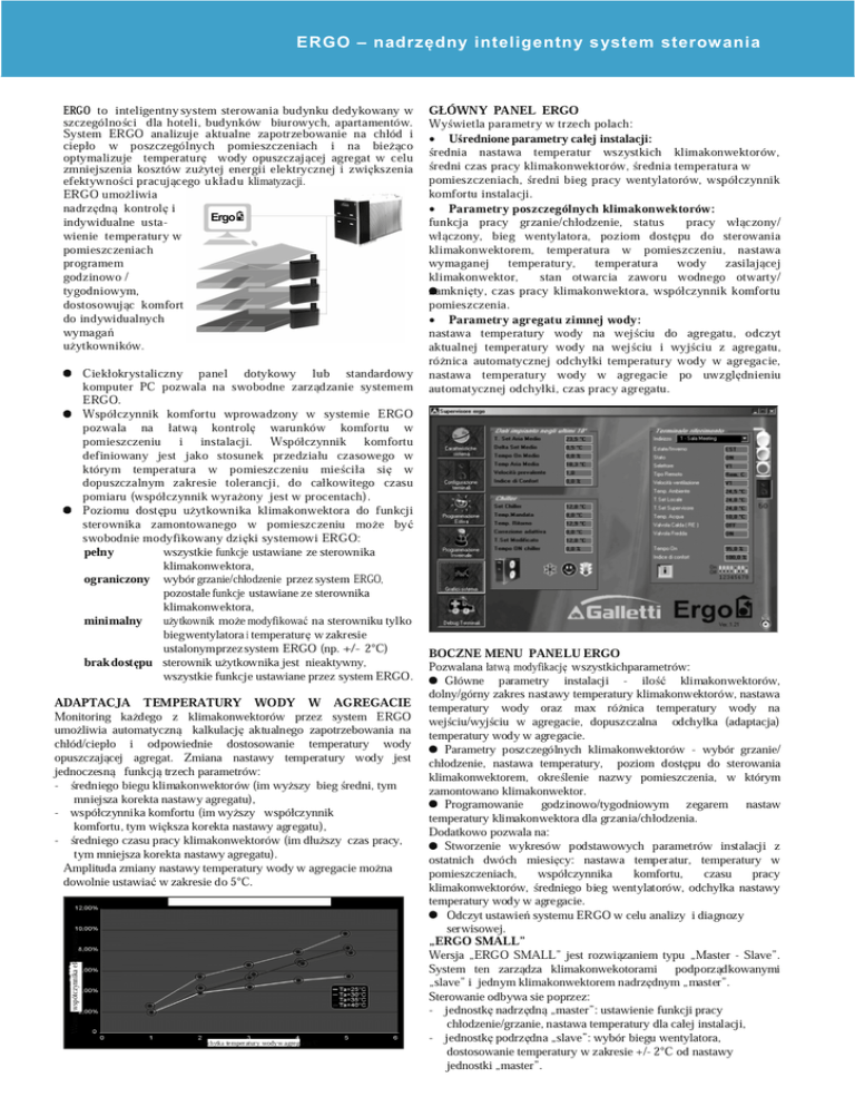 ERGO – nadrzędny inteligentny s ystem sterowania ERGO to inteligentny system sterowania budynku dedykowany w szczególności dla hoteli, budynków biurowych, apartamentów. System ERGO analizuje aktualne zapotrzebowanie na chłód i ciepło w poszczególnych pomieszczeniach i na bieżąco optymalizuje temperaturę wody opuszczaj ącej agregat w celu zmniejszenia kosztów zuż ytej energii elektrycznej i zwię kszenia efektywności pracującego układu klimatyzacji. ERGO umożliwia nadrzędną kontrolę i indywidualne ustawienie temperatury w pomieszczeniach programem godzinowo / tygodniowym, dostosowując komfort do indywidualnych wymagań użytkowników. GŁÓWNY PANEL ERGO Wyświetla parametry w trzech polach: • Uśrednione parametry całej instalacji: średnia nastawa temperatur wszystkich klimakonwektorów, średni czas pracy klimakonwektorów, ś rednia temperatura w pomieszczeniach, średni bieg pracy wentylatorów, współczynnik komfortu instalacji. • Parametry poszczególnych klimakonwektorów: • Parametry agregatu zimnej wody: funkcja pracy grzanie/chłodzenie, status pracy włączony/ włączony, bieg wentylatora, poziom dostępu do sterowania klimakonwektorem, temperatura w pomieszczeniu, nastawa wymaganej temperatury, temperatura wody zasilającej klimakonwektor, stan otwarcia zaworu wodnego otwarty/ zamknięty, czas pracy klimakonwektora, współczynnik komfortu pomieszczenia. nastawa temperatury wody na wejściu do agregatu, odczyt aktualnej temperatury wody na wej ściu i wyjściu z agregatu, różnica automatycznej odchyłki temperatury wody w agregacie, Ciekłokrystaliczny panel dotykowy lub standardowy nastawa temperatury wody w agregacie po uwzględnieniu komputer PC pozwala na swobodne zarządzanie systemem automatycznej odchyłki, czas pracy agregatu. ERGO. Współczynnik komfortu wprowadzony w systemie ERGO pozwala na łatwą kontrolę warunków komfortu w pomieszczeniu i instalacji. Współczynnik komfortu definiowany jest jako stosunek przedziału czasowego w którym temperatura w pomieszczeniu mieściła się w dopuszczalnym zakresie tolerancji, do całkowitego czasu pomiaru (współczynnik wyrażony jest w procentach). Poziomu dostępu użytkownika klimakonwektora do funkcji sterownika zamontowanego w pomieszczeniu może być swobodnie modyfikowany dzię ki systemowi ERGO: pełny wszystkie funkcje ustawiane ze sterownika klimakonwektora, ograniczony wybór grzanie/chłodzenie przez system ERGO, pozostałe funkcje ustawiane ze sterownika klimakonwektora, minimalny użytkownik może modyfikować na sterowniku tylko biegwentylatora i temperaturę w zakresie ustalonymprzez system ERGO (np. +/- 2°C) BOCZNE MENU PANELU ERGO brak dostępu sterownik użytkownika jest nieaktywny, Pozwalana łatwą modyfikację wszystkichparametrów: wszystkie funkcje ustawiane przez system ERGO. Główne parametry instalacji - ilość klimakonwektorów, dolny/górny zakres nastawy temperatury klimakonwektorów, nastawa ADAPTACJA TEMPERATURY WODY W AGREGACIE temperatury wody oraz max różnica temperatury wody na Monitoring każdego z klimakonwektorów przez system ERGO wejściu/wyjściu w agregacie, dopuszczalna odchyłka (adaptacja) umożliwia automatyczną kalkulację aktualnego zapotrzebowania na temperatury wody w agregacie. chłód/ciepło i odpowiednie dostosowanie temperatury wody Parametry poszczególnych klimakonwektorów - wybór grzanie/ opuszczającej agregat. Zmiana nastawy temperatury wody jest chłodzenie, nastawa temperatury, poziom dostępu do sterowania jednoczesną funkcją trzech parametrów: klimakonwektorem, określenie nazwy pomieszczenia, w którym - średniego biegu klimakonwektorów (im wyższy bieg średni, tym zamontowano klimakonwektor. mniejsza korekta nastawy agregatu), Programowanie godzinowo/tygodniowym zegarem nastaw - współczynnika komfortu (im wyższy współczynnik temperatury klimakonwektora dla grzania/chłodzenia. komfortu, tym większa korekta nastawy agregatu), Dodatkowo pozwala na: - średniego czasu pracy klimakonwektorów (im dłuższy czas pracy, Stworzenie wykresów podstawowych parametrów instalacji z tym mniejsza korekta nastawy agregatu). ostatnich dwóch miesięcy: nastawa temperatur, temperatury w Amplituda zmiany nastawy temperatury wody w agregacie można pomieszczeniach, współczynnika komfortu, czasu pracy dowolnie ustawiać w zakresie do 5°C. klimakonwektorów, średniego bieg wentylatorów, odchyłka nastawy temperatury wody w agregacie. Odczyt ustawień systemu ERGO w celu analizy i diagnozy serwisowej. Wzrost wspótczynnika efektywności „ERGO SMALL” Odchytka temperatury wodyw agregacie °C Wersja „ERGO SMALL” jest rozwiązaniem typu „Master - Slave”. System ten zarządza klimakonwekotorami podporządkowanymi „slave” i jednym klimakonwektorem nadrzędnym „master”. Sterowanie odbywa sie poprzez: - jednostkę nadrzędną „master”: ustawienie funkcji pracy chłodzenie/grzanie, nastawa temperatury dla całej instalacji, - jednostkę podrzędna „slave”: wybór biegu wentylatora, dostosowanie temperatury w zakresie +/- 2°C od nastawy jednostki „master”.