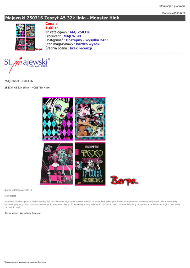 Informacje o produkcie Utworzono 07-03-2017 Majewski 250316 Zeszyt A5 32k linia - Monster High Cena : 1,60 zł Nr katalogowy : MAJ.250316 Producent : MAJEWSKI Dostępność : Dostępny - wysyłka 24h! Stan magazynowy : bardzo wysoki Średnia ocena : brak recenzji MAJEWSKI 250316 ZESZYT A5 32K LINIA – MONSTER HIGH Numer katalogowy: 250316 Stan: nowe Popularna i lubiana przez dzieci oraz młodzież seria Monster High teraz obecna również na artykułach szkolnych. Pudełka i opakowania zdobione Motywami z MH z pewnością spodobają się wszystkim fanom potworów ze Straszyceum. Zeszyt 32 kartkowy w linię idealny do szkoły i do nauki pisania. Zdobiony motywami z serii Monster High z pewnością zachęci do nauki. Różne wzory. Wysyłamy losowo! Wygenerowano w programie www.oscGold.com Dostępność w salonach: Ilość sztuk: Sklep - Złotniki: 37 Sklep - zlikwidowany: 0 Sklep - Szczepankowo: 18