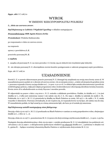 Sygn. akt: I C 108/10 WYROK W IMIENIU RZECZYPOSPOLITEJ POLSKIEJ L., dnia 22 czerwca 2010r. Sąd Rejonowy w Lubinie I Wydział Cywilny w składzie następującym: Przewodniczący: SSR Agata Kawa-Jerka Protokolant: Wioletta Stabiszewska po rozpoznaniu w dniu 22 czerwca 2010r. na rozprawie sprawy z powództwa J. Z. przeciwko pozwanej N. Z. o zapłatę I. zasądza od pozwanej N. Z. na rzecz powoda J. Z. kwotę 135,00 złotych (sto trzydzieści pięć złotych); II. nie obciąża pozwanej N. Z. obowiązkiem zwrotu kosztów postępowania w zakresie przegranej części powództwa. Sygn. akt I C 108/10 UZASADNIENIE Powód J. Z. w pozwie skierowanym przeciw pozwanej N. Z. domagał się zasądzenia na swoją rzecz kwoty 2000 zł. W uzasadnieniu pozwu podał, że w okresie od czerwca 2009 r. do 22 sierpnia 2009 r., a także od sierpnia do grudnia 2009 r. pozwana wypasała 2 krowy na jego działce nr (...) o pow. 0,21 a w S. i w efekcie łąka została zdewastowana i powód nie zrobił drugiego pokosu, a łąka jest objęta programem rolno-środowiskowym i obowiązują określone terminy koszenia. Kwota 2000 zł to odszkodowanie za straty fizyczne i moralne powoda. W odpowiedzi na pozew z dnia 1.04.2010 r. N. Z. wniosła o oddalenie powództwa. Podała, że działka nr (...) to jest działka nr (...) tylko jest zmieniony numer i nie należy ona do J. Z.. Do 1992 r. działka ta należała do matki J. M.. Podniosła, że w 1977 r. M. Z. (1) przeniosła tę działkę na Skarb Państwa za rentę. Od 1977 r. do 1986 r. N. Z. miała wszystko w dzierżawie. Pozwana oświadczyła, że nie wypiera się, że wypasała krowy na tej łące, ale należy ona do niej. W uzasadnieniu podała, że Sąd uznał ją za winną zniszczenia łąki, ale kara 50 zł została jej umorzona. Sąd Rejonowy ustalił następujący stan faktyczny: Decyzją z dnia 15.02.1977 r. M. Z. (1) przekazała na Skarb Państwa w zamian za rentę gospodarstwo rolne, obejmujące działki nr (...) (Kw nr (...)). Decyzją z dnia 20.12.1977 r. pozostawiono M. Z. (1) prawo do dożywotniego użytkowania działki nr (...) o pow. 0,50 ha. Następnie decyzją administracyjną z dnia 25.09.1992 r. została przekazana M. Z. (1) nieodpłatnie (na podstawie art. 118 ustawy z 20.12.1990 r. o ubezpieczeniu społecznym rolników) na własność działka nr (...) położona w obrębie wsi S., gmina R. – będąca wcześniej własnością Skarbu Państwa w użytkowaniu dożywotnim M. Z. (1). Postanowieniem z dnia 08.04.1994 r. Sad Rejonowy w Lubinie w sprawie I Ns 87/94 uznał, że spadek po M. Z. (1) nabył w całości na podstawie testamentu z dnia (...) syn J. Z.. Aktem notarialnym z dnia 12.12.2007 r. M. Z. (2) i N. Z. darowali synowi D. Z. działki objęte księgą wieczystą nr (...) – nie było wśród nich działki nr (...). Darowali mu również udział ½ w działce nr (...) położonej w S. o nr KW (...). Od czerwca do grudnia 2009 r. N. Z. wypasała dwie krowy na działce nr (...) w S. – dwa - trzy razy w tygodniu. Łąka ta jest objęta programem rolno-środowiskowym, co oznacza, że obowiązują na niej określone terminy koszenia. W czasie wypasania krów przypadał drugi pokos, jednak krowy pozwanej skonsumowały trawę i powód nie przeprowadził drugiego pokosu. Działka (...) ma powierzchnię 50 arów, jest w części 21 arów łąką rolniczą, a 29 arów to grunt orny. W momencie nabycia jej przez powoda była na działce zasiana trawa, J. Z. trawy nie dosiewał. Wczesną wiosną 2009 r. powód nawoził łąkę polifoską, w ilości 100 kg za kwotę 250 zł . Nawożenie odbywało się przy pomocy ciągnika, na paliwo powód przeznaczył około 20 zł. Powód powinien wykonać z łąki dwa pokosy. Pierwszy przeprowadził w lipcu 2009 r. Trawę pozyskaną z tego pokosu powód przekazał sąsiadowi nieodpłatnie. Do łąki powód otrzymuje dopłaty z programu rolno-środowiskowego. Na skutek wypasania krów powodowi nie zostały obniżone dopłaty. Działka nr (...) o pow. 0,5 ha położona w obrębie wsi S. gm. R. jest własnością J. Z.. Dla działki prowadzona jest księga wieczysta KW nr (...). Dowód: - akta księgi wieczystej (...); - kopia postanowienia Sądu Rejonowego w Lubinie z dnia 08.04.1994 r., k. 25, - akt notarialny z dnia 12.12.2007 r., k. 27-28, - decyzja z dnia 25.09.1992 r., k. 31 i k. 40, , - Decyzja z dnia 15.02.1977 r., k. 41, - decyzja z dnia 20.12.1977 r., k. 42, - informacja ze Starostwa Powiatowego w L. z dnia 16.06.2010 r., k. 47, - wypis z rejestru gruntów z dnia 14.06.2010 r., k. 50 wraz z wyrysem mapy ewidencyjnej, k. 51, - materiał poglądowy z widokiem krów w aktach SR w Lubinie o sygn. II W 70/10, k. 14-16, - częściowo zeznania świadka I. Z., k. 33, - zeznania świadka M. S., k. 33-odwrót, - przesłuchanie J. Z., k. 33-34, - częściowo przesłuchanie N. Z., k. 34. Wyrokiem z dnia 07.01.2010 r. , który uprawomocnił się 14.01.2010 r. w sprawie II W 70/10 Sąd Rejonowy w Lubinie skazał N. Z. na karę nagany za to, że w okresie od czerwca 2009 r. do 22.08.2009 r. w S. wypasała 2 krowy na działce nr (...) należącej do J. Z., czym działała na jego szkodę, tj. za wykroczenie z art. 151 § 1 kodeksu wykroczeń. Dowód: - wyrok z dnia 07.01.2010 r. II W 70/10 z zarządzeniem o prawomocności, k. 42 i 49 akt II W 70/10. Sąd Rejonowy zważył, co następuje: Powództwo częściowo zasługuje na uwzględnienie. N. Z. przyznała, że w 2009 r. wypasała krowy na działce nr (...) w S.. Ta kwestia nie była miedzy stronami sporna. Pozwana broniła się argumentem, że działka ta nie stanowi własności J. Z.. Jednocześnie starała się wykazać, że działka ta była własnością jej i jej męża M. Z. (2), a oni darowali ją synowi D. Z.. Twierdzenia pozwanej, co do właściciela działki nr (...) nie są zgodne ze stanem faktycznym. Zarówno z księgi wieczystej (...), jak i z dokumentów przedkładanych przez pozwaną w toku postępowania w postaci postanowienia Sądu Rejonowego w Lubinie z
