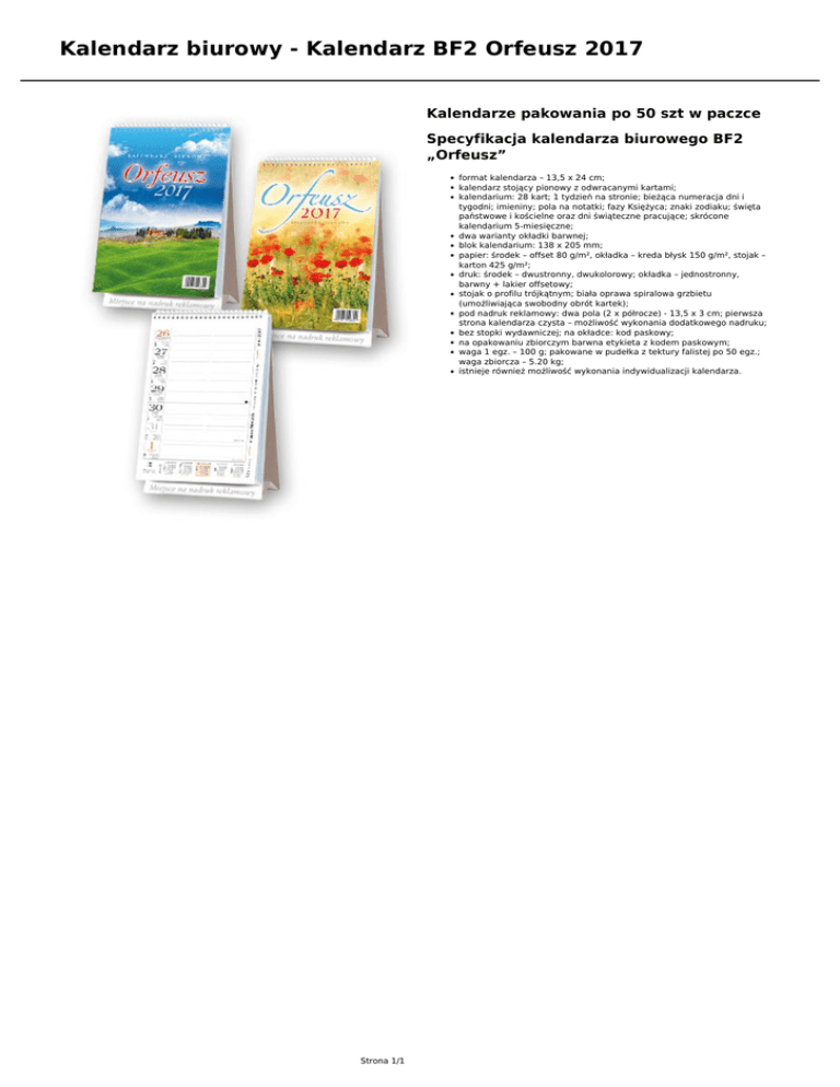 Kalendarz biurowy - Kalendarz BF2 Orfeusz 2017 Kalendarze pakowania po 50 szt w paczce Specyfikacja kalendarza biurowego BF2 „Orfeusz” format kalendarza – 13,5 x 24 cm; kalendarz stojący pionowy z odwracanymi kartami; kalendarium: 28 kart; 1 tydzień na stronie; bieżąca numeracja dni i tygodni; imieniny; pola na notatki; fazy Księżyca; znaki zodiaku; święta państwowe i kościelne oraz dni świąteczne pracujące; skrócone kalendarium 5-miesięczne; dwa warianty okładki barwnej; blok kalendarium: 138 x 205 mm; papier: środek – offset 80 g/m², okładka – kreda błysk 150 g/m², stojak – karton 425 g/m²; druk: środek – dwustronny, dwukolorowy; okładka – jednostronny, barwny + lakier offsetowy; stojak o profilu trójkątnym; biała oprawa spiralowa grzbietu (umożliwiająca swobodny obrót kartek); pod nadruk reklamowy: dwa pola (2 x półrocze) - 13,5 x 3 cm; pierwsza strona kalendarza czysta – możliwość wykonania dodatkowego nadruku; bez stopki wydawniczej; na okładce: kod paskowy; na opakowaniu zbiorczym barwna etykieta z kodem paskowym; waga 1 egz. – 100 g; pakowane w pudełka z tektury falistej po 50 egz.; waga zbiorcza – 5.20 kg; istnieje również możliwość wykonania indywidualizacji kalendarza. Strona 1/1 Powered by TCPDF (www.tcpdf.org)