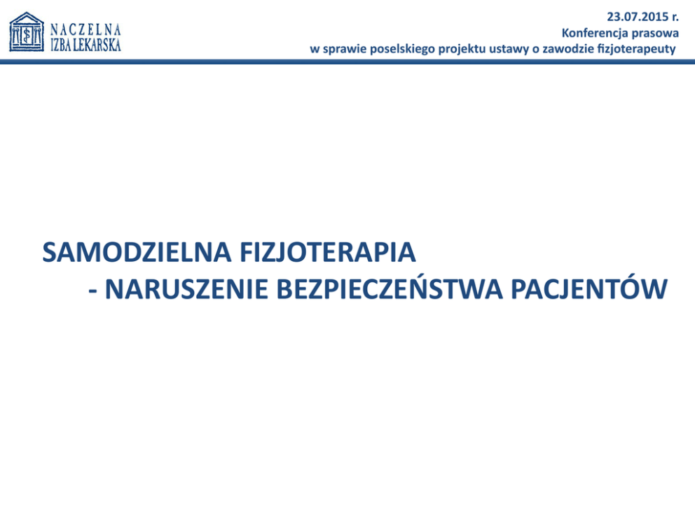 23.07.2015 r. Konferencja prasowa w sprawie poselskiego projektu ustawy o zawodzie fizjoterapeuty SAMODZIELNA FIZJOTERAPIA - NARUSZENIE BEZPIECZEŃSTWA PACJENTÓW rocznica projektu ustawy o zawodzie fizjoterapeuty 23 lipca 2014 roku - projekt wpływa do Sejmu RP 2014 23 lipca 15 grudnia Projekt wpływa do Sejmu Projekt zostaje skierowany do I czytania w komisjach 2015 19 marca 16 czerwca 3 lipca 7 lipca 15 lipca Pierwsze czytanie w komisjach Praca w podkomisji po pierwszym czytaniu 15 lipca Zakończenie prac podkomisji 21 lipca Sprawozdanie podkomisji Nagłe przyspieszenie prac 2014 23 lipca 15 grudnia 2015 2014 Projekt wpłynął do sejmu Projekt zostaje skierowany do I czytania w komisjach 1 grudnia 2015 30 stycznia 19 marca 16 czerwca 3 lipca 7 lipca 15 lipca Projekt wpływa do biura NIL Stanowisko Prezydium NRL Pierwsze czytanie w komisjach Praca w podkomisji po pierwszym czytaniu 6 lipca 10 lipca 15 lipca Zakończenie prac podkomisji 21 lipca Sprawozdanie podkomisji 17 lipca List Prezesa NRL/oburzający sposób legislacji Stanowisko Prezydium NRL List Prezesa NRL/prośba o wstrzymanie prac Nagłe przyspieszenie prac 16 czerwca 2015 r. - 2 godziny rozpatrzono art. 1-8 3 lipca 2015 r. – 20 minut Wiceminister Zdrowia Igor Radziewicz-Winnicki zgasza poprawki do projektu ustawy, liczące łącznie 89 stron (sam projekt liczy 57 stron)! Przewodniczący Podkomisji Dariusz Dziadzio mobilizuje wszystkich członków Podkomisji do zapoznania się z poprawkami do dnia 7 lipca 2015 r. (4 dni, łącznie z weekendem) i zaopiniowania ich do tego dnia. Nagłe przyspieszenie prac 7 lipca – 1,5 godziny dyskusja ogólna Pani Poseł Prof. Józefa Hrynkiewicz zgłasza poprawki (39 stron) 14 lipca – 3,5 godziny rozpatrzono art. 9-13 Opinię do projektu zgłaszało m. in. Polskie Towarzystwo Rehabilitacji Medycznej, a także – krytyczne uwagi i poprawki zgłasza Pani Poseł Józefa Hrynkiewicz Poprawki odrzucone. 15 lipca – 10,5 godziny przyjęto sprawozdanie Błędy w projekcie ustawy i w procesie legislacyjnym: ! Brak opisanego procesu uzyskiwania zawodu fizjoterapeuty !Brak pełnego opisu zasad wykonywania zawodu fizjoterapeuty i wykazu czynności zawodowych w uzależnieniu od kompetencji ! Brak opinii ministra zdrowia na temat projektu ustawy ! Brak opinii biura analiz sejmowych ani szefa kancelarii Sejmu RP potwierdzających, że ustawa jest zgodna z prawem Unii Europejskiej ! Niedopuszczalne – w świetle prawa UE – uwolnienie zawodu uznanego za zawód paramedyczny ! konflikt interesów: pan poseł Dariusz Dziadzio – przedstawiciel wnioskodawców i jednocześnie przewodniczący podkomisji rozpatrującej ten projekt W obecnym stanie prawnym za leczenie chorego odpowiada lekarz a świadczenia zdrowotne w rehabilitacji leczniczej realizuje zespół wielu specjalistów, których działania powinien koordynować lekarz specjalista rehabilitacji medycznej ponieważ do jego kompetencji należy postępowanie diagnostyczno-lecznicze Dz.U. 1997 Nr 28 poz. 152 USTAWA z dnia 5 grudnia 1996 r. o zawodach lekarza i lekarza dentysty Rozdział 1 Przepisy ogólne Art. 2. 1. Wykonywanie zawodu lekarza polega na udzielaniu przez osobę posiadającą wymagane kwalifikacje, potwierdzone odpowiednimi dokumentami, świadczeń zdrowotnych, w szczególności: • badaniu stanu zdrowia, • rozpoznawaniu chorób i zapobieganiu im, • leczeniu i rehabilitacji chorych, • udzielaniu porad lekarskich, • a także wydawaniu opinii i orzeczeń lekarskich. Jak dalece może być samodzielny fizjoterapeuta, który nie ma pełnej wiedzy na temat stanu zdrowia chorego? (1) Zapisano w ustawie, że „Fizjoterapeuta ma prawo wglądu do dokumentacji medycznej pacjenta oraz do uzyskania od podmiotu udzielającego świadczeń zdrowotnych pełnej informacji w rozumieniu przepisów ustawy z dnia 6 listopada 2008 r. o prawach pacjenta i Rzeczniku Praw Pacjenta (Dz. U. z 2012 r. poz. 159, z późn. zm.) o stanie zdrowia pacjenta, rozpoznaniu, proponowanych metodach diagnostycznych, leczniczych, rehabilitacyjnych, zapobiegawczych i dających się przewidzieć następstwach podejmowanych działań, w zakresie niezbędnym do udzielanych przez siebie świadczeń zdrowotnych. Jak dalece może być samodzielny fizjoterapeuta, który nie ma pełnej wiedzy na temat stanu zdrowia chorego? (2) Oczekiwanie tak daleko idących informacji od lekarza wskazuje jasno na brak możliwości podejmowania się przez fizjoterapeutę samodzielnej kwalifikacji do zabiegów fizjoterapeutycznych. To tzw. „samodzielne” kwalifikowanie przez fizjoterapeutę na zabiegi fizjoterapeutyczne spowoduje, że po uchwaleniu ustawy w procedowanej wersji, pacjent będzie pokonywał dłuższą drogę, bo w odwróconym kierunku; zamiast od lekarza do fizjoterapeuty – będzie wędrował od fizjoterapeuty do lekarza – po informacje o stanie zdrowia i z powrotem do fizjoterapeuty. Zwiększenie dostępności do wysokiej jakości świadczeń i zweryfikowanie kompetencji fizjoterapeutów ? (1) Fałszywe są nadzieje na zwiększenie dostępności do wysokiej jakości świadczeń z zakresu fizjoterapii, oraz zapowiedzi weryfikacji kompetencji fizjoterapeutów, które ma spowodować ustawa w obecnej formie. W dniu wejścia w życie ustawy prawo wykonywania zawodu otrzymają wszyscy fizjoterapeuci – wymienieni w Rozdz. 3. Art. 14. ust. 3.: absolwenci szkół policealnych publicznych lub niepublicznych o uprawnieniach szkoły publicznej, którzy uzyskali tytuł zawodowy technika fizjoterapii, absolwenci AWF na kierunku wychowanie fizyczne, który uzyskał tytuł magistra na tym kierunku oraz ukończył 3-miesięczny kurs specjalizacyjny z rehabilitacji zgodnie z przepisami Głównego Komitetu Kultury Fizycznej i Sportu, oraz osoby, które uzyskały tytuł zawodowy fizjoterapeuty oraz zdały Państwowy Egzamin Fizjoterapeutyczny. Zwiększenie dostępności do wysokiej jakości świadczeń i zweryfikowanie kompetencji fizjoterapeutów ? (1) Jeszcze w 2012 roku Konsultant