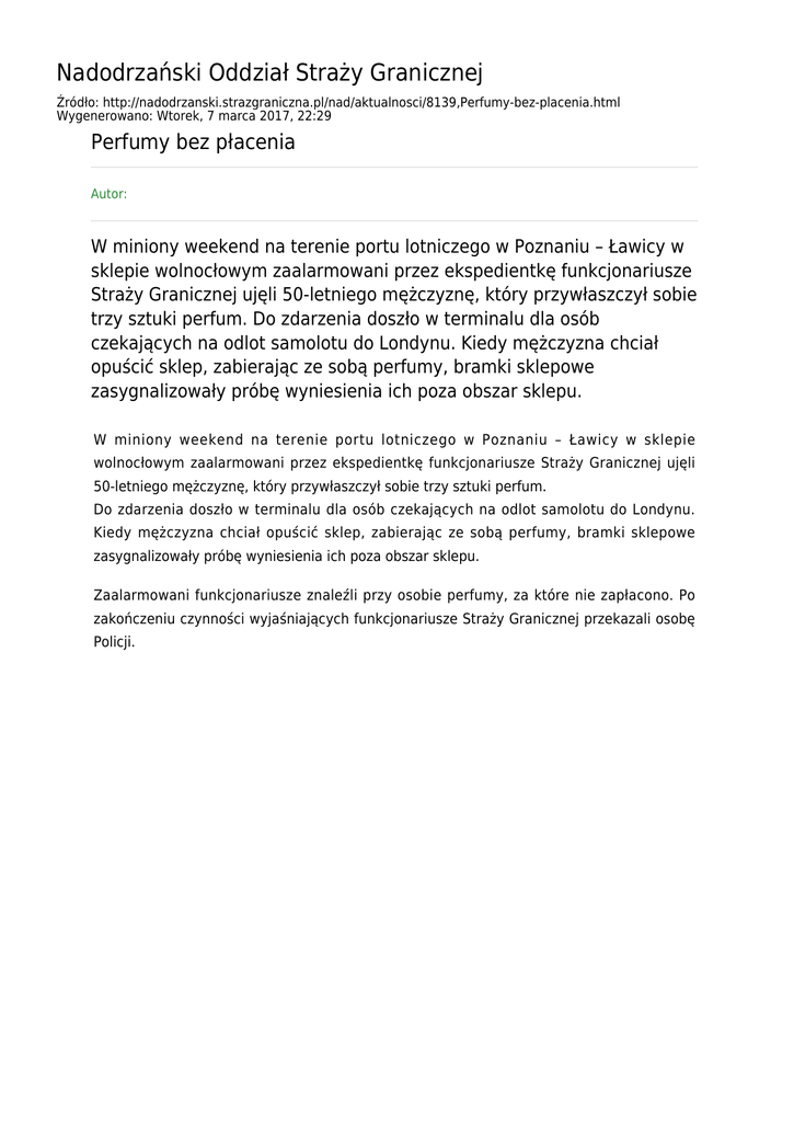 Nadodrzański Oddział Straży Granicznej Źródło: http://nadodrzanski.strazgraniczna.pl/nad/aktualnosci/8139,Perfumy-bez-placenia.html Wygenerowano: Wtorek, 7 marca 2017, 22:29 Perfumy bez płacenia Autor: W miniony weekend na terenie portu lotniczego w Poznaniu – Ławicy w sklepie wolnocłowym zaalarmowani przez ekspedientkę funkcjonariusze Straży Granicznej ujęli 50-letniego mężczyznę, który przywłaszczył sobie trzy sztuki perfum. Do zdarzenia doszło w terminalu dla osób czekających na odlot samolotu do Londynu. Kiedy mężczyzna chciał opuścić sklep, zabierając ze sobą perfumy, bramki sklepowe zasygnalizowały próbę wyniesienia ich poza obszar sklepu. W miniony weekend na terenie portu lotniczego w Poznaniu – Ławicy w sklepie wolnocłowym zaalarmowani przez ekspedientkę funkcjonariusze Straży Granicznej ujęli 50-letniego mężczyznę, który przywłaszczył sobie trzy sztuki perfum. Do zdarzenia doszło w terminalu dla osób czekających na odlot samolotu do Londynu. Kiedy mężczyzna chciał opuścić sklep, zabierając ze sobą perfumy, bramki sklepowe zasygnalizowały próbę wyniesienia ich poza obszar sklepu. Zaalarmowani funkcjonariusze znaleźli przy osobie perfumy, za które nie zapłacono. Po zakończeniu czynności wyjaśniających funkcjonariusze Straży Granicznej przekazali osobę Policji.