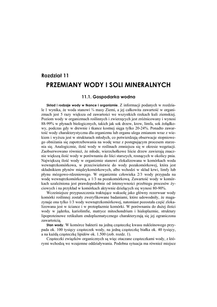 Rozdział 11 PRZEMIANY WODY I SOLI MINERALNYCH 11.1. Gospodarka wodna Skład i rodzaje wody w tkance i organizmie. Z informacji podanych w rozdziale 1 wynika, że woda stanowi ¾ masy Ziemi, a jej całkowita zawartość w organizmach jest 5 razy większa od zawartości we wszystkich rzekach kuli ziemskiej. Poziom wody w organizmach roślinnych i zwierzęcych jest zróżnicowany i wynosi 88-99% w płynach biologicznych, takich jak sok drzew, krew, limfa, sok żołądkowy, podczas gdy w drewnie i tkance kostnej sięga tylko 20-24%. Ponadto zawartość wody charakterystyczna dla organizmu lub organu ulega zmianom wraz z wiekiem i wyższa jest w strukturach młodych, co potwierdzają obserwacje stopniowego obniżania się zapotrzebowania na wodę wraz z postępującym procesem starzenia się. Analogicznie, ilość wody w roślinach zmniejsza się w okresie wegetacji. Zaobserwowano również, że młode, wierzchołkowe liście drzew zawierają znacznie większą ilość wody w porównaniu do liści starszych, rosnących w okolicy pnia. Największą ilość wody w organizmie stanowi zlokalizowana w komórkach woda wewnątrzkomórkowa, w przeciwieństwie do wody pozakomórkowej, która jest składnikiem płynów międzykomórkowych, albo wchodzi w skład krwi, limfy lub płynu mózgowo-rdzeniowego. W organizmie człowieka 2/3 wody przypada na wodę wewnątrzkomórkową, a 1/3 na pozakomórkową. Zawartość wody w komórkach uzależniona jest prawdopodobnie od intensywności przebiegu procesów życiowych i na przykład w komórkach aktywnie dzielących się wynosi 80-90%. Wcześniejsze przypuszczenia traktujące wakuolę jako główny rezerwuar wody komórki roślinnej zostały zweryfikowane badaniami, które udowodniły, że magazynuje ona tylko 1/3 wody wewnątrzkomórkowej, natomiast pozostała część zlokalizowana jest w ściance i w protoplazmie komórki. W porównaniu do dużej ilości wody w jąderku, kariolimfie, matryce mitochondrium i hialoplazmie, struktury lipoproteinowe retikulum endoplazmatycznego charakteryzują się jej ograniczona zawartością. Stan wody. W komórce bakterii na jedną cząsteczkę kwasu nukleinowego przypada ok. 100 tysięcy cząsteczek wody, na jedną cząsteczkę białka ok. 40 tysięcy, a na każdą cząsteczkę lipidów ok. 1.500 (zob. rozdz. 1). Cząsteczki związków organicznych są więc otaczane cząsteczkami wody, z którymi wchodzą we wzajemne oddziaływania. Podobna sytuacja ma również miejsce 354 Podstawy biochemii w przypadku kationów i anionów związków nieorganicznych oraz oddziaływań cząsteczek wody pomiędzy sobą. Cząsteczki wody mają budowę polarną o stałym momencie dipolowym, w wyniku czego dochodzi do ich wzajemnej orientacji i utworzenia charakterystycznego systemu strukturalnego. Oddziaływaniu pomiędzy jonem a cząsteczką wody, tworzącą wokół niego otoczkę, towarzyszą zmiany jej struktury wywołane efektem przejścia ze stanu uporządkowanego w nieuporządkowany. Ponowne przejście prowadzące do mniejszego uporządkowania cząsteczek wody wokół jonu od uporządkowania w obrębie samej cząsteczki prowadzi do wytworzenia stanu ujemnej hydratacji. Charakteryzuje się ona większą ruchliwością cząsteczek wody w pobliżu jonu. Ujemna hydratacja dotyczy przede wszystkim jonów K+, Rb+, Cs+, Cloraz I-, natomiast dodatnia jonów Na+, Li+, Ca2+ oraz Ba2+. Podobne zjawiska zachodzą z udziałem kationów i anionów związków organicznych, w tym także ich makrocząsteczek. W związku z tym znaczna ilość cząsteczek wody komórkowej wiązana jest dzięki procesowi hydratacji. Istotną rolę w kształtowaniu struktury cząsteczki wody i jej oddziaływań z mikro- i makrocząsteczkami odgrywają wiązania wodorowe, dzięki którym część wody komórkowej przekształcana zostaje w formę połączoną. Przyjmuje się, że cząsteczki wody zlokalizowane w pobliżu odcinków hydrofobowych makrocząsteczek tworzą układy odpowiadające strukturom przypominającym lód (płatki śniegu), co sprzyja powstawaniu struktur trzeciorzędowych szeregu biopolimerów, a w szczególności białek. Charakterystyczne dla każdej komórki jest ponadto przenikanie cząsteczek wody do powstających układów cząsteczek oraz ich kompleksów. Ze względu na charakter oddziaływań wodę tę zalicza się do kategorii wody związanej. Powyższe zjawisko dotyczące przejścia cząsteczki wody ze stanu wolnego w stan związany i wynikające z niego konsekwencje dla funkcjonowania określonych struktur komórki na poziomie molekularnym precyzują wyniki badań, w których wykazano, że rybosomy zawierające wodę cechuje około 2,7 raza większa aktywność od odpowiadających im struktur znajdujących się w stanie odwodnionym. Ponadto błony białkowo-lipidowe mitochondrium, lizosomów czy retikulum endoplazmatycznego izolują przestrzenie komórkowe zawierające wodę wraz z innymi związkami. Podobną rolę pełni otoczka jądrowa. Woda obecna w składzie struktur subkomórkowych nazywana jest wodą unieruchomioną (immobilizowaną). Można wyróżnić dwie kategorie cząsteczek wody występujących w organizmie: wodę występującą w stanie wolnym oraz wodę związaną, która zależnie od siły wiązania może być słabo związana (woda warstw dyfuzyjnych powłok hydratacyjnych, woda zestrukturalizowana, występująca jako rozpuszczalnik o temperaturze krzepnięcia bliskiej 0oC) lub mocno związana (woda pierwszej sfery koordynacyjnej otaczająca cząsteczkę substancji rozpuszczonej będąca nie tylko rozpuszczalnikiem o temperaturze krzepnięcia równej -25oC, a nawet -269oC). W wyniku zachodzących na terenie komórki procesów związanych z usuwaniem zbędnych produk- Rozdział 11. Przemiany wody i soli mineralnych 355 tów przemian metabolicznych oraz regulowanym przez określone białka, włączaniem niezbędnych komórce substancji, woda wewnątrzkomórkowa stale przechodzi ze stanu uporządkowanego w stan nieuporządkowa