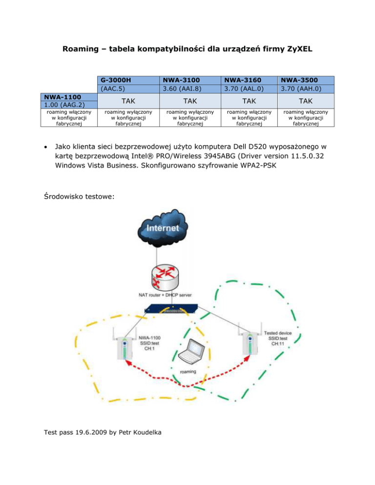 Roaming – tabela kompatybilności dla urządzeń firmy ZyXEL G-3000H (AAC.5) NWA-1100 1.00 (AAG.2) roaming włączony w konfiguracji fabrycznej • NWA-3100 3.60 (AAI.8) NWA-3160 3.70 (AAL.0) NWA-3500 3.70 (AAH.0) TAK TAK TAK TAK roaming wyłączony w konfiguracji fabrycznej roaming wyłączony w konfiguracji fabrycznej roaming włączony w konfiguracji fabrycznej roaming włączony w konfiguracji fabrycznej Jako klienta sieci bezprzewodowej uŜyto komputera Dell D520 wyposaŜonego w kartę bezprzewodową Intel® PRO/Wireless 3945ABG (Driver version 11.5.0.32 Windows Vista Business. Skonfigurowano szyfrowanie WPA2-PSK Środowisko testowe: Test pass 19.6.2009 by Petr Koudelka