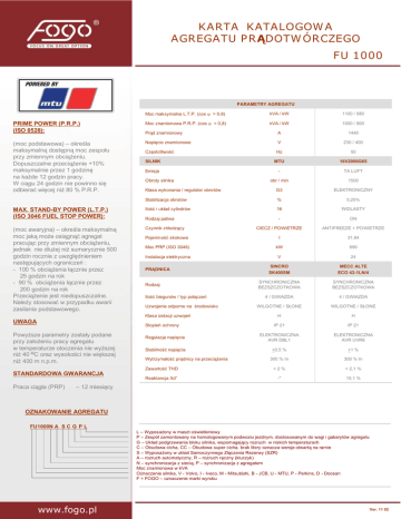 KARTA KATALOGOWA AGREGATU PR DOTWÓRCZEGO FU 1000 PARAMETRY AGREGATU Moc maksymalna L.T.P. (cos = 0,8) kVA / kW 1100 / 880 PRIME POWER (P.R.P.) (ISO 8528): Moc znamionowa P.R.P. (cos = 0,8) kVA / kW 1000 / 800 Pr d znamionowy A 1440 (moc podstawowa) – okre la maksymaln dost pn moc zespo u przy zmiennym obci eniu. Dopuszczalne przeci enie +10% maksymalnie przez 1 godzin na ka de 12 godzin pracy. W ci gu 24 godzin nie powinno si odbiera wi cej ni 80 % P.R.P. Napi cie znamionowe V 230 / 400 Cz stotliwo Hz 50 SILNIK MTU 16V2000G65 Emisja - TA LUFT obr / min 1500 Klasa wykonania / regulator obrotów G3 ELEKTRONICZNY Stabilizacja obrotów % 0,25% Ilo 16 WIDLASTY - ON CIECZ / POWIETRZE ANTIFREEZE + POWIETRZE MAX. STAND-BY POWER (L.T.P.) (ISO 3046 FUEL STOP POWER): (moc awaryjna) – okre la maksymaln moc jak mo e osi gn agregat pracuj c przy zmiennym obci eniu, jednak nie d ej ni sumarycznie 500 godzin rocznie z uwzgl dnieniem nast puj cych ogranicze : - 100 % obci enia cznie przez 25 godzin na rok - 90 % obci enia cznie przez 200 godzin na rok Przeci enie jest niedopuszczalne. Nale y stosowa w przypadku awarii zasilania podstawowego. Obroty silnika i uk ad cylindrów Rodzaj paliwa Czynnik ch odz cy l 31.84 Moc PRP (ISO 3046) Pojemno skokowa kW 890 Instalacja elektryczna V 24 SINCRO SK400SM MECC ALTE ECO 43-1LN/4 SYNCHRONICZNA BEZSZCZOTKOWA SYNCHRONICZNA BEZSZCZOTKOWA 4 / GWIAZDA 4 / GWIAZDA WILGOTNE / S ONE WILGOTNE / S ONE H H IP 21 IP 21 ELEKTRONICZNA AVR DBL1 ELEKTRONICZNA AVR UVR6 +0,5 % +1 % 300 % In 300 % In <2% < 2,1 % -* 10,1 % PR DNICA Rodzaj Ilo biegunów / typ po cze Uzwojenie odporne na rodowisko Klasa izolacji uzwoje UWAGA Stopie ochrony Powy sze parametry zosta y podane przy za eniu pracy agregatu w temperaturze otoczenia nie wy szej ni 40 OC oraz wysoko ci nie wi kszej ni 400 m n.p.m. Regulacja napi cia Stabilno Wytrzyma Zawarto STANDARDOWA GWARANCJA Praca ci a (PRP) napi cia pr dnicy na przeci THD Reaktancja Xd” enia – 12 miesi cy OZNAKOWANIE AGREGATU FU1000N A S C G P L L – Wyposa ony w maszt o wietleniowy P – Zespó zamontowany na homologowanym podwoziu jezdnym, dostosowanym do wagi i gabarytów agregatu G – Uk ad podgrzewania bloku silnika, wspomagaj cy rozruch w niskich temperaturach C – Obudowa cicha, CC – Obudowa super cicha, brak litery oznacza wersje otwart na ramie S – Wyposa ony w uk ad Samoczynnego Z czenia Rezerwy (SZR) A – rozruch automatyczny, R – rozruch r czny (kluczyk) N – synchronizacja z sieci , P – synchronizacja z agregatem Moc znamionowa w kVA Oznaczenie silnika, V - Volvo, I - Iveco, M - Mitsubishi, B - JCB, U - MTU, P - Perkins, D - Doosan F = FOGO – oznaczenie marki wyrobu www.fogo.pl Ver. 11 02 FU 1000 WYTYCZNE INSTALACYJNE Sposób odbioru mocy zaciski rubowe mm 5 x 16 Przewody odbioru mocy gi tka linka mm2 4x5x240( 30mb) Przewody automatyki SZR gi tka linka mm2 7x1,5 ( 30mb) Przewody potrzeb w asnych (grza ka, adowarka) gi tka linka mm2 3x2,5 ( 30mb) Przewody powy ej 30 mb – do uzgodnienia z dzia em technicznym. *** UWAGA: Za w ciwy dobór przekrojów przewodów odpowiada projektant ** Rozmiar szafy SZR (dolne podej cie kablowe) mm wys./szer./g . 1800/900/500 (stoj ca) rednica kolektora wydechu silnika mm - rednica wydechu (max. 7mb, 4 kolana 90st.) mm - rednica wydechu (max. 15mb, 4 kolana 90st.) mm - DO ZABUDOWY Wymiary [m] ./szer./wys. Masa agregatu Pojemno paliwa zbiornika Czas pracy przy 100% obci enia 4910x2100x2520 kg 7670 l 1400 h 5,9 Wysoko ch odnicy mm - Szeroko ch odnicy mm - ch odnicy a Odleg od pod mm - Powierzchnia wyrzutni powietrza m2 - Powierzchnia czerpni powietrza m2 - Powierzchniowe ci nienie akustyczne dB 129** ./szer./wys. Masa agregatu Pojemno zbiornika paliwa Czas pracy przy 100% obci enia Powierzchniowe ci nienie akustyczne 6000x2100x2860 kg 9800 l 1400 h 5,9 dB 108*** Fotografie przyk adowe EKSPLOATACJA Rodzaj oleju - Rimula R3X Ilo L 102 oleju w uk adzie smarowania Zu ycie oleju % 0,5 Rh pierwszy po 100, nast pne co 500 Rodzaj p ynu ch odz cego - Antifreeze Ilo L 200 - 1000 / 2 Okres pomi dzy wymianami oleju p ynu ch odz cego Okres pomi dzy wymianami p ynu Pojemno Zgodno akumulatora rozruchowego paliwa z norm Ah 2x225 - EN 590 238,2 Zu ycie paliwa100% l/h Zu ycie paliwa 75% l/h 171 Zu ycie paliwa 50% l/h 117 Wymiana filtrów paliwa Rh 500 Wymiana filtrów oleju Rh 500 Wytyczne p yty fundamentowej (p yta zbrojona) Ver. 11 02 Dane zawarte w karcie katalogowej mog ulec zmianie - silnik - pr dnica - bateria akumulatorów - instalacja elektryczna - zbiornik paliwa wraz z instalacj - wibroizolatory - kompensator wydechu - t umik - p yny eksploatacyjne (p yn ch odz cy + olej silnikowy, bez paliwa) - szafa potrzeb w asnych i odbioru mocy - zabezpieczenie pr dnicy (wy cznik mocy) - mikroprocesorowy uk ad sterowania - wska niki parametrów elektrycznych i mechanicznych - przycisk wy cznika bezpiecze stwa - sygna akustyczny awarii WERSJE: ZABUDOWANY Wymiary WYPOSA ENIE STANDARDOWE: ./szer. R - do zabudowy, sterowanie r czne * wyposa enie standardowe AG - do zabudowy, start automatyczny * wyposa enie standardowe + adowarka + zdolno przyj cia sygna u zdalnego startu ASG - do zabudowy, start automatyczny, SZR * wyposa enie standardowe + adowarka + zdolno przyj cia sygna u zdalnego startu + SZR (oddzielna szafa z w asnym sterowaniem) RC - zabudowany, sterowanie r czne * wyposa enie standardowe + obudowa atmosferyczna ACG - zabudowany, sterowanie automatyczne * wyposa enie standardowe + obudowa atmosferyczna + adowarka + zdolno przyj cia sygna u zdalnego startu ASCG - zabudowany, start automatyczny, SZR * wyposa enie standardowe + obudowa atmosferyczna + adowarka + zdolno przyj cia sygna u zdalnego start, + SZR (oddzielna szafa z w asnym sterowaniem) OPCJE DODATKOWE: - zewn trzny zbiornik paliwa - synchronizacja - uk ad wentylacji - uk ad odprowadzenia spalin - zabezpieczenie ró nicowo-pr dowe - wykonanie agregatu w innej wersji napi ciowej - wykonanie zewn trzne uk adu SZR - apacz iskier - monitoring - p yta 