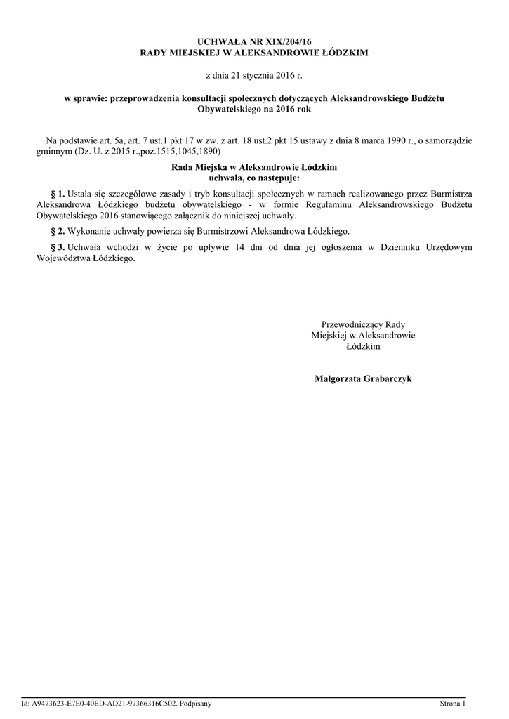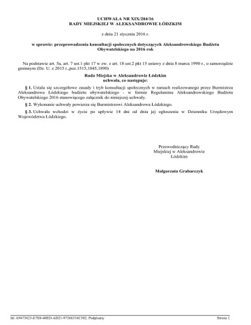 UCHWAŁA NR XIX/204/16 RADY MIEJSKIEJ W ALEKSANDROWIE ŁÓDZKIM z dnia 21 stycznia 2016 r. w sprawie: przeprowadzenia konsultacji społecznych dotyczących Aleksandrowskiego Budżetu Obywatelskiego na 2016 rok Na podstawie art. 5a, art. 7 ust.1 pkt 17 w zw. z art. 18 ust.2 pkt 15 ustawy z dnia 8 marca 1990 r., o samorządzie gminnym (Dz. U. z 2015 r.,poz.1515,1045,1890) Rada Miejska w Aleksandrowie Łódzkim uchwała, co następuje: § 1. Ustala się szczegółowe zasady i tryb konsultacji społecznych w ramach realizowanego przez Burmistrza Aleksandrowa Łódzkiego budżetu obywatelskiego - w formie Regulaminu Aleksandrowskiego Budżetu Obywatelskiego 2016 stanowiącego załącznik do niniejszej uchwały. § 2. Wykonanie uchwały powierza się Burmistrzowi Aleksandrowa Łódzkiego. § 3. Uchwała wchodzi w życie po upływie 14 dni od dnia jej ogłoszenia w Dzienniku Urzędowym Województwa Łódzkiego. Przewodniczący Rady Miejskiej w Aleksandrowie Łódzkim Małgorzata Grabarczyk Id: A9473623-E7E0-40ED-AD21-97366316C502. Podpisany Strona 1 Załącznik do Uchwały Nr XIX/204/16 Rady Miejskiej w Aleksandrowie Łódzkim z dnia 21 stycznia 2016 r. REGULAMIN ALEKSANDROWSKIEGO BUDŻETU OBYWATELSKIEGO 2016 Postanowienia ogólne § 1. 1. Przez pojęcie budżetu obywatelskiego należy rozumieć formułę konsultacji społecznych w sprawie przeznaczenia części zarezerwowanych w budżecie Gminy Aleksandrów Łódzki środków pieniężnych na projekty wskazane przez mieszkańców. 2. Suma środków pieniężnych przeznaczonych na realizację zadań w ramach Aleksandrowskiego Budżetu Obywatelskiego 2016 wynosi 800 000 złotych w tym: 1) 600 000 zł to środki „Inwestycje infrastrukturalne”; 2) 200 000 zł to środki społeczne (miękkie)”. przeznaczone przeznaczone na na realizację realizację zadań zadań w w ramach kategorii ramach kategorii „Projekty § 2. Zgłaszanym zadaniem może być inicjatywa obywatelska, projekt inwestycyjny lub remontowy w ramach jednej z dwóch kategorii tematycznych, którego realizacja należy do zadań własnych Gminy Aleksandrów Łódzki wynikających z ustawy z dnia 8 marca 1990 r. o samorządzie gminnym: 1) „Inwestycje infrastrukturalne”; 2) „Projekty społeczne (miękkie)”. § 3. W ramach Aleksandrowskiego Budżetu Obywatelskiego 2016 nie mogą być realizowane zadania: 1) które nie zaspokajają zbiorowych potrzeb wspólnoty obejmujących zadania własne gminy, określone w szczególności w artykule 7.1 ustawy z dnia 8 marca 1990 r. o samorządzie gminnym oraz w innych ustawach; 2) których szacowany koszt poszczególnych kategorii: jednostkowej realizacji będzie wyższy niż przewidziany dla a. „Inwestycje infrastrukturalne” – 200 000 zł, b. „Projekty społeczne (miękkie)”– 50 000 zł; 3) które stoją w zagospodarowania; sprzeczności z obowiązującym miejscowym planem przestrzennego 4) których realizacja byłaby ekonomicznie nieuzasadniona ze względu na zbyt wysokie koszty utrzymania w stosunku do wartości proponowanego zadania; 5) które naruszałyby obowiązujące przepisy prawa; 6) które zakładają realizację jedynie części zadania (np. części projektowej bez środków na wykonanie). § 4. Realizacja zadań odbywać się będzie w ciągu jednego roku budżetowego z zastrzeżeniem, iż w uzasadnionych przypadkach możliwe jest wydłużenie terminu realizacji zadań na lata następne zgodnie z zasadami określonymi w ustawie o finansach publicznych. § 5. Wdrażanie Aleksandrowskiego Budżetu Obywatelskiego obejmuje następujące etapy: 1) konsultacje społeczne – zgłaszanie projektów zadań; 2) weryfikację zgłoszonych zadań; 3) głosowanie; 4) ogłoszenie wyników. Id: A9473623-E7E0-40ED-AD21-97366316C502. Podpisany Strona 1 Konsultacje społeczne - zgłaszanie projektów § 6. 1. Projekty w ramach konsultacji społecznych zgłaszać może każdy mieszkaniec Gminy Aleksandrów Łódzki, który w dniu składania projektu ukończył 16 rok życia. 2. Zgłoszeń należy dokonywać poprzez wypełnienie elektronicznego formularza dostępnego na stronie internetowej www.aleludzki.pl lub formularza tradycyjnego w jednym z punktów konsultacyjnych wskazanych w § 12 regulaminu. § 7. 1. Każdej osobie uprawnionej do zgłaszania projektów przysługuje prawo zgłoszenia tylko jednego projektu w danej kategorii (maksymalna ilość zgłoszonych projektów przez jedną osobę – 2 – po jednym w każdej z kategorii). 2. W przypadku zgłaszania projektów zadań w więcej niż jednej kategorii w punkcie konsultacyjnym zgłoszenie należy wypełnić na formularzach zbiorczych. 3. Zgłaszający projekt zadania może określić przybliżony koszt realizacji projektu według własnego oszacowania. Ostatecznej wyceny dokonuje Zespół Konsultacyjny. 4. Zgłoszenie jest ważne tylko jeśli wypełnione zostaną wszystkie obowiązkowe pola formularza. § 8. 1. Termin zgłaszania projektów oraz wzory formularzy określone zostaną w zarządzeniu Burmistrza Aleksandrowa Łódzkiego. 2. Dodatkowe informacje dotyczące zasad zgłaszania projektów można uzyskać w Wydziale Integracji i Komunikacji Społecznej Urzędu Miejskiego w Aleksandrowie Łódzkim. Dane kontaktowe dostępne są na stronie internetowej www.aleksandrow-lodzki.pl. Weryfikacja projektów zgłoszonych w ramach Konsultacji Społecznych § 9. 1. Przesłane projekty zostaną zweryfikowane przez Zespół Konsultacyjny pod względem merytorycznym, formalnym, prawnym oraz kosztów jego realizacji. 2. W zarządzeniu powołującym Zespół Konsultacyjny Burmistrz Konsultacyjnego oraz ustali wzór Karty Merytorycznej Oceny Projektu. określi zasady pracy Zespołu § 10. 1. Wyniki weryfikacji projektów zgłoszonych w ramach konsultacji społecznych zostaną podane do publicznej wiadomości przez Burmistrza Aleksandrowa Łódzkiego. Propozycje zadań otrzymają znaczniki „przyjęty” i „nieprzyjęty”. W przypadku projektów oznaczonych frazą "nieprzyjęty
